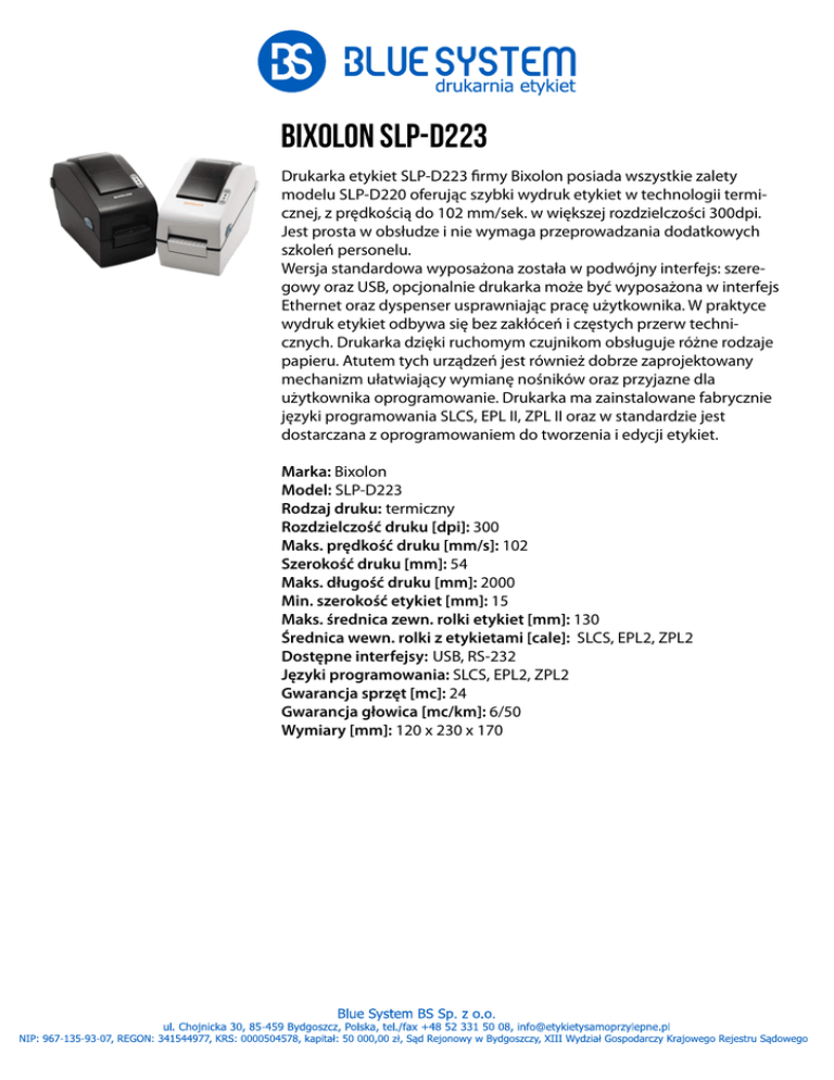 bixolon slp-d223 Drukarka etykiet SLP-D223 firmy Bixolon posiada wszystkie zalety modelu SLP-D220 oferując szybki wydruk etykiet w technologii termicznej, z prędkością do 102 mm/sek. w większej rozdzielczości 300dpi. Jest prosta w obsłudze i nie wymaga przeprowadzania dodatkowych szkoleń personelu. Wersja standardowa wyposażona została w podwójny interfejs: szeregowy oraz USB, opcjonalnie drukarka może być wyposażona w interfejs Ethernet oraz dyspenser usprawniając pracę użytkownika. W praktyce wydruk etykiet odbywa się bez zakłóceń i częstych przerw technicznych. Drukarka dzięki ruchomym czujnikom obsługuje różne rodzaje papieru. Atutem tych urządzeń jest również dobrze zaprojektowany mechanizm ułatwiający wymianę nośników oraz przyjazne dla użytkownika oprogramowanie. Drukarka ma zainstalowane fabrycznie języki programowania SLCS, EPL II, ZPL II oraz w standardzie jest dostarczana z oprogramowaniem do tworzenia i edycji etykiet. Marka: Bixolon Model: SLP-D223 Rodzaj druku: termiczny Rozdzielczość druku [dpi]: 300 Maks. prędkość druku [mm/s]: 102 Szerokość druku [mm]: 54 Maks. długość druku [mm]: 2000 Min. szerokość etykiet [mm]: 15 Maks. średnica zewn. rolki etykiet [mm]: 130 Średnica wewn. rolki z etykietami [cale]: SLCS, EPL2, ZPL2 Dostępne interfejsy: USB, RS-232 Języki programowania: SLCS, EPL2, ZPL2 Gwarancja sprzęt [mc]: 24 Gwarancja głowica [mc/km]: 6/50 Wymiary [mm]: 120 x 230 x 170