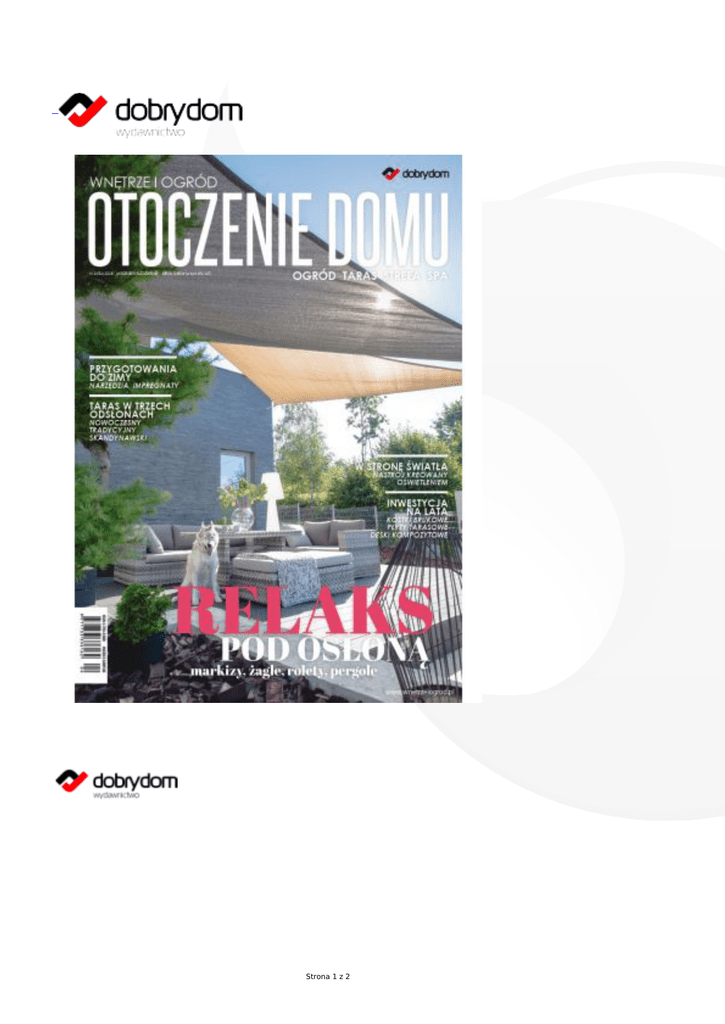 Strona 1 z 2 Bohaterem okładki jesiennego wydania magazynu OTOCZENIE DOMU jest klimatyczny taras pod żaglami. To magiczne miejsce, z którego rozpościera się malowniczy widok na miasto. Czas tu płynie jakby wolniej, to tutaj każdą wolną chwilę spędzają domownicy i wyjątkowy model Carlos, który cierpliwie pozował podczas sesji zdjęciowej. W kulminacyjnym momencie majestatycznie odwrócił się do nas plecami i wycofał w cień… zaakceptowaliśmy to, w końcu taras to miejsce relaksu… Taras to również motyw przewodni numeru. Okazuje się, że niemożliwe jest możliwe i można go zaaranżować w oryginalny sposób nawet na niewielkim balkonie. Z widokiem na zieleń i niebo żegnamy pergole, altany, markizy i wybiegając w przyszłość, już teraz planujemy sezon wiosenny. Natura stylu przybiera skrajnie opozycyjne charaktery – przyglądamy się bliżej różnorodnym stylizacjom: romantycznym, industrialnym i tradycyjnym. Odpowiednio zaaranżowane światło kreuje nastrój po zmroku. Biel nieśmiało wybija się na pierwszy plan. Podpowiadamy, z czym ją zestawiać, w efekcie czego pomimo swojej chłodnej natury staje się bardzo przytulna. Zakochani bez pamięci w naturalnej zieleni, pragniemy zatrzymać ją jak najdłużej i przenosimy z ogrodów do domu. Nie mogło zabraknąć również problematycznych tematów, wiążących się z zakupem kostki brukowej. W końcu to inwestycja na lata – polecamy dział okiem eksperta. Wszystkim, którzy drżą na samą myśl o jesiennych porządkach w ogrodzie, dedykujemy materiał poświęcony przydatnym sprzętom, które pomogą zachować piękno przydomowej zieleni w okresie jesienno-zimowym. Tymczasem w redakcji magazynu OTOCZENIE DOMU powoli żegnamy się z latem. Pogoda nie rozpieszcza. Zachęcamy więc do zabawy kolorem – wielobarwne poduchy i koce to antidotum na burą pogodę. Otuleni miękkimi pledami, przy blasku świec rozkoszujemy się ostatnimi ciepłymi wieczorami. Chwilo, trwaj! Strona 2 z 2