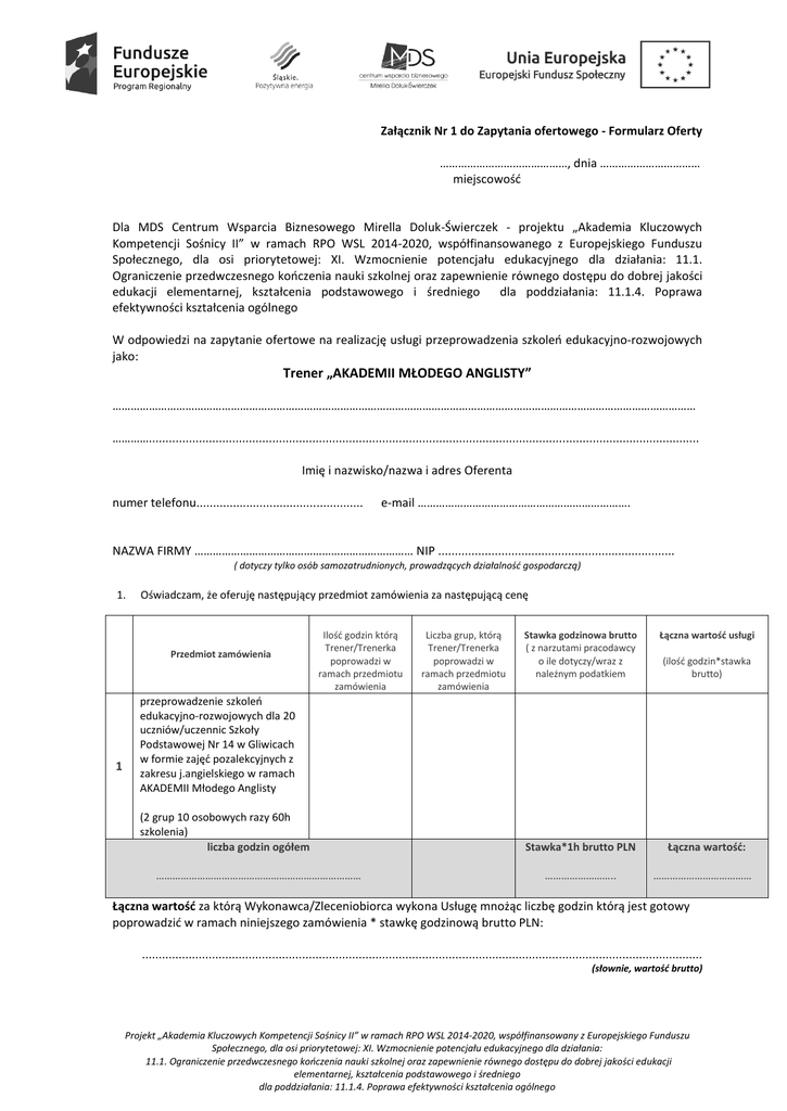 Załącznik Nr 1 do Zapytania ofertowego - Formularz Oferty ……………………………………, dnia …………………………… miejscowość Dla MDS Centrum Wsparcia Biznesowego Mirella Doluk-Świerczek - projektu „Akademia Kluczowych Kompetencji Sośnicy II” w ramach RPO WSL 2014-2020, współfinansowanego z Europejskiego Funduszu Społecznego, dla osi priorytetowej: XI. Wzmocnienie potencjału edukacyjnego dla działania: 11.1. Ograniczenie przedwczesnego kończenia nauki szkolnej oraz zapewnienie równego dostępu do dobrej jakości edukacji elementarnej, kształcenia podstawowego i średniego dla poddziałania: 11.1.4. Poprawa efektywności kształcenia ogólnego W odpowiedzi na zapytanie ofertowe na realizację usługi przeprowadzenia szkoleń edukacyjno-rozwojowych jako: Trener „AKADEMII MŁODEGO ANGLISTY” ………………………………………………………………………………………………………………………………………………………………………… …………..................................................................................................................................................................... Imię i nazwisko/nazwa i adres Oferenta numer telefonu.................................................. e-mail ……………………………………………………………. NAZWA FIRMY ……………………………………………………………… NIP ....................................................................... ( dotyczy tylko osób samozatrudnionych, prowadzących działalność gospodarczą) 1. Oświadczam, że oferuję następujący przedmiot zamówienia za następującą cenę Przedmiot zamówienia 1 Ilość godzin którą Trener/Trenerka poprowadzi w ramach przedmiotu zamówienia Liczba grup, którą Trener/Trenerka poprowadzi w ramach przedmiotu zamówienia Stawka godzinowa brutto ( z narzutami pracodawcy o ile dotyczy/wraz z należnym podatkiem Łączna wartość usługi Stawka*1h brutto PLN Łączna wartość: (ilość godzin*stawka brutto) przeprowadzenie szkoleń edukacyjno-rozwojowych dla 20 uczniów/uczennic Szkoły Podstawowej Nr 14 w Gliwicach w formie zajęć pozalekcyjnych z zakresu j.angielskiego w ramach AKADEMII Młodego Anglisty (2 grup 10 osobowych razy 60h szkolenia) liczba godzin ogółem ………………………………………………………………… …………………….. ……………………………… Łączna wartość za którą Wykonawca/Zleceniobiorca wykona Usługę mnożąc liczbę godzin którą jest gotowy poprowadzić w ramach niniejszego zamówienia * stawkę godzinową brutto PLN: ........................................................................................................................................................................ (słownie, wartość brutto) Projekt „Akademia Kluczowych Kompetencji Sośnicy II” w ramach RPO WSL 2014-2020, współfinansowany z Europejskiego Funduszu Społecznego, dla osi priorytetowej: XI. Wzmocnienie potencjału edukacyjnego dla działania: 11.1. Ograniczenie przedwczesnego kończenia nauki szkolnej oraz zapewnienie równego dostępu do dobrej jakości edukacji elementarnej, kształcenia podstawowego i średniego dla poddziałania: 11.1.4. Poprawa efektywności kształcenia ogólnego *Cena musi obejmować: a) wartość całego przedmiotu zamówienia b) podatek VAT c) narzuty na wynagrodzenia, itp. Składając ofertę oświadczam, że: Zapoznałem się z treścią zapytania ofertowego, spełniam warunki w nim zapisane i nie wnoszę do jego zapisów żadnych zastrzeżeń. ........................................................... ( data, podpis Oferenta) Projekt „Akademia Kluczowych Kompetencji Sośnicy II” w ramach RPO WSL 2014-2020, współfinansowany z Europejskiego Funduszu Społecznego, dla osi priorytetowej: XI. Wzmocnienie potencjału edukacyjnego dla działania: 11.1. Ograniczenie przedwczesnego kończenia nauki szkolnej oraz zapewnienie równego dostępu do dobrej jakości edukacji elementarnej, kształcenia podstawowego i średniego dla poddziałania: 11.1.4. Poprawa efektywności kształcenia ogólnego Załącznik Nr 2 do Zapytania ofertowego Oświadczenie Oferenta o posiadaniu wiedzy i umiejętności, w tym umiejętności obsługi komputera i projektora niezbędnych do realizacji Usługi polegającej na przeprowadzeniu szkoleń dydaktyczno-rozwojowych z zakresu języka angielskiego dla uzdolnionych Imię i nazwisko/ Nazwa Oferenta: ……………………………………………………………………. Adres Oferenta: …………………………………………………………………………………………. Ja, niżej podpisany oświadczam, że posiadam wiedzę i umiejętności, w tym umiejętności obsługi komputera i projektora niezbędnych do realizacji Usługi polegającej na przeprowadzeniu szkoleń dydaktycznorozwojowych z zakresu języka angielskiego dla uzdolnionych ........................................................... /data i podpis Oferenta/ Projekt „Akademia Kluczowych Kompetencji Sośnicy II” w ramach RPO WSL 2014-2020, współfinansowany z Europejskiego Funduszu Społecznego, dla osi priorytetowej: XI. Wzmocnienie potencjału edukacyjnego dla działania: 11.1. Ograniczenie przedwczesnego kończenia nauki szkolnej oraz zapewnienie równego dostępu do dobrej jakości edukacji elementarnej, kształcenia podstawowego i średniego dla poddziałania: 11.1.4. Poprawa efektywności kształcenia ogólnego Załącznik Nr 3 do Zapytania ofertowego Oświadczenie Oferenta o Oferenta o posiadaniu odpowiednich kwalifikacji do wykonania zadania: wyższego wykształcenia, uprawnień pedagogicznych i minimum rocznego doświadczenia w pracy z dziećmi Imię i nazwisko/ Nazwa Oferenta: ………………………………………………………………………….. Adres Oferenta: …………………