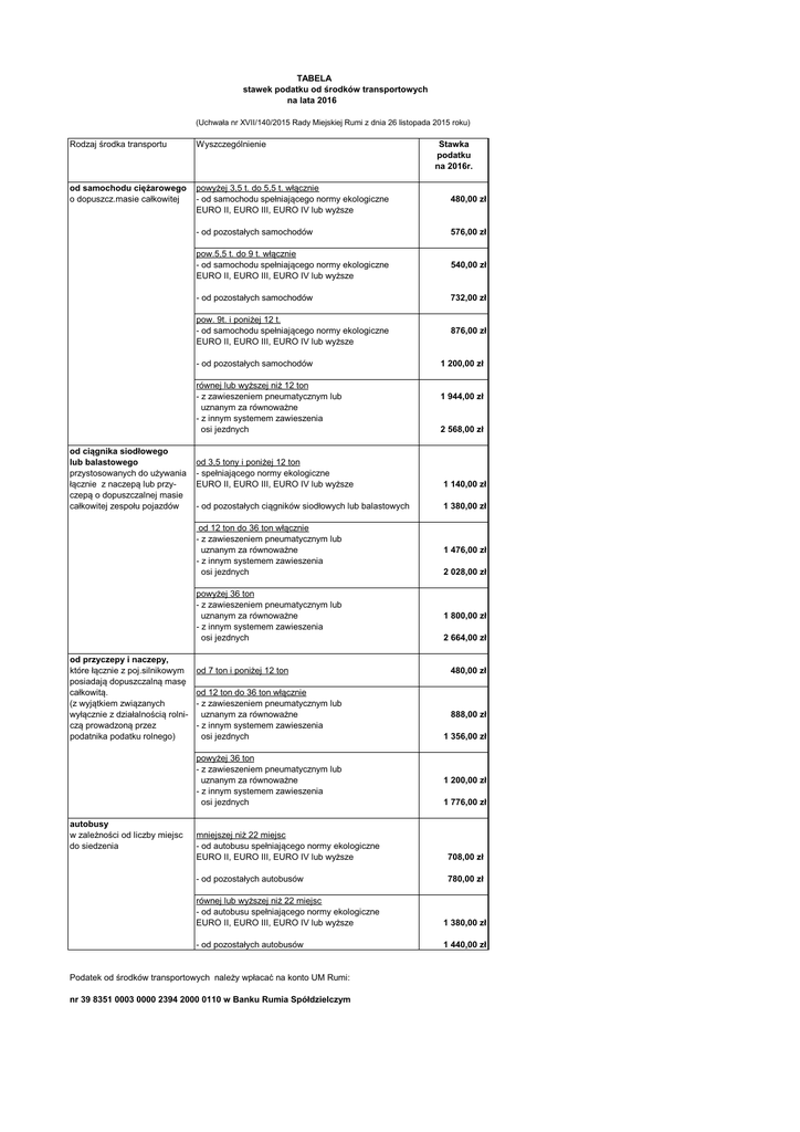TABELA stawek podatku od środków transportowych na lata 2016 (Uchwała nr XVII/140/2015 Rady Miejskiej Rumi z dnia 26 listopada 2015 roku) Rodzaj środka transportu Wyszczególnienie od samochodu ciężarowego o dopuszcz.masie całkowitej powyżej 3,5 t. do 5,5 t. włącznie - od samochodu spełniającego normy ekologiczne EURO II, EURO III, EURO IV lub wyższe 480,00 zł - od pozostałych samochodów 576,00 zł pow.5,5 t. do 9 t. włącznie - od samochodu spełniającego normy ekologiczne EURO II, EURO III, EURO IV lub wyższe 540,00 zł - od pozostałych samochodów 732,00 zł pow. 9t. i poniżej 12 t. - od samochodu spełniającego normy ekologiczne EURO II, EURO III, EURO IV lub wyższe 876,00 zł - od pozostałych samochodów równej lub wyższej niż 12 ton - z zawieszeniem pneumatycznym lub uznanym za równoważne - z innym systemem zawieszenia osi jezdnych od ciągnika siodłowego lub balastowego przystosowanych do używania łącznie z naczepą lub przyczepą o dopuszczalnej masie całkowitej zespołu pojazdów od przyczepy i naczepy, które łącznie z poj.silnikowym posiadają dopuszczalną masę całkowitą. (z wyjątkiem związanych wyłącznie z działalnością rolniczą prowadzoną przez podatnika podatku rolnego) 1 200,00 zł 1 944,00 zł 2 568,00 zł od 3,5 tony i poniżej 12 ton - spełniającego normy ekologiczne EURO II, EURO III, EURO IV lub wyższe 1 140,00 zł - od pozostałych ciągników siodłowych lub balastowych 1 380,00 zł od 12 ton do 36 ton włącznie - z zawieszeniem pneumatycznym lub uznanym za równoważne - z innym systemem zawieszenia osi jezdnych 1 476,00 zł powyżej 36 ton - z zawieszeniem pneumatycznym lub uznanym za równoważne - z innym systemem zawieszenia osi jezdnych 1 800,00 zł 2 028,00 zł 2 664,00 zł od 7 ton i poniżej 12 ton 480,00 zł od 12 ton do 36 ton włącznie - z zawieszeniem pneumatycznym lub uznanym za równoważne - z innym systemem zawieszenia osi jezdnych 888,00 zł powyżej 36 ton - z zawieszeniem pneumatycznym lub uznanym za równoważne - z innym systemem zawieszenia osi jezdnych autobusy w zależności od liczby miejsc do siedzenia Stawka podatku na 2016r. 1 356,00 zł 1 200,00 zł 1 776,00 zł mniejszej niż 22 miejsc - od autobusu spełniającego normy ekologiczne EURO II, EURO III, EURO IV lub wyższe 708,00 zł - od pozostałych autobusów 780,00 zł równej lub wyższej niż 22 miejsc - od autobusu spełniającego normy ekologiczne EURO II, EURO III, EURO IV lub wyższe 1 380,00 zł - od pozostałych autobusów 1 440,00 zł Podatek od środków transportowych należy wpłacać na konto UM Rumi: nr 39 8351 0003 0000 2394 2000 0110 w Banku Rumia Spółdzielczym
