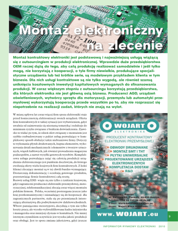 Montaż elektroniczny na zlecenie Montaż kontraktowy elektroniki jest podstawową i najważniejszą usługą wiążącą się z outsourcingiem w produkcji elektronicznej. Wprawdzie duże przedsiębiorstwa OEM raczej dążą do tego, aby całą produkcję realizować samodzielnie i jeśli tylko mogą, nie korzystają z kooperacji, o tyle firmy niewielkie, produkujące specjalistyczne urządzenia lub też krótkie serie, są modelowym przykładem klienta w tym biznesie. Dla nich usługi kontraktowe są nie tylko wygodą, ale również szansą uniknięcia kosztownych inwestycji kapitałowych wymaganych do sfinansowania produkcji. W coraz większym stopniu z outsourcingu korzystają przedsiębiorstwa, dla których elektronika nie jest główną osią biznesu. Producenci AGD, urządzeń oświetleniowych, wytwórcy sprzętu dla motoryzacji, przemysłu lub automatyki przemysłowej wykorzystują kooperację przede wszystkim po to, aby nie rozpraszać się niepotrzebnie na realizacji zadań, których nie znają na wylot. W miarę upływu lat coraz więcej firm spoza elektroniki staje przed koniecznością elektronizacji swoich urządzeń. Oferta firm kontraktowych w takiej sytuacji jest wybawieniem, gdyż uwalnia od zajmowania się nieznaną tematyką i redukuje do minimum ryzyko związane z brakiem doświadczenia. Zjawisko to widać po tym, że rdzeń ofert związany z montażem jest szybko rozbudowywany o pakiet usług pozwalający w kompleksowy sposób obsłużyć także niebranżowe firmy. Dotyczy to wykonania płytek drukowanych, kupna elementów, wykonywania detali mechanicznych i elementów z tworzyw sztucznych, wiązek kablowych, jak również prowadzenia magazynu podzespołów, a nawet wysyłki gotowych wyrobów. Kompleksowa usługa pozwalająca zająć się całością produkcji urządzenia elektronicznego jest punktem docelowym, do którego ewoluują oferty wielu krajowych firm kontraktowych. Z kolei klienci zlecający montaż są w tej chwili bardzo wymagający. Dostarczają dokumentację i oczekują gotowego produktu, pozostawiając firmie kontraktowej całą resztę. Rozwój usług EMS wiąże się nie tylko z rynkiem krajowym, gdyż zagraniczni producenci elektroniki przemysłowej, motoryzacyjnej, telekomunikacyjnej zlecają coraz więcej montażu polskim firmom. Polska, wcześniej postrzegana jeszcze jako kraj postkomunistyczny i nienadający się do kooperacji dla zagranicznych partnerów, stała się po przemianach interesującą alternatywą dla podwykonawców dalekowschodnich. Wbrew panującemu stereotypowi, decydują o tym nie tylko koszty pracy, ale wysoko wykwalifikowana kadra inżynierska i managerska oraz mniejszy dystans w kontaktach. Nie mniej istotnym czynnikiem oczywiście jest wysoka jakość produkcji oraz obsługi. Jest to spora zmiana jakościowa, gdyż jeszcze 9 I N F O R M AT O R R Y N KO W Y E L E K T R O N I K I 2010 Rys. 1 Ocena działalności kontraktowej w stosunku do pozostałej części biznesu kilka lat temu montaż małych i średnich firm dla rynku zagranicznego był praktycznie niemożliwy. Wiązało się to z brakiem możliwości spełnienia wymogów montażu. Chodzi tu głównie o normę IPC-A-610. Obecnie jest ona podstawą pracy wielu klientów w wyznaczaniu oczekiwanej jakości wyrobu. Struktura rynku Rynek usług kontraktowych jest w Polsce bardzo zróżnicowany i silnie konkurencyjny. Wynika to w dużej części z tego, że oprócz firm, które specjalizują się w tej tematyce, dla których montaż podzespołów jest rdzeniem biznesu, na rynku sprzedawane są nadwyżki mocy produkcyjnych wielu przedsiębiorstw spoza tego grona. Wielu producentów OEM, którzy mają linie technologiczne i za ich pomocą realizują produkcję własną, stara się poprawić ich rentowność poprzez sprzedawanie wolnych mocy przerobowych. Maszyny w ich przypadku rzadko są obciążone w pełni, co po części bierze się z tego, że wydajność większości dostępnych na rynku automatów jest stosunkowo duża. Poza tym, nawet jeśli wykorzystanie linii technologicznej jest duże, zawsze można uruchomić drugą lub trzecią zmianę. Usługi kompleksowe tworzą też dla swoich klientów firmy dystrybucyjne sprzedające podzespoły elektroniczne. Rozwiązują one ten sam problem od drugiej strony, rozszerzając ofertę o płytki drukowane i usługi montażowe. Decyzja o zajęciu się czymś więcej niż tylko sprzedażą najłatwiej przychodzi firmom średniej wielkości, takim jak JM Elektronik, Masters lub Elhurt. Dystrybutorzy podzespołów w największym stopniu kierują się w stronę drobnych klientów, tak aby niepotrzebnie nie konkurować z dużymi subkontraktorami. Obsługa małych firm i drobnych zleceń jest niechętnie przyjmowa- 10 I N F O R M AT O R R Y N KO W Y E L E K T R O N I K I 2010 na przez duże firmy kontraktowe, które widzą w nich problemy organizacyjne i dlatego często ustalają wygórowane ceny za ich realizację. Dla dystrybutorów podzespołów elektronicznych oferta usług jest też szansą, aby związać klienta bardziej ze sobą. Inaczej mógłby pójść do innej, konkurencyjnej firmy, co zawsze jest źle widziane. Małe firmy OEM-owe z czasem stają się coraz większe i dlatego zachowanie prawidłowych relacji z nimi ze strony sprzedawców na każdym etapie działalności jest uważane za najlepsze wsparcie dla długofalowego biznesu. Niemniej rynek usług kontraktowych oferowanych przez dystrybucję jest dość płytki. Widać to po tym, że liczba dystrybutorów podzespołów zajmujących się montażem i płytkami drukowanymi praktycznie przestała rosnąć. Montażem elektroniki zajmują się też producenci płytek drukowanych. Wiadomo, że firma zamawiająca obwody drukowane gdzieś potem musi je zmontować, bo specyfika montażu SMT jest taka, że nie da się go wykonać ręcznie. Dlatego istnieje spore prawdopodobieństwo, że przy korzystnej ofercie zleci to w jednym miejscu. Takie podejście do biznesu mają np. Techn