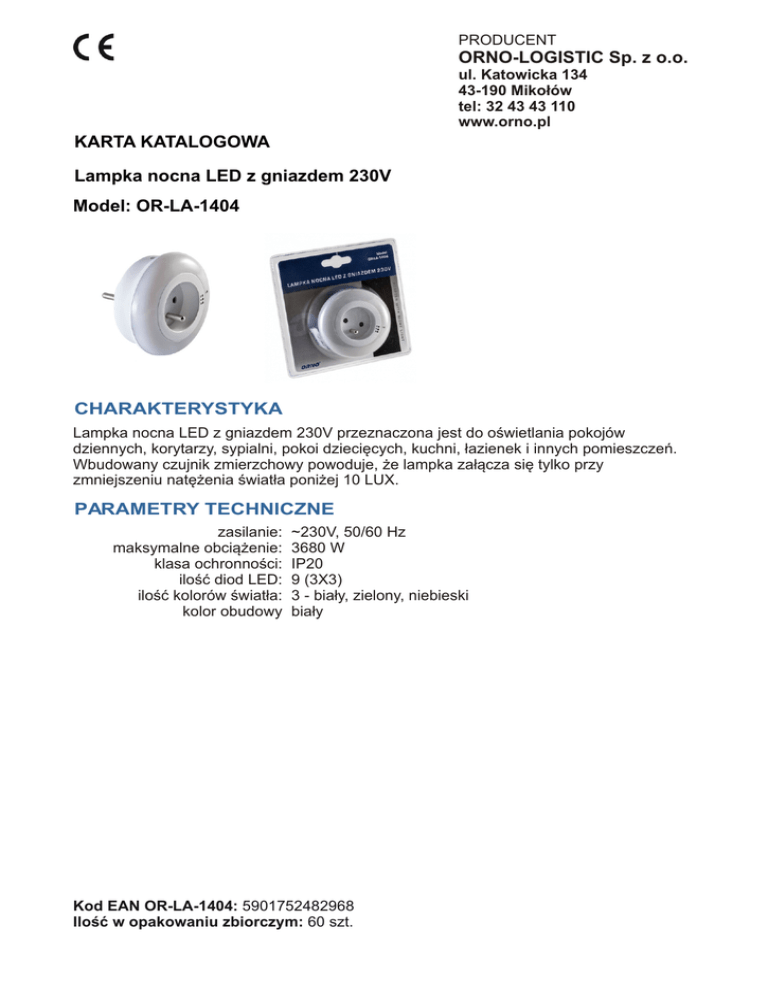 ORNO-LOGISTIC Sp. z o.o. KARTA KATALOGOWA Lampka nocna