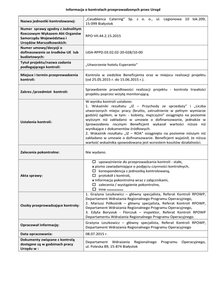 Informacja o kontrolach przeprowadzonych przez Urząd Nazwa jednostki kontrolowanej: Numer sprawy zgodny z Jednolitym Rzeczowym Wykazem Akt Organów Samorządu Województwa i Urzędów Marszałkowskich: Numer umowy/decyzji o dofinasowanie ze środków UE lub budżetowych: Tytuł projektu/nazwa zadania podlegającego kontroli: „Casablanca Catering” Sp. z o. o., ul. Legionowa 10 lok.209, 15-099 Białystok RPO-VII.44.2.15.2015 UDA-RPPD.03.02.02-20-028/10-00 „Utworzenie hotelu Esperanto” Miejsce i termin przeprowadzenia kontroli: Kontrola w siedzibie Beneficjenta oraz w miejscu realizacji projektu (od 25.05.2015 r. do 15.06.2015 r.). Zakres /przedmiot kontroli: Sprawdzenie prawidłowości realizacji projektu - kontrola trwałości projektu poprzez wizytę monitorującą. Ustalenia kontroli: W wyniku kontroli ustalono: 1. Wskaźniki rezultatu „IZ – Przychody ze sprzedaży” i „Liczba utworzonych miejsc pracy (brutto, zatrudnienie w pełnym wymiarze godzin) ogółem, w tym: - kobiety, mężczyźni” osiągnięto na poziomie wyższym niż zakładano w umowie o dofinansowanie, jednakże w Sprawozdaniu rocznym Beneficjent wykazał wartości niższe niż wynikające z dokumentów źródłowych. 2. Wskaźnik rezultatu „IZ – ROA” osiągnięto na poziomie niższym niż zakładano w umowie o dofinansowanie. Beneficjent wyjaśnił, że niższa wartość wskaźnika spowodowana jest wzrostem kosztów działalności. Zalecenia pokontrolne: Nie wydano. Akta sprawy: Osoby przeprowadzające kontrolę: upoważnienie do przeprowadzania kontroli - stałe, x pismo zawiadamiające o podjęciu czynności kontrolnych, korespondencja z jednostką kontrolowaną, protokół z kontroli, x Informacja pokontrolna wraz z załącznikami, zalecenia / wystąpienie pokontrolne, inne ................ 1. Grażyna Leszkowicz – główny specjalista, Referat Kontroli RPOWP, Departament Wdrażania Regionalnego Programu Operacyjnego, 2. Mariusz Półkośnik – główny specjalista, Referat Kontroli RPOWP, Departament Wdrażania Regionalnego Programu Operacyjnego, 3. Edyta Borysiuk - Florczuk – inspektor, Referat Kontroli RPOWP Departamentu Wdrażania Regionalnego Programu Operacyjnego. Opracował informację: Grażyna Leszkowicz – główny specjalista, Referat Kontroli RPOWP, Departament Wdrażania Regionalnego Programu Operacyjnego Data opracowania: 08.07.2015 r. Dokumenty związane z kontrolą dostępne są w godzinach pracy Urzędu w : Departament Wdrażania Regionalnego ul. Poleska 89, 15-874 Białystok Programu Operacyjnego,
