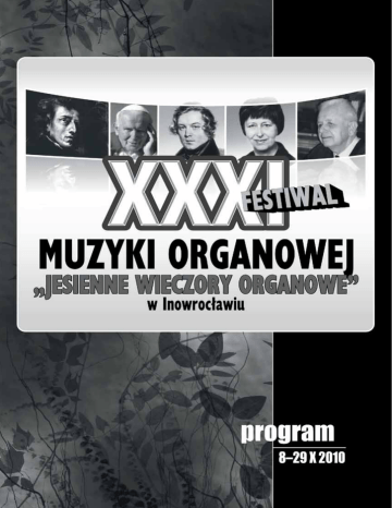 Dyrektor organizacyjny i artystyczny: Agnieszka KROKOWSKA Organizatorzy: Inowrocławskie Towarzystwo Muzyczne PRO ARTE Inowrocławskie Towarzystwo Integracyjne EX AEQUO Kujawskie Centrum Kultury Parafia Imienia NMP w Inowrocławiu Patronat honorowy: Prezydent Miasta Inowrocławia Ryszard BREJZA Strona internetowa festiwalu: 2 www.organy.inowroclaw.info.pl Kalendarz koncertów Piątek, 8 X 2010 r., godz. 18.00 Sala Koncertowa im. I. Dubiskiej Koncert inauguracyjny z okazji obchodów Roku Fryderyka Chopina Wykonawca: Michał Markuszewski – organy /Warszawa/ Piątek, 15 X 2010 r., godz. 19.00 Bazylika Imienia NMP Koncert z okazji obchodów Dnia Papieskiego Wykonawcy: Mariola Augustyn – sopran /Wrocław/ Tomasz Głuchowski – organy/Wrocław/ Piątek, 22 X 2010 r., godz.18.00 Sala Koncertowa im. I. Dubiskiej Koncert z okazji 200. rocznicy urodzin Roberta Schumanna Wykonawca: Bogusław Grabowski – organy /Gdańsk/ Piątek, 29 X 2010 r., godz. 18.00 Sala Koncertowa im. I. Dubiskiej Koncert finałowy pamięci Zasłużonych Inowrocławian: Mirosławy Cieśnik i Piotra Milcherta Wykonawcy: Renata Marzec – wiolonczela /Bydgoszcz/ Małgorzata Ratajczak – mezzosopran /Bydgoszcz/ Witold Kawalec – fortepian /Inowrocław/ Marcin Kopczyński – organy – akompaniament /Inowrocław/ Radosław Marzec – organy /Bydgoszcz/ Zespół Wokalny ITM PRO ARTE pod kier. Anny Drogowskiej Wstęp wolny na wszystkie koncerty Jesienne Wieczory Organowe 2010 3 Szanowni Państwo, przed nami kolejny, trzydziesty pierwszy Festiwal Muzyki Organowej w Inowrocławiu. To szczególny czas uczty dla szerokiego grona miłośników piękna. Tegoroczne Jesienne Wieczory Organowe posiadają bardzo bogatą tematykę. Świętujemy bowiem Rok Chopinowski, a jednocześnie wspominamy 200. rocznicę urodzin Roberta Schumanna. Ponadto muzyka organowa pięknie harmonizuje z Dniami Papieskimi, podczas których pochylamy się nad dziedzictwem pozostawionym nam przez Jana Pawła II. Finałowym akcentem Festiwalu będzie wspomnienie dwojga wybitnych społeczników, zmarłych w tym roku, Mirosławy Cieśnik i Piotra Milcherta. Pozwólcie Państwo na osobistą refleksję o bliskich mi mieszkańcach naszego miasta, jakże zaangażowanych w sprawy inowrocławskiej kultury i szerzej – w życie lokalnej społeczności. Trudno uwierzyć, że nie ma już Ich wśród nas… Mirosława Cieśnik, teoretyk muzyki, pozostawiła wyjątkowe dzieło dokumentacji bogatych tradycji życia muzycznego Inowrocławia w XIX i XX wieku. Była dla środowiska wzorem pracowitości i szlachetnej dobroci. Piotr Milchert, długoletni Prezes Klubu Inteligencji Katolickiej, żarliwy działacz społeczny, niezrównany mówca, wspaniały organizator licznych spotkań, dyskusji, imprez kulturalnych. Sam niejednokrotnie korzystałem z Jego mądrych rad. Pani Mirosława i Pan Piotr – pozostawili trwały ślad w naszym mieście. Pragnę serdecznie podziękować Organizatorom Festiwalu za to, że do inicjatyw, które podejmowane są w całej Polsce, dołączają istotne wątki lokalne, jak w tym roku – wspomnienie wybitnych animatorów kultury. Pozostaję z nadzieją na pełnię przeżyć, które powodują, że uczestnicy koncertów tworzą wspólnotę, istotne doświadczenie naszego życia lokalnego. 4 Ryszard Brejza Prezydent Miasta Inowrocławia Szanowni Państwo, zgodnie z naszą coroczną tradycją, październik jest w Inowrocławiu miesiącem muzyki organowej. Właśnie wkraczamy już w czwartą dekadę tych corocznych cykli koncertowych, szczycąc się najbogatszą historią wśród festiwali organowych w województwie kujawsko-pomorskim. Tegoroczny festiwal organizowany jest jednak w smutnej atmosferze, gdyż inowrocławskie środowisko muzyczne straciło w tym roku dwóch wspaniałych ludzi, Zasłużonych Inowrocławian, osoby blisko związane także z muzyką organową i naszym festiwalem – Mirosławę Cieśnik i Piotra Milcherta. Ta niepowetowana strata nie mogła przejść bez echa w programie tegorocznych koncertów, stąd też finałem festiwalu będzie wyjątkowy koncert lokalnego środowiska muzycznego i zaprzyjaźnionych artystów, by oddać hołd tym, którzy walcząc z chorobą nowotworową i cierpieniem, do końca swoich dni nie poddawali się, czerpiąc siły ze swojej pasji, jaką było umiłowanie lokalnej kultury. Koncert ten odbędzie się 29 października, a więc na krótko przed Świętem Zmarłych, który jest czasem skłaniającym nas do refleksji i pięknych wspomnień o osobach nieobecnych, lecz ciągle nam bliskich. Rok 2010 to również rok naszego najwybitniejszego kompozytora – Fryderyka Chopina, któremu w związku z 200. rocznicą urodzin poświęcony jest koncert inauguracyjny. Jego wykonawcą będzie warszawski organista i pianista Michał Markuszewski. W programie koncertu, oprócz utworów Chopina i improwizacji na temat jego twórczości, znajdą się także kompozycje artystów, którzy odgrywali ważną rolę w życiu i twórczości tego kompozytora. Kolejny koncert, który odbędzie się 15 października, to przede wszystkim okazja do zaprezentowania publiczności festiwalowej nowego instrumentu, który w roku ubiegłym powstał w Bazylice Imienia NMP w Inowrocławiu. Cieszy niezmiernie fakt, że w inowrocławskich świątyniach zaczyna się budować nowe instrumenty i remontować te zabytkowe. Daje to nadzieję, że w kolejnych latach inowrocławskie festiwale muzyki organowej będą mogły odbywać się w miejscach szczególnie do tego predestynowanych. W tym miejscu pragnę też serdecznie podziękować księdzu kanonikowi Tadeuszowi Kościelnemu – proboszczowi Parafii Imienia NMP za otwartość i podjęcie współpracy przy organizacji tegorocznego festiwalu. Wzorem lat ubiegłych, koncert, który odbędzie się w bazylice, będzie nawiązywał do corocznych obchodów Dnia Papieskiego, a jego wykonawcami będą artyści wrocławscy: wokalistka i muzykoterapeutka Mariola Augustyn oraz Tomasz Głuchowski 