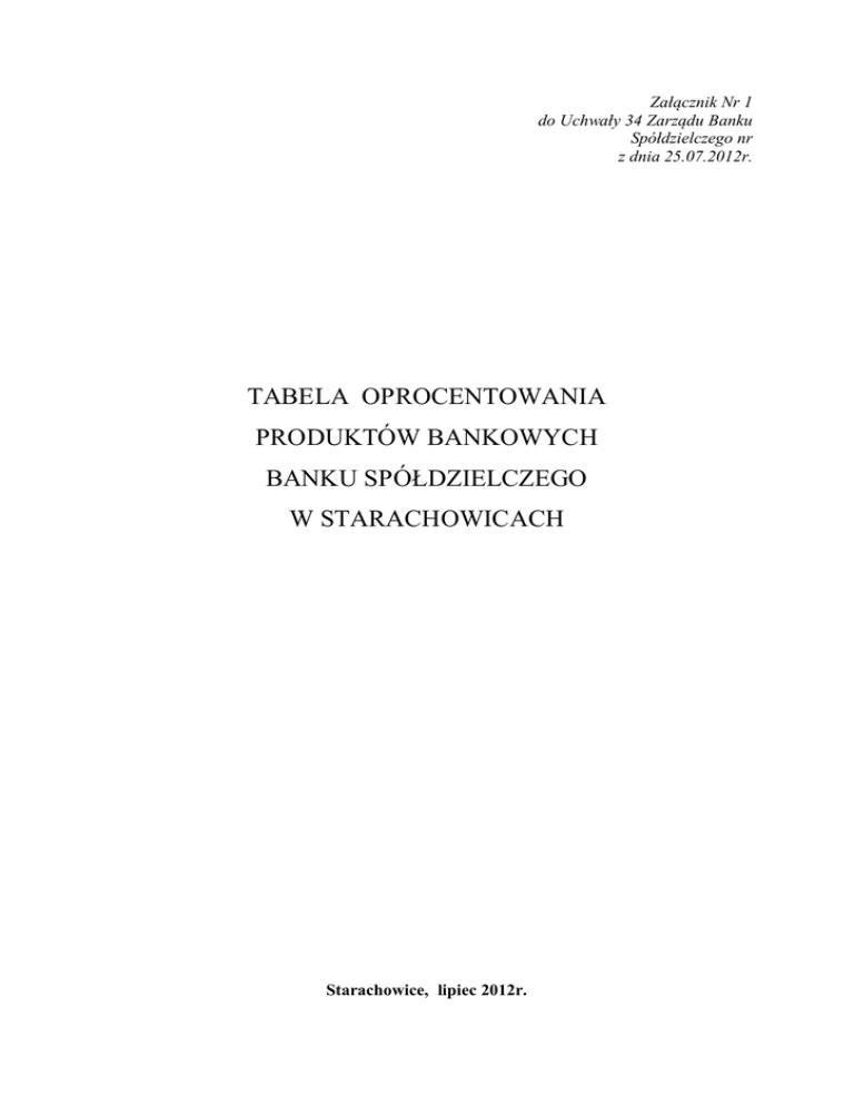 Załącznik Nr 1 do Uchwały 34 Zarządu Banku Spółdzielczego nr z dnia 25.07.2012r. TABELA OPROCENTOWANIA PRODUKTÓW BANKOWYCH BANKU SPÓŁDZIELCZEGO W STARACHOWICACH Starachowice, lipiec 2012r. Spis treści I. KLIENCI INDYWIDUALNI ...........................................................................................3 TAB.1 Rachunki oszczędnościowo-rozliczeniowe, a’vista w złotych. ...................................3 TAB.2A Terminowe lokaty oszczędnościowe w złotych. .......................................................3 TAB.2B Lokata progresywna „MAXIMUM KORZYŚCI” w złotych....................................4 Tab.3 Kredyty dla klientów indywidualnych w złotych. .......................................................4 TAB.4A Kredyty mieszkaniowe dla klientów indywidualnych. .............................................5 TAB.4B Uniwersalny kredyt hipoteczny. .............................................................................5 TAB.4C Kredyty z premią na realizację przedsięwzięć termomodernizacyjnych. .................5 II. KLIENCI INSTYTUCJONALNI ...................................................................................6 TAB.5 Rachunki dla klientów instytucjonalnych w złotych...................................................6 TAB.6 Kredyty dla klientów instytucjonalnych w złotych. ....................................................6 TAB.7 Kredyty pomostowe z dopłatą ze środków Unijnych..................................................7 TAB.8 Kredyty obrotowe dla rolników na zakup środków rzeczowych. ................................7 III. ZADŁUŻENIE PRZETERMINOWANE .....................................................................8 TAB.9 Zadłużenie przeterminowane kredytów udzielanych w zł dla klientów indywidualnych. ..................................................................................................................8 IV. KREDYTY DLA JEDNOSTEK SAMORZĄDU TERYTORIALNEGO ....................8 Tab.10 Kredyty dla jednostek samorządu terytorialnego. ....................................................8 2 I. KLIENCI INDYWIDUALNI TAB.1 Rachunki oszczędnościowo-rozliczeniowe, a’vista w złotych. Lp. Rodzaj rachunku Oprocentowanie Stopa zmienna 1. Rachunki oszczędnościowo-rozliczeniowe 1.1 POL-Konto 2. Rachunek oszczędnościowy MAX-Efekt Od 100 -5.000 5.001-20.000 20.001-50.000 0.50 3.60 4.00 4.70 5.30 Powyżej 50.000 4. Rachunek płatny na każde żądanie dla rad rodziców i innych jednostek organizacyjnych nie posiadających osobowości prawnych Rachunek płatny na żądanie potwierdzony książeczką oszczędnościową 5. Książeczki mieszkaniowe 3. 0.50 0.50 5.20 * * Rachunek oprocentowany jak lokata terminowa 24 m-ce. TAB.2A Terminowe lokaty oszczędnościowe w złotych. Rodzaj rachunku Lp. 1. Lokata terminowa STANDARD 1 miesięczne 3 miesięczne 6 miesięczne 12 miesięczne 24 miesięczne 1.1 „Szczęśliwa 7-ka” *: w okresie od 1 do 3 miesiąca włącznie w okresie kolejnych 3 miesięcy, tj. od 4 do 6 miesiąca 2. Zerwanie lokaty terminowej przed terminem umownym. Oprocentowanie Stopa Stopa zmienna stała 3.50 4.20 4.10 4.40 4.60 4.80 5.20 4.80 5.00 5.00 7.00 0.25 0.25 Oprocentowanie lokat może być negocjowane: - od kwoty 100.000zł do 1.2 p.p. * oferta obowiązuje do dnia 31.07.2012r. 3 TAB.2B Lokata progresywna „MAXIMUM KORZYŚCI” w złotych. Lp. 1. Miesiąc Oprocentowanie * 1 4.00 2 4.10 3 4.20 4 4.30 5 4.40 6 7 8 9 10 11 12 4.50 5.00 5.50 6.00 6.50 7.00 8.00 * oprocentowanie lokaty jest progresywne ,tzn. wysokości stóp procentowych obowiązujących w poszczególnych miesiącach wzrastają z upływem kolejnego pełnego miesiąca utrzymania lokaty. Tab.3 Kredyty dla klientów indywidualnych w złotych. Lp. Rodzaj kredytu Oprocentowanie Stopa Stopa stała zmienna 11.50 1. Limit w POL -Koncie 2. Kredyt odnawialny w POL-Koncie 11.50 3. Kredyt gotówkowy okazjonalny do 12 miesięcy 7.35 4. Kredyt gotówkowy do 2-ch lat Kredyt gotówkowy do 6 m-cy (oprocentowanie obowiązuje do kredytów udzielonych do 31.07.2012r.) Kredyt gotówkowy do 12 miesięcy do 10.000 zł 5. 6. 7. 8. 9. 10 11. Kredyt promocyjny na PIT 15. Kredyt gotówkowy dla klientów sektora finansowego 18. 14.50 15.00 13.00 13.00 Kredyty gotówkowe pow. 40.000 zł z terminem spłaty do 8 lat 14. 17. 13.50 Kredyty gotówkowe pow. 10.000 zł z terminem spłaty do 5 lat (oprocentowanie obowiązuje do kredytów udzielonych do 31.07.2012r.) Kredyty gotówkowe pow. 10.000 zł - 40.000 zł z terminem spłaty do 8lat 13. 16. 11 Kredyty gotówkowe powyżej 1 roku-2 lat do 10.000 zł Kredyty gotówkowe pow. 2 do lat do 10.000 zł Kredyty gotówkowe pow. 10.000 zł opr. w)g 1 M stawki WIBOR (oprocentowanie obowiązuje do kredytów udzielonych do 31.07.2012r. Kredyty gotówkowe pow. 10.000 zł opr. w/g 3M stawki WIBOR (oprocentowanie obowiązuje do kredytów udzielonych do 31.07.2012r.) 12. 11.00 Kredyty gotówkowe „Bezpieczna gotówka” okres spłaty do 2 lat Kredyty gotówkowe z ubezpieczeniem Kredyty z dotacją na zakup kolektorów słonecznych 12.00 Wibor1M+ marża 6 p.p. Wibor3M + marża 6 p.p. 12.90 Wibor1M+ marża 0.1 p.p. 9.00 9.00 Wibor 3M+marża 5p.p 4 TAB.4A Kredyty mieszkaniowe dla klientów indywidualnych. Oprocentowanie PLN Lp. 1. 2. 3. Rodzaj kredytu Kredyt mieszkaniowy „Mój Dom”, gdy kwota kredytu stanowi: Kredyt mieszkaniowy „Mój Dom” Kredyty mieszkaniowy w/g decyzji Banku Do 100 tys. zł Wibor 1M +marża 2.00 – 3.50 p.p. Wibor 3M + marża 2.00 - 3.50 p.p. Powyżej 100 tys. zł Wibor 1M+ marża 1.50 – 3.00 p.p. Wibor 3M +marża 1.50 – 3.00 p.p. 7.50 7.50 TAB.4B Uniwersalny kredyt hipoteczny. Kwota kredytu 1. Oprocentowanie Uniwersalny kredyt hipoteczny: Kredyt o zmiennym oprocentowaniu Wibor 1 M + marża 4.00 – 5.00 p.p Wibor 3 M + marża 4.00 - 5.00 p.p. TAB.4C Kredyty z premią na realizację przedsięwzięć termomodernizacyjnych. L.p 1. Kwota kredytu Kredyty z premią na realizację przedsięwzi