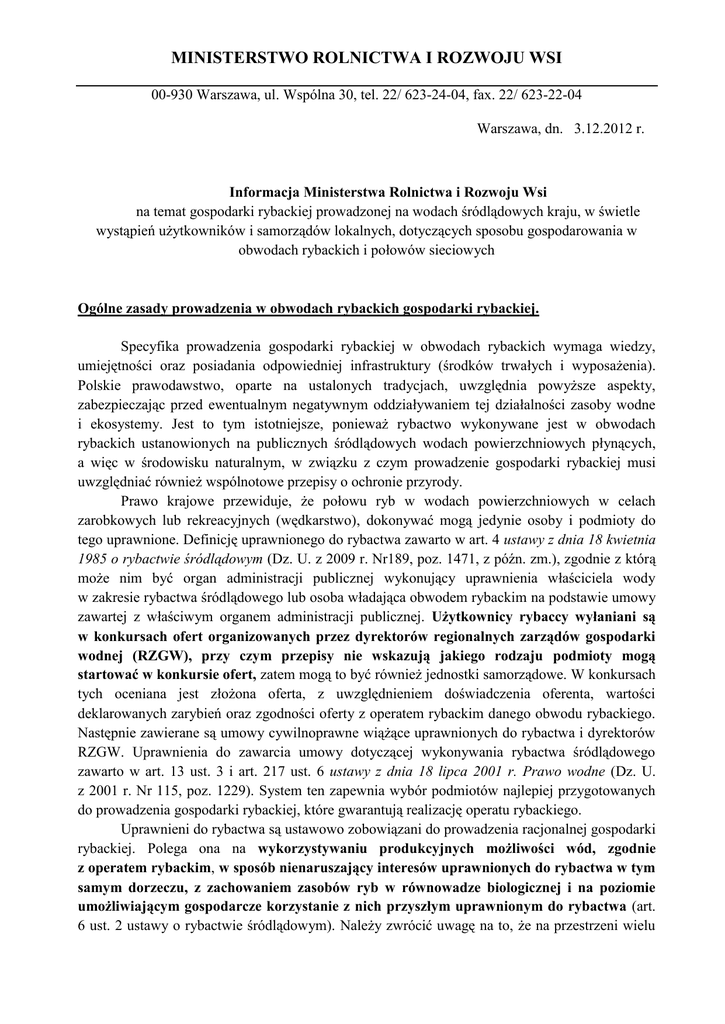 MINISTERSTWO ROLNICTWA I ROZWOJU WSI 00-930 Warszawa, ul. Wspólna 30, tel. 22/ 623-24-04, fax. 22/ 623-22-04 Warszawa, dn. 3.12.2012 r. Informacja Ministerstwa Rolnictwa i Rozwoju Wsi na temat gospodarki rybackiej prowadzonej na wodach śródlądowych kraju, w świetle wystąpień użytkowników i samorządów lokalnych, dotyczących sposobu gospodarowania w obwodach rybackich i połowów sieciowych Ogólne zasady prowadzenia w obwodach rybackich gospodarki rybackiej. Specyfika prowadzenia gospodarki rybackiej w obwodach rybackich wymaga wiedzy, umiejętności oraz posiadania odpowiedniej infrastruktury (środków trwałych i wyposażenia). Polskie prawodawstwo, oparte na ustalonych tradycjach, uwzględnia powyższe aspekty, zabezpieczając przed ewentualnym negatywnym oddziaływaniem tej działalności zasoby wodne i ekosystemy. Jest to tym istotniejsze, ponieważ rybactwo wykonywane jest w obwodach rybackich ustanowionych na publicznych śródlądowych wodach powierzchniowych płynących, a więc w środowisku naturalnym, w związku z czym prowadzenie gospodarki rybackiej musi uwzględniać również wspólnotowe przepisy o ochronie przyrody. Prawo krajowe przewiduje, że połowu ryb w wodach powierzchniowych w celach zarobkowych lub rekreacyjnych (wędkarstwo), dokonywać mogą jedynie osoby i podmioty do tego uprawnione. Definicję uprawnionego do rybactwa zawarto w art. 4 ustawy z dnia 18 kwietnia 1985 o rybactwie śródlądowym (Dz. U. z 2009 r. Nr189, poz. 1471, z późn. zm.), zgodnie z którą może nim być organ administracji publicznej wykonujący uprawnienia właściciela wody w zakresie rybactwa śródlądowego lub osoba władająca obwodem rybackim na podstawie umowy zawartej z właściwym organem administracji publicznej. Użytkownicy rybaccy wyłaniani są w konkursach ofert organizowanych przez dyrektorów regionalnych zarządów gospodarki wodnej (RZGW), przy czym przepisy nie wskazują jakiego rodzaju podmioty mogą startować w konkursie ofert, zatem mogą to być również jednostki samorządowe. W konkursach tych oceniana jest złożona oferta, z uwzględnieniem doświadczenia oferenta, wartości deklarowanych zarybień oraz zgodności oferty z operatem rybackim danego obwodu rybackiego. Następnie zawierane są umowy cywilnoprawne wiążące uprawnionych do rybactwa i dyrektorów RZGW. Uprawnienia do zawarcia umowy dotyczącej wykonywania rybactwa śródlądowego zawarto w art. 13 ust. 3 i art. 217 ust. 6 ustawy z dnia 18 lipca 2001 r. Prawo wodne (Dz. U. z 2001 r. Nr 115, poz. 1229). System ten zapewnia wybór podmiotów najlepiej przygotowanych do prowadzenia gospodarki rybackiej, które gwarantują realizację operatu rybackiego. Uprawnieni do rybactwa są ustawowo zobowiązani do prowadzenia racjonalnej gospodarki rybackiej. Polega ona na wykorzystywaniu produkcyjnych możliwości wód, zgodnie z operatem rybackim, w sposób nienaruszający interesów uprawnionych do rybactwa w tym samym dorzeczu, z zachowaniem zasobów ryb w równowadze biologicznej i na poziomie umożliwiającym gospodarcze korzystanie z nich przyszłym uprawnionym do rybactwa (art. 6 ust. 2 ustawy o rybactwie śródlądowym). Należy zwrócić uwagę na to, że na przestrzeni wielu lat istotnie zmniejszył się udział rybołówstwa śródlądowego w produkcji żywności, rośnie natomiast znaczenie tej działalności w racjonalnym zarządzaniu zasobami środowiska wodnego w celu ochrony różnorodności biologicznej i zachowania zasobów ryb. Operat rybacki dla danego obwodu rybackiego określa podstawowe zasady prowadzenia racjonalnej gospodarki rybackiej w obwodzie rybackim zawierając niezbędne elementy takie jak: typ prowadzonej gospodarki rybackiej czy informacje o nakładach rzeczowo-finansowych przewidzianych na zarybienia, ze wskazaniem zabiegów ochronnych oraz sposobów i warunków odtwarzania eksploatowanych zasobów ryb i raków. Zatem obok niezbędnych aspektów środowiskowych operat rybacki uwzględnia także odpowiedni typ prowadzonej gospodarki rybackiej, w ramach, którego można zadecydować o praktycznie wyłącznie wędkarskim korzystaniu z wód – na taki sposób gospodarowania w wielu obwodach rybackich decydują się Okręgi Polskiego Związku Wędkarskiego (PZW). Niemniej uprawniony do rybactwa może również obok eksploatacji wędkarskiej uwzględniać również pewne elementy dodatkowej eksploatacji wód narzędziami rybackimi. Ponadto dokument ten, aby na jego podstawie prowadzić gospodarkę rybacką, musi zostać pozytywnie zaopiniowany przez jedną z 3 uprawnionych jednostek (uczelnie wyższe) posiadających odpowiednią kadrą naukową zdolną do merytorycznej oceny operatów rybackich. Z wywiązywania się ze swoich obowiązków uprawnieni do rybactwa są rozliczani. Warto podkreślić, iż prowadzenie racjonalnej gospodarki rybackiej zgodnie z założeniami operatu rybackiego, wg art. 6 ust. 2a ustawy z dnia 18 kwietnia 1985 r. o rybactwie śródlądowym, podlega ocenie przez właściwego marszałka województwa na podstawie operatu rybackiego oraz prowadzonej przez uprawnionego do rybactwa dokumentacji. Konsekwencją nierealizowania przez uprawnionego do rybactwa założeń zawartych w operacie rybackim i uzyskania negatywnej oceny, jest rozwiązanie przez dyrektora RZGW zawartej umowy, zgodnie z art. 13 ust. 7 Prawa wodnego, w każdym czasie i bez odszkodowania. Zatem, aby prowadzić racjonalną gospodarkę rybacką w publicznych śródlądowych wodach powierzchniowych płynących, i zachować możliwość władania obwodem rybackim, powinna być ona wykonywana zgodnie z powyższymi wymogami. Żądania i zastrzeżenia zgłaszane przez niektórych przedstawicieli lokalnych władz samorządowych oraz osoby związane z turystyką, wędkarstwem, handlem i usługami z regionu Warmii i Mazur W bieżącym roku wielokrotnie przekazywane były w „imieniu mieszkańców, władz samorządowych, agroturystyki, handlu i usług” z regionu Warmii i Mazur, przez 