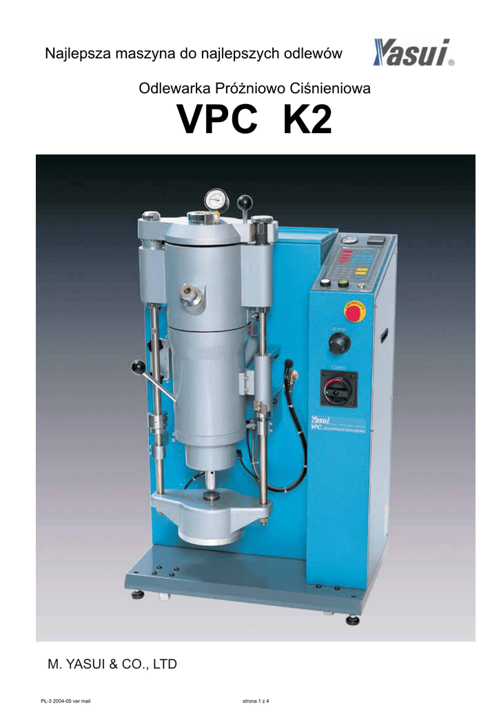 Najlepsza maszyna do najlepszych odlewów Odlewarka Pró¿niowo Ciœnieniowa VPC K2 M. YASUI & CO., LTD PL-3 2004-05 ver mail strona 1 z 4 Do Z³ota , Srebra, Mosi¹dzu, Bia³ego z³ota(Pd)..... Odlewarki VPC (Pró¿niowe Odlewanie Precyzyjne) sterowane komputerowo, zosta³y zaprojektowane dla zak³adów o œredniej i ma³ej wielkoœci produkcji i dla klientów, którzy d¹¿¹ do osi¹gniêcia wysokiej jakoœci. K2 oraz K2-5 wykorzystuj¹ doœwiadczenia konwencjonalnej serii odlewarek YASUI typu KT, która umo¿liwia odlewanie beztlenowe, z kamieniami oraz dok³adne wype³nienie formy gipsowej. W roku 1990 odlewarki serii KT by³y pierwszymi na œwiecie w pe³ni skomputeryzowanymi maszynami umo¿liwiaj¹cymi odlewanie nadciœnieniowe co w rezultacie przynios³o du¿y postêp w jakoœci odlewów. Maszyny te odgrywaj¹ do dziœ wiod¹c¹ rolê w o d l e w n i a c h n a c a ³ y m œ w i e c i e . Pe³na pró¿nia, odlewy beztlenowe. Multi-parametry Komora odlewnicza zapewnia wysok¹ pró¿niê zapewniaj¹c minimalny udzia³ tlenu przed odlewem aby uzyskaæ najlepsze rezultaty. - Maksymalne wype³nienie formy metalem / Filigrany, cienkie wyroby - Niska temperatura odlewania / Szczególnie wa¿ne przy odlewaniu z kamieniami - Wysoka p³ynnoœæ - Ochrona przed pêkaniem odlewu przy kanale wlewowym - Znakomity kontakt z gipsem / G³adka powierzchnia odlewu W s z y s t k i e pa r a m e t r y o d l e w a n i a s¹ widoczne. Jedn¹ z najwa¿niejszych cech tej maszyny jest mo¿liwoœæ regulowania parametrów odlewniczych w zale¿noœci od ró¿nych rodzajów metalu i wyrobów. W pamiêci komputera mo¿na zapisaæ 50 programów. Ka¿dy program zawiera 8 rodzajów parametrów odlewania, które mo¿na modyfikowaæ. Maszyna daje mo¿liwoœæ optymalizacji parametrów odlewania korygowanych w trakcie pracy odlewarki. . Tygiel i zatyczka serii JET (patent) Specjalnie zaprojektowana linia tygli JET bazuj¹cych na za³o¿eniach teorii dynamicznego przep³ywu cieczy, umo¿liwia przep³yw laminarny metalu. Ze wzglêdu na niezak³ócony turbulencjami wyp³yw, K2 mo¿e odlewaæ o 40 % wiêksze objêtoœci metalu w tym samym czasie w porównaniu do konwencjonalnych tygli. Topienie Panel steruj¹cy K2 Zwyk³y tygiel Tygiel serii JET YASUI Odlewanie System wielogazowy (patent) Topienie w atmosferze lekkiego helu (He) i nadciœnienie przy pomocy ciê¿kiego argonu (Ar) lub azotu (N). Hel jest gazem o znakomitej przenikalnoœci i przechodzi przez gips 10 razy lepiej ni¿ argon - ze wzglêdu na mniejsz¹ cz¹steczkê. Hel przenikaj¹c szybciej przez formê zapewnia dok³adne wype³nienie przez metal i g³adk¹ powierzchniê odlewu. Hel jako najl¿ejszy z gazów obojêtnych przyczynia siê tak¿e Doskona³e do oczyszczenia topionego metalu oraz przenikanie gazu formy gipsowej. . System wielogazowy w K-2 chroniony patentem miêdzynarodowym Nr PCT/CH 98/00103 Miêdzynarodowa Publikacja nr WO 98/45071 PL-3 2004-05 ver mail strona 2 z 4 Trzeba jedynie nacisn¹æ klawisz START - w cyklu automatycznym. Oczywiœcie odlewanie w cyklu rêcznym te¿ jest mo¿liwe. W razie potrzeby mo¿na wprowadziæ tlen do odlewu, precyzyjnie kontroluj¹c jego zawartoœæ zmian¹ parametrów odlewania. Zbiornik ciœnieniowy jest zamykany przez system pneumatyczny. W razie wyst¹pienia wewn¹trz zbyt wysokiego ciœnienia, automatyczny uk³ad zabezpieczeñ obni¿y je do wartoœci bezpiecznej. Kontrola cyklu nagrzewania poprzez PID minimalizuje odchy³ki temperatury i lokalne przegrzania tygla. W ten sposób mo¿na uzyskaæ optymaln¹ temperaturê odlewania. K2 wyposa¿ona jest w funkcjê mieszania metalu. Mieszaj¹c stopiony metal unika siê segregacji w ciek³ym metalu. Wysuwaj¹ca siê podstawa pod tuleje czyni operowanie gor¹cymi tulejami ³atwe i bezpieczne. Metoda uszczelnienia tulei do gniazda jest unikatowym systemem uszczelnieñ, w którym poziom uszczelnienia jest znakomity. Trwa³oœæ tego typu uszczelnieñ jest nieporównywalnie wiêksza w stosunku do jakichkolwiek klasycznych uszczelek. Nie trzeba ju¿ stosowaæ tulei ko³nierzowych - dro¿szych i zajmuj¹cych wiêcej miejsca w piecu. K2 obs³uguje i wspó³dzia³a ze wszystkimi typami tulei. Zalecane s¹ jednak tuleje perforowane w celu uzyskania optymalnych warunków odsysania. Granulator SM1 (opcja) Poprzez zainstalowanie granulatora YASUI mo¿na ³atwo produkowaæ granulat o minimalnym zatlenieniu. Topiony metal, chroniony atmosfer¹ gazu obojêtnego, po odpompowaniu powietrza jest granulowany w zimnej wodzie. Ten unikalny zaprojektowany przez YASUI system minimalizuje zatlenienie metalu. Kolejnym osi¹gniêciem jest to, ¿e poza stopieniem metalu nie zu¿ywa siê energii elektrycznej, a granulat jest ³atwo formowany do odpowiedniej granulacji przy u¿yciu samej tylko wody. Panel steruj¹cy Komora odlewnicza Wir wodny w zbiorniku granulatora Wylot wody Wlot wody Wyp³ywaj¹ca woda Seperator cyklonowy Separator cyklonowy (opcja) umo¿liwia odzyskanie granulatu PL-3 2004-05 ver mail strona 3 z 4 Otrzymane granulki DRUKARKA (OPCJA) Drukarka (opcja) pod³¹czana do K2 mo¿e drukowaæ zawartoœæ pamiêci, parametry odlewania, itp. Bardzo przydatna do zapisu parametrów ka¿dego odlewania. SPECYFIKACJA K2-8 Model System odlewania Gazy robocze Iloœæ programów System kontroli Grzanie Moc generatora Ch³odzenie Tuleje Wielkoœæ tygla Maksymalna waga metalu Granulator Drukarka Maks. temperatury Pró¿nia osi¹gana Filtr pró¿niowy Zasilanie Waga netto K2-5 Pró¿niowo - ciœnieniowy system odlewniczy. Maks. ciœnienie 0,3 Mpa, wewn. zbiornik gazu Ar / N, He - system wielogazowy 50 Dedykowany mikroprocesor wraz z uk³adem. Kontrola i stabilizacja temperatury w systemie PID o dok³adnoœci +/- 2 stopnie. Generator indukcyjny ze specjalnie zaprojektowan¹ funkcj¹ mieszania stopionego metalu. 8 kW 5 kW Bezpoœrednie ch³odzenie wod¹ wodoci¹gow¹ Tuleja jest podnoszona i dociskana systemem pneumatycznym, specjalny kszta³t gniazda zapewnia wysok¹ szczelnoœæ, uzyskuje siê pe