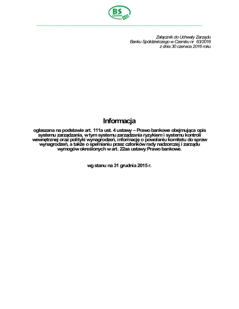 ___________________________________________________________________________ Załącznik do Uchwały Zarządu Banku Spółdzielczego w Czersku nr 63/2016 z dnia 30 czerwca 2016 roku Informacja ogłaszana na podstawie art. 111a ust. 4 ustawy – Prawo bankowe obejmująca opis systemu zarządzania, w tym systemu zarządzania ryzykiem i systemu kontroli wewnętrznej oraz polityki wynagrodzeń, informację o powołaniu komitetu do spraw wynagrodzeń, a także o spełnianiu przez członków rady nadzorczej i zarządu wymogów określonych w art. 22aa ustawy Prawo bankowe. wg stanu na 31 grudnia 2015 r. I. Wstęp Bank zgodnie z wymogami określonymi w art. 111a ust. 4 ustawy Prawo bankowe dokonuje ogłoszenia informacji w zakresie: opisu systemu zarządzania, w tym systemu zarządzania ryzykiem i systemu kontroli wewnętrznej oraz polityki wynagrodzeń, informacji o powołaniu komitetu do spraw wynagrodzeń, a także informacji o spełnianiu przez członków rady nadzorczej i zarządu wymogów określonych w art. 22aa. II. System zarządzania 1. W Banku funkcjonuje system zarządzania zgodny z przepisami ustawy – Prawo bankowe, obejmujący system zarządzania ryzykiem i system kontroli wewnętrznej. System zarządzania stanowi zbiór zasad i mechanizmów odnoszących się do procesów decyzyjnych, zachodzących w banku oraz do oceny prowadzonej działalności bankowej. 2. Zarząd Banku projektuje, wprowadza oraz zapewnia działanie systemu zarządzania. 3. Rada Nadzorcza banku sprawuje nadzór nad wprowadzeniem systemu zarządzania oraz ocenia adekwatność i skuteczność tego systemu. III. Cele i strategie zarządzania ryzykiem 1. Prowadzenie działalności narażonej na ryzyko zmusza Bank do koncentrowania uwagi na powstających zagrożeniach, poszukiwania form obrony przed zagrożeniami i dostosowywania działalności do zmieniających się warunków zewnętrznych; ostrożnościowe podejmowanie ryzyka oznacza utrzymywanie racjonalnej równowagi pomiędzy prowadzeniem działalności przychodowej i kontrolowaniem ryzyka. 2. Zarządzanie ryzykiem w Banku odbywa się zgodnie z długofalową Strategią zarządzania ryzykiem w Banku Spółdzielczym w Czersku przygotowaną przez Zarząd i zatwierdzoną przez Radę Nadzorczą Banku. Jest ona zgodna z założeniami strategii działania Banku i podlega corocznemu przeglądowi zarządczemu i weryfikacji. Przegląd i weryfikacja dokonywana jest również w przypadku występowania znaczących zmian wewnątrz lub w otoczeniu Banku. Strategia zarządzania ryzykiem w Banku Spółdzielczym w Czersku jest powiązana również z innymi regulacjami o charakterze strategicznym np. planem finansowym, a także zasadami w zakresie zarządzania ryzykiem. 3. Strategia zarządzania ryzykiem zawiera cele definiujące apetyt na ryzyko Banku, rozumiany jako maksymalny, akceptowalny poziom ryzyka jaki Bank może ponosić. Cele definiujące apetyt na ryzyko mają charakter wskaźników ilościowych, w tym limitów wewnętrznych, a także założeń dotyczących zasad zarządzania ryzykiem o charakterze jakościowym. IV. Podstawowe informacje na temat organizacji i procesów zarządzania ryzykiem 1. Bank zarządza rodzajami ryzyka uznanymi przez Bank za istotne zgodnie z obowiązującymi wewnętrznymi regulacjami zarządzania tymi rodzajami ryzyka. 2. Do rodzajów ryzyka uznanych przez Bank za istotne, o których mowa w ust. 1, zaliczane są: 1) ryzyko kredytowe; 2) ryzyko operacyjne; 3) ryzyko walutowe; 4) ryzyko koncentracji; 5) ryzyko płynności; 6) ryzyko stopy procentowej w księdze bankowej; 7) ryzyko kapitałowe; 8) ryzyko braku zgodności. 2 3. Na system zarządzania każdym rodzajem ryzyka składa się: 1) procedura opisująca zasady zarządzania ryzykiem; 2) identyfikacja, pomiar i monitorowanie; 3) system limitów ograniczających ryzyko; 4) system informacji zarządczej; 5) odpowiednio dostosowana organizacja procesu zarządzania. 4. Procedury zarządzania ryzykiem podlegają przeglądowi i aktualizacji w cyklach rocznych pod względem dostosowania ich do aktualnych przepisów prawa, zmian w profilu ryzyka, skali działalności Banku oraz zmian organizacyjnych. Wnioski z przeglądu prezentowane są Zarządowi Banku oraz przekazywane do odpowiednich komórek organizacyjnych Banku, celem ewentualnego uaktualnienia zasad zarządzania poszczególnymi rodzajami ryzyka. 5. W procesie zarządzania ryzykiem bankowym w Banku uczestniczą zgodnie z formalnie nadanymi zakresami zadań i odpowiedzialności: 1) Rada Nadzorcza; 2) Zarząd; 3) komórki organizacyjne niezależnie kontrolujące ryzyko, odpowiedzialne za pomiar, monitorowanie i kontrolę poszczególnych rodzajów ryzyka bankowego w skali całego Banku, 4) komórki i jednostki dokonujące operacji z klientami oraz podmiotami finansowymi odpowiedzialne za bieżące zarządzanie ryzykiem w swoim obszarze – np. zarządzanie nadwyżką środków, zarządzanie pozycją walutową, sprzedaż kredytów, identyfikację i akceptację ryzyka kredytowego dla pojedynczych transakcji. 6. Zarządzanie ryzykiem jest zorganizowane w sposób umożliwiający zapobieganie konfliktom interesów pomiędzy pracownikami, czy też jednostkami organizacyjnymi Banku. 7. Rada Nadzorcza: 1) zatwierdza Strategię działania Banku oraz zasady ostrożnego i stabilnego zarządzania Bankiem, obejmujące m.in. możliwy do zaakceptowania ogólny poziom ryzyka Banku; 2) zatwierdza procedury dotyczące procesów: a) szacowania kapitału wewnętrznego, b) planowania i zarządzania kapitałowego; 3) zatwierdza strukturę organizacyjną Banku, zawartą w Regulaminie organizacyjnym, dostosowaną do wielkości i profilu ponoszonego ryzyka; 4) zatwierdza ogólne zasady polityki dotyczącej zmiennych składników wynagrodzeń; 5) sprawuje nadzór nad zarządzaniem ryzykiem braku zgodności rozumianym jako skutki nieprzestrzegania przepisów prawa, regulacji wewnętrznych oraz przyjętych przez Bank standardów postępowania, a także zatwierdza założ
