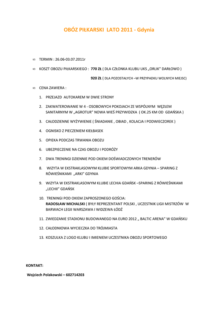 OBÓZ PIŁKARSKI LATO 2011 - Gdynia • TERMIN : 26.06-03.07.2011r • KOSZT OBOZU PIŁKARSKIEGO : 770 ZŁ ( DLA CZŁONKA KLUBU UKS „ORLIK” DARŁOWO ) 920 ZŁ ( DLA POZOSTAŁYCH –W PRZYPADKU WOLNYCH MIEJSC) • CENA ZAWIERA : 1. PRZEJAZD AUTOKAREM W DWIE STRONY 2. ZAKWATEROWANIE W 4 - OSOBOWYCH POKOJACH ZE WSPÓLNYM WĘZŁEM SANITARNYM W „AGROTUR” NOWA WIEŚ PRZYWIDZKA ( OK.25 KM OD GDAŃSKA ) 3. CAŁODZIENNE WYŻYWIENIE ( ŚNIADANIE , OBIAD , KOLACJA I PODWIECZOREK ) 4. OGNISKO Z PIECZENIEM KIEŁBASEK 5. OPIEKA PODCZAS TRWANIA OBOZU 6. UBEZPIECZENIE NA CZAS OBOZU I PODRÓŻY 7. DWA TRENINGI DZIENNIE POD OKIEM DOŚWIADCZONYCH TRENERÓW 8. WIZYTA W EKSTRAKLASOWYM KLUBIE SPORTOWYM ARKA GDYNIA – SPARING Z RÓWIEŚNIKAMI „ARKI” GDYNIA 9. WIZYTA W EKSTRAKLASOWYM KLUBIE LECHIA GDAŃSK –SPARING Z RÓWIEŚNIKAMI „LECHII” GDAŃSK 10. TRENINGI POD OKIEM ZAPROSZONEGO GOŚCIA: RADOSŁAW MICHALSKI ( BYŁY REPREZENTANT POLSKI , UCZESTNIK LIGII MISTRZÓW W BARWACH LEGII WARSZAWA I WIDZEWA ŁÓDŹ 11. ZWIEDZANIE STADIONU BUDOWANEGO NA EURO 2012 „ BALTIC ARENA” W GDAŃSKU 12. CAŁODNIOWA WYCIECZKA DO TRÓJMIASTA 13. KOSZULKA Z LOGO KLUBU I IMIENIEM UCZESTNIKA OBOZU SPORTOWEGO KONTAKT: Wojciech Polakowski – 602714203