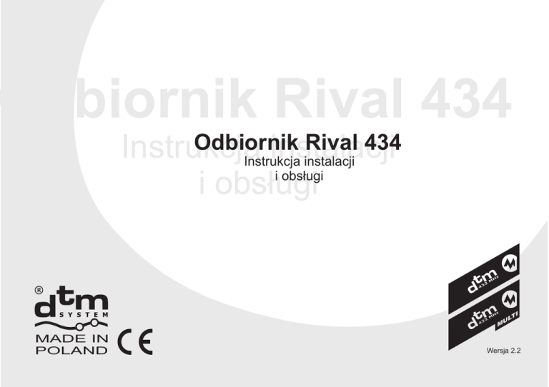 Odbiornik Rival 434 Odbiornik Rival 434 Instrukcja instalacji Instrukcja instalacji i obsługi i obsługi MADE IN POLAND Wersja 2.2 Wersja programu odbiornika (firmware): Numer wersji programu odbiornika pokazywany jest na wyświetlaczu, po podłączeniu zasilania. Aby sprawdzić wersję programu należy odłączyć zasilanie od odbiornika, po ok. 5 sek. podłączyć zasilanie ponownie. Wyświetlone zostanie wskazanie ‘88’, następnie wersja programu. Wersja 2.7 (16-02-2012): 4wprowadzono funkcję blokady administracyjnej 4poprawiono komunikację z portem USB Wersja 2.8 (01.05.2012): 4poprawiono współpracę odbiornika z HUB-ami USB i niektórymi komputerami o architekturze USB opartej na chipach nowszych typów Urządzeń elektrycznych lub elektronicznych nie można wyrzucać razem z odpadami gospodarczymi. Prawidłowa utylizacja urządzenia daje możliwość zachowania naturalnych zasobów Ziemi na dłużej i zapobiega degradacji środowiska naturalnego. Spis treści A. Wprowadzenie __________________________________________________________________________________________________2 B. Instalacja________________________________________________________________________________________________________3 1. Opis urządzenia i sposobu instalowania_______________________________________________________________________________3 2. Instalowanie odbiornika ________________________________________________________________________________________4 3. Opis połączeń elektrycznych______________________________________________________________________________5 4. Przykłady wykorzystania odbiornika RIVAL 434__________________________________________________________________6 C. Tryb pracy ___________________________________________________________________________________________8 D. Proste wpisywanie nowego pilota do odbiornika z użyciem tylko przycisków pilota _______________________________________9 E. Programowanie odbiornika - informacje wstępne _____________________________________________________________________10 1. Menu główne programu odbiornika ______________________________________________________________________________11 1.1 Programowanie pilotów - dopisywanie nowego pilota ______________________________________________________________12 1.2 Programowanie pilotów - edycja zaprogramowanego pilota _______________________________________________________13 1.2.1 Edycja zaprogramowanego pilota - kopiowanie nastaw pilota od pilota nr 001 ____________________________________14 1.2.2 Edycja zaprogramowanego pilota - kojarzenie kanałów z przyciskami pilota _________________________________15 1.2.3 Edycja zaprogramowanego pilota - blokada prostego dopisywania pilota ____________________________________16 1.2.4 Edycja zaprogramowanego pilota - usuwanie pilota ___________________________________________________17 1.3 Zarządzanie pilotem bez jego fizycznej obecności _____________________________________________________________18 1.4 Programowanie kanałów odbiornika _________________________________________________________________________19 1.5 Programowanie trybu chwilowego ________________________________________________________________20 1.6 Programowanie trybu podwójnego przyciśnięcia_________________________________________________________________21 1.7 Liczba pilotów wpisanych do odbiornika_________________________________________________________________________22 1.8 Globalna / administracyjna blokada prostego dopisywania pilota______________________________________________________23 1.9 Blokada dostępu do menu odbiornika (kod PIN)__________________________________________________________________ 24 1.10 Klonowanie pamięci odbiornika______________________________________________________________________________26 1.11 Pamięć fabryczna odbiornika ______________________________________________________________________________27 F. Tryb pracy z komputerem PC poprzez port USB__________________________________________________________________________28 G. Certyfikaty __________________________________________________________________________________________________30 H. Gwarancja __________________________________________________________________________________________________31 I. Indeks _____________________________________________________________________________________________________31 1 A. Wprowadzenie System zdalnego sterowania to grupa urządzeń elektronicznych, opartych na mikrokontrolerach, o niespotykanych dotąd, w innych urządzeniach tego typu, możliwościach funkcjonalnych. W skład systemu wchodzą odbiorniki radiowe, w tym odbiornik Rival 434, któremu poświęcona jest niniejsza instrukcja, sterowniki napędu rolet i bram, piloty radiowe oraz sukcesywnie powiększająca się grupa elementów dodatkowych. Podstawowym zastosowaniem systemu jest sterowanie napędami lub sterownikami napędów rolet i bram, a także oświetleniem, systemami alarmowymi (bezpośrednie podłączenie do linii alarmowych lub do samej centralki), oraz bezpośrednie sterowanie elektrozaczepem (domofony, bramofony, itp.). System jest bardzo elastyczny, możliwości jego zastosowania są bardzo szerokie i zależą głównie od potrzeb i pomysłowości użytkownika. Odbiornik radiowy Rival 434 dzięki zastosowaniu komponentów elektronicznych najwyższej klasy, odznacza się wysoką niezawodnością, a przy tym jest urządzeniem uniwersalnym o wszechstronnych zastosowaniach. Dzięki nowatorskim, w pełni programowalnym funkcjom, sprosta on wymaganiom nawet najbardziej wybrednych użytkowników. Odbiornik Rival 434 wprowadza nowoczesną technologię umożliwiającą łatwe zarządzanie z poziomu komputera PC. 2 B. Instalacja 1. Opis urządzenia i sposobu instalowania Odbiornik Rival 434 składa się z płyty głównej i bryzgoszczelnej obudowy. Płyta główna (rys. 1) posiada listwy łączeniowe służące do przyłączenia instalacji zasilającej oraz sterującej zadanymi urządzeniami. Odb