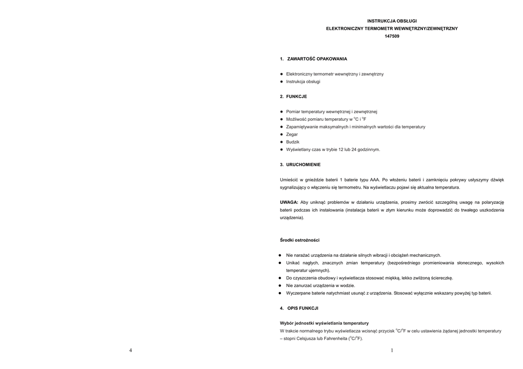 INSTRUKCJA OBSŁUGI ELEKTRONICZNY TERMOMETR WEWNĘTRZNY/ZEWNĘTRZNY 147509 1. ZAWARTOŚĆ OPAKOWANIA Elektroniczny termometr wewnętrzny i zewnętrzny Instrukcja obsługi 2. FUNKCJE Pomiar temperatury wewnętrznej i zewnętrznej o o Możliwość pomiaru temperatury w C i F Zapamiętywanie maksymalnych i minimalnych wartości dla temperatury Zegar Budzik Wyświetlany czas w trybie 12 lub 24 godzinnym. 3. URUCHOMIENIE Umieścić w gnieździe baterii 1 baterie typu AAA. Po włożeniu baterii i zamknięciu pokrywy usłyszymy dźwięk sygnalizujący o włączeniu się termometru. Na wyświetlaczu pojawi się aktualna temperatura. UWAGA: Aby uniknąć problemów w działaniu urządzenia, prosimy zwrócić szczególną uwagę na polaryzację baterii podczas ich instalowania (instalacja baterii w złym kierunku może doprowadzić do trwałego uszkodzenia urządzenia). Środki ostrożności Nie narażać urządzenia na działanie silnych wibracji i obciążeń mechanicznych. Unikać nagłych, znacznych zmian temperatury (bezpośredniego promieniowania słonecznego, wysokich temperatur ujemnych). Do czyszczenia obudowy i wyświetlacza stosować miękką, lekko zwilżoną ściereczkę. Nie zanurzać urządzenia w wodzie. Wyczerpane baterie natychmiast usunąć z urządzenia. Stosować wyłącznie wskazany powyżej typ baterii. 4. OPIS FUNKCJI Wybór jednostki wyświetlania temperatury o o W trakcie normalnego trybu wyświetlacza wcisnąć przycisk C/ F w celu ustawienia żądanej jednostki temperatury o o – stopni Celsjusza lub Fahrenheita ( C/ F). 4 1 WARUNKI GWARANCJI Ustawienie czasu W trakcie normalnego trybu wyświetlacza wcisnąć i przytrzymać przez 3-4 sekundy przycisk MODE/SET. Na wyświetlaczu zacznie migać liczba oznaczająca format czasu 12 lub 24. Przyciskiem MAX/MIN wybrać żądany format czasu i zatwierdzić wybór przyciskiem MODE/SET. Na wyświetlaczu zacznie migać liczba oznaczająca godziny. Przyciskiem MAX/MIN ustawić godzinę i zatwierdzić przyciskiem MODE/SET. Na wyświetlaczu zacznie migać liczba oznaczająca minuty, przyciskiem MAX/MIN ustawić minuty. Potwierdzić ustawienia wciskając przycisk MODE/SET. Ustawienie alarmu i drzemki W trakcie normalnego trybu wyświetlacza wcisnąć przycisk MODE/SET aby wejść w tryb alarmu. Wcisnąć i przytrzymać przez 3-4 sekundy przycisk MODE/SET, na wyświetlaczu zacznie migać cyfra oznaczająca godziny. Przyciskiem MAX/MIN wybrać godzinę, wybór zatwierdzić przyciskiem MODE/SET, na wyświetlaczu zacznie migać cyfra oznaczająca minuty. Przyciskiem MAX/MIN ustawić minuty. Ustawienia potwierdzić wciskając MODE/SET. Aby włączyć/wyłączyć Alarm wcisnąć i przytrzymać przez 3-4 sekundy przycisk AL·ON/OFF, symbol AL pojawi się/zniknie. 1. Niniejsza gwarancja jest udzielana przez firmę BIOWIN z siedzibą przy ul. Pryncypalnej 129/141; 93-373 Łódź, nazywaną w dalszej części gwarancji Gwarantem. 2. Niniejsza gwarancja dotyczy wyłącznie sprzętu używanego na terytorium Polski. 3. Okres gwarancji wynosi 12 miesięcy od daty zakupu sprzętu. 4. W przypadku wad uniemożliwiających korzystanie ze sprzętu okres gwarancji ulega przedłużeniu o czas od dnia zgłoszenia wady do dnia wykonania naprawy. 5. Gwarancja uprawnia do bezpłatnych napraw nabytego sprzętu, polegających na usunięciu wad fizycznych, które ujawniły się w okresie gwarancyjnym, z zastrzeżeniem punktu 9. 6. Zgłoszenie wady sprzętu powinno zawierać: • dowód zakupu towaru; • nazwę i model towaru; • datę sprzedaży (bez skreśleń i poprawek); • podpis i pieczątkę sprzedawcy. 7. Gwarant w terminie 14 dni roboczych od daty zgłoszenia wady ustosunkuje się do zgłoszonej reklamacji. Jeżeli do dokonania naprawy wystąpi konieczność sprowadzenia części zamiennych z zagranicy termin naprawy może ulec przedłużeniu do czasu sprowadzenia niezbędnej elementów, lecz maksymalnie do 30 dni roboczych od daty otrzymania towaru do naprawy. 8. Reklamujący powinien dostarczyć towar odpowiednio zabezpieczony przed uszkodzeniem w czasie transportu. 9. Gwarancja nie obejmuje: • uszkodzeń mechanicznych, chemicznych, termicznych i korozji; • uszkodzeń spowodowanych działaniem czynników zewnętrznych, niezależnych od producenta, a w szczególności wynikłych z użytkowania niezgodnego z Instrukcją Obsługi; • usterek powstałych w wyniku niewłaściwego montażu sprzętu • samowolnych, dokonywanych przez użytkownika lub inne nieupoważnione osoby napraw, przeróbek lub zmian konstrukcyjnych. 10. Niniejsza gwarancja nie ogranicza, nie zawiesza ani nie wyłącza uprawnień kupującego w stosunku do sprzedawcy, wynikających z niezgodności towaru konsumpcyjnego z umową. 11. W przypadku gdy naprawa, bądź wymiana urządzenia na nowe jest niemożliwa, reklamującemu przysługuje prawo do zwrotu zapłaconej kwoty. Minimalne i maksymalne wskazania temperatury i wilgotności Nazwa i model Data sprzedaży Podpis i pieczątka sprzedawcy W trakcie normalnego trybu wyświetlacza wcisnąć przycisk MAX/MIN, a na wyświetlaczu pojawi się najwyższa i najniższa zapamiętana wartość temperatury wewnętrznej i zewnętrznej. 5. DANE TECHNICZNE o o o o Zakres pomiaru temperatury wewnętrznej: od 0 C do 50 C (od 32 F do 122 F) o o o o Zakres pomiaru temperatury zewnętrznej: od -40 C do 70 C (od -40 F do 158 F) o o Dokładność pomiarów temperatury: +/- 1 C (+/- 2 F) Rodzaj baterii: 1 x AAA Długość przewodu do mierzenia temperatury na zewnątrz: ok. 1.5m BIOWIN D. i T. K. S.C. 93-373 Łódź, ul. Pryncypalna 129/141 tel.: +48 (42) 682 92 55 [email protected], www.biowin.pl 2 3
