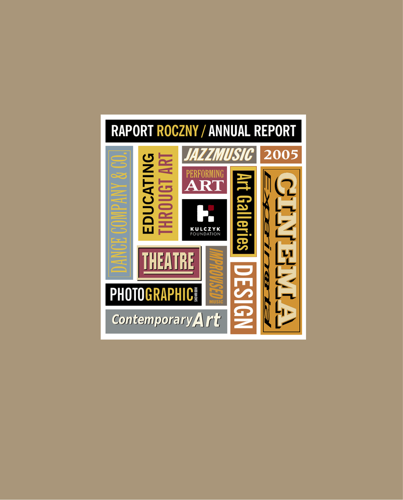 THROUGT ART 2005 PERFORMING Experimental EDUCATING JAZZMUSIC Art Galleries DESIGN IMPROVISED ART THEATRE PHOTOGRAPHIC SHOWROOM DANCE COMPANY & Co. RAPORT ROCZNY / ANNUAL REPORT MUSIC Contemporary Art THROUGT ART 2005 PERFORMING Experimental EDUCATING JAZZMUSIC Art Galleries DESIGN IMPROVISED ART THEATRE PHOTOGRAPHIC SHOWROOM DANCE COMPANY & Co. RAPORT ROCZNY / ANNUAL REPORT MUSIC Contemporary Art 2005 RAPORT ROCZNY JAZZMUSIC SHOWROOM PHOTOGRAPHIC THROUGT ART EDUCATING IMPROVISED DANCE COMPANY & Co. Experimental DESIGN THEATRE Art Galleries PERFORMING ART MUSIC Contemporary Art List Fundatora / Letter from the Founder 3 Part I Misja Fundacji / The Mission 5 O Fundacji / About the Foundation 7 Part II Program Wystawienniczy / Program for Exhibitions 8 Part III Program Performatywny / Program for Performing Arts 16 Part IV Program Klasyki Filmowej / Program for Movie Classics 22 Part V Program Muzyki Improwizowanej / Program for Improvised Music 32 Part VI Program edukacyjny / Educational Program 40 Part VII Wspó∏organizowanie przedsi´wzi´ç artystycznych / Co-operation Part VIII Kalendarium / Calendar of Events 48 EDUCATING OF MOVING THEATRE THEATRE 00 SHOWROOM PHOTOGRAPHIC ART MUSIC CONTEMPORARY ART DESIGN IMAGES PERFORMING IMPROVISED THE ART JAZZMUSIC Art Galleries THROUGT ART EXHIBITIONS DANCE COMPANY & Co. Experimental Szanowni Paƒstwo Dear Ladies/Genetelmen, To by∏ dobry rok. Rok niezapomnianych artystycznych zdarzeƒ – spektakli, It was a very good year; a year of unforgettable art events – theatre and koncertów, wernisa˝y i edukacyjnych projektów. Rok wielu wa˝kich odkryç dance performances, concerts, exhibitions, and educational projects. It i spotkaƒ. Wreszcie rok intensywnej pracy zaproszonych artystów i zespo∏u was a year of significant discoveries and meetings. It was also a year of Fundacji. Imponujàcy rok, z comiesi´cznym wachlarzem wydarzeƒ, nawiàzujàcych intensive work for guest artists and for everybody at the Foundation. Finally, it was an impressive year, with its wide range of regular events do wielu obszarów aktywnoÊci artystycznej. StaraliÊmy si´ dotrzeç do szerokiego related to various genres of artistic activity. We tried to reach a very wide grona odbiorców, by zgodnie z naszym marzeniem przerzuciç pomost mi´dzy public to fulfill our aim which is to bridge the gap between contemporary widzem i wspó∏czesnà sztukà. OferowaliÊmy artystyczne prze˝ycia i wzruszenia, art and an audience. We offered a multitude of artistic experiences and prze∏amywaliÊmy bariery i uprzedzenia, ∏àczyliÊmy pokolenia, docierajàc do coraz sensations, we broke down barriers and prejudices, we united generations, szerszych kr´gów publicznoÊci. Szczególnà uwag´ skupiliÊmy na najm∏odszych reaching to ever broader audience. Our particular attention went to the – na dzieciach, dla których w minionym roku powsta∏ w Browarze szereg youngest. For children we have set up a series of educational programs edukacyjnych programów, których celem jest uwra˝liwienie na otaczajàcy Êwiat which aim at bringing up an art conscious and sophisticated society by i nierozerwalnà z nim sztuk´, a tym samym kreowanie Êwiadomego i wyrafinowanego jej odbiorcy. making the youngest ones sensitive to the world and art – two all-important and inseparable phenomena. Wszystkie nasze dzia∏ania majà wspólny mianownik. To szczere pragnienie All our activities have one thing in common – our will to give memorable ofiarowania sztuce, publicznoÊci, miastu, Staremu Browarowi wa˝nych experiences and discoveries to the art, the public, the town, and to Stary niezapomnianych artystycznych odkryç i prze˝yç. To nasza prawdziwa pasja i ˝arliwe oddanie. I temu oddaniu dedykuj´ ten raport... Browar. It's our true passion and persistent devotion. It is this devotion that I dedicate this Report to... 05 01. Misja / Mission Kulczyk Foundation is a private-owned non-profit organisation founded in faith that art has positive influence on the community, and that by experiencing it people gain a chance for better, more creative and conscious living. The Mission of The Kulczyk Foundation is to open young people's minds through art, and to help them to develop their creative potential. The Foundation promotes a more creative, conscious and art-sensitive society. The Goal of the Foundation is to inspire, co-ordinate and finance various activities which help to disseminate knowledge on contemporary art and culture, and also to support and promote young local artists, whose works are exhibited together with those of renowned artists'. We offer the visitors an opportunity to discover, experience, and learn about art in close touch with both famous and emerging artists, and in various educational activities. The Idea is to create a platform for dialogue between various generations of artists, for confronting masters with their 'apprentices', for promoting excellent artistic quality, and – by being open to as wide an audience as possible – for building a bridge between an artist and an audience of contemporary art. One of the elementary forms of the Foundation's activity is to organise art events, unique to Poznaƒ and to the whole country, which will permanently place Stary Browar on the cultural map of Poland. The Program includes: – exhibitions – performing arts – experimental movie classics events – improvised music events – educational activities Activities of the Foundation concentrate in and around the Art Court (Dziedziniec Sztuki) at Stary Browar, where both Galeria and S∏odownia buildings house many temporary exhibitions (of contemporary fine arts, photography, and design) and serve as movie and concert venues. Performing arts (including theatrical and dance performances) are also staged here. 06 Kulczyk Foundation jest organizacjà non-profit, ufundowanà w wierze, ˝e sztuka ma pozytywny wp∏yw na spo∏eczeƒstwo, a poprzez obcowanie z nià lu