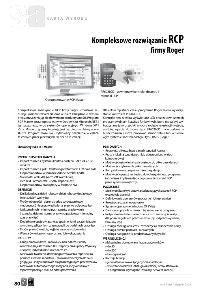 k a r ta w y r o b u Kompleksowe rozwiązanie RCP firmy Roger Oprogramowanie RCP Master PR602LCD – zewnętrzny kontroler dostępu i terminal RCP Kompleksowe rozwiązanie RCP firmy Roger umożliwia redukcję kosztów rozliczania oraz wspiera zarządzanie czasem pracy, przyczyniając się do wzrostu produktywności. Program RCP Master został opracowany w środowisku Microsoft.NET i jest przeznaczony do systemów operacyjnych Windows XP i Vista. Ma on przyjazny interfejs, jest bezpieczny i łatwy w obsłudze. Program może być użytkowany bezpłatnie w celach testowych przez pierwszych 60 dni po instalacji. Dla celów rejestracji czasu pracy firma Roger zaleca wykorzystanie kontrolera PR602LCD. Kontroler ten zawiera wyświetlacz LCD oraz zestaw czterech programowalnych klawiszy funkcyjnych, które mogą być wykorzystane jako przyciski wyboru rodzaju rejestracji (wejście, wyjście, wyjście służbowe itp.). PR602LCD ma wbudowany bufor zdarzeń i może pracować samodzielnie lub w sieciowym systemie kontroli dostępu typu RACS (Roger). Charakterystyka RCP Master Plik danych • Relacyjna, plikowa baza danych typu MS Access • Praca z lokalną bazą danych lub udostępnioną w sieci komputerowej • Możliwość ustawiania hasła dostępu do pliku bazy danych • Możliwość szyfrowania pliku bazy danych • Kompaktowanie i naprawa pliku bazy danych • Możliwość operacji na bazie z dowolnego innego programu (np. własna implementacja dopisywania zdarzeń RCP przez system zewnętrzny) Pozostałe • Możliwość korekty i wstawiania brakujących zdarzeń RCP oraz edycja absencji • Definiowanie operatorów programu i ich uprawnień • Rejestracja działań operatorów • Systemy operacyjne: Windows XP i Vista • Darmowy upgrade w ramach tej samej wersji programu • Indywidualne kalendarze pracy z możliwością korekty dla poszczególnych pracowników (np. odpracowywanie, zamiany itp.) • Obsługa zaokrąglania czasu rozpoczęcia i zakończenia pracy • Obsługa przerw płatnych i niepłatnych • Obsługa nadgodzin (5 predefiniowanych typów) Wersje licencji • Maksymalna obsługiwana liczba pracowników: – do 50 – do 250 – bez ograniczeń • Rodzaje licencji: – jednostanowiskowa (pojedyncza instalacja) – wielostanowiskowa (obsługa określonej liczby stanowisk z programem, wymagana instalacja serwera licencji) Import/eksport danych • Import zdarzeń z systemu kontroli dostępu RACS v4.2.5.38 i wyższe • Import zdarzeń z pliku tekstowego w formacie CSV oraz XML • Eksport raportów w formacie Adobe Acrobat (.pdf), Microsoft Excel (.xls), Microsoft Word (.doc), Rich Text Format (.rtf) i Crystal Reports (.rpt) • Eksport raportów czasu pracy w formacie XML Definicje • Dni kalendarza: dzień roboczy, dzień roboczy dodatkowy, święto, dzień wolny itp. • Typów obecności i absencji: urlop wypoczynkowy, nieobecność nieusprawiedliwiona, przerwa obiadowa itp. • Maksymalnych i minimalnych czasów przebywania (np. maks. dzienna norma przerw na papierosa, minimalny czas pracy itp.) • Dodatkowe opcje związane ze spóźnieniami, wcześniejszymi wyjściami, zaliczaniem czasu przed i po godzinach pracy itp. • Typów przejść: wejście, wyjście, wyjście służbowe itd. • Wymiarów urlopów i raport stanu ich wykorzystania Raporty • Grupy pracowników, Pracownicy, Kalendarze, Punkty kontrolne, Rejestr zdarzeń RCP, Raporty czasu pracy, Wymiary urlopów, Indywidualne kalendarze itp. • Możliwość tworzenia dowolnego zestawienia raportów za pomocą kreatora raportów – zarówno zbiorczych dla całej grupy, jak i indywidualnych dla poszczególnych pracowników • Możliwość automatycznego rozsyłania indywidualnych raportów pocztą e-mail na adres pracownika 80 nr 4, lipiec – sierpień 2009