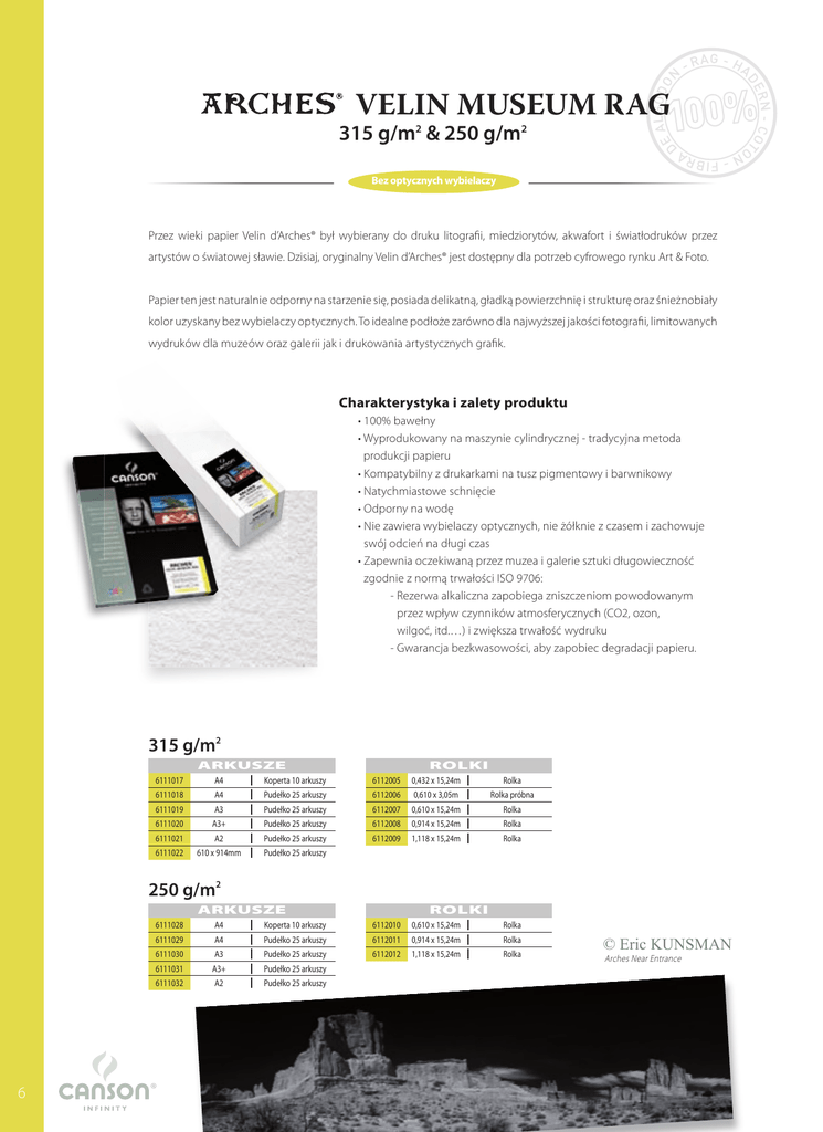 VELIN MUSEUM RAG 315 g/m2 & 250 g/m2 Bez optycznych wybielaczy Przez wieki papier Velin d’Arches® był wybierany do druku litografii, miedziorytów, akwafort i światłodruków przez artystów o światowej sławie. Dzisiaj, oryginalny Velin d’Arches® jest dostępny dla potrzeb cyfrowego rynku Art & Foto. Papier ten jest naturalnie odporny na starzenie się, posiada delikatną, gładką powierzchnię i strukturę oraz śnieżnobiały kolor uzyskany bez wybielaczy optycznych. To idealne podłoże zarówno dla najwyższej jakości fotografii, limitowanych wydruków dla muzeów oraz galerii jak i drukowania artystycznych grafik. Charakterystyka i zalety produktu • 100% bawełny • Wyprodukowany na maszynie cylindrycznej - tradycyjna metoda produkcji papieru • Kompatybilny z drukarkami na tusz pigmentowy i barwnikowy • Natychmiastowe schnięcie • Odporny na wodę • Nie zawiera wybielaczy optycznych, nie żółknie z czasem i zachowuje swój odcień na długi czas • Zapewnia oczekiwaną przez muzea i galerie sztuki długowieczność zgodnie z normą trwałości ISO 9706: - Rezerwa alkaliczna zapobiega zniszczeniom powodowanym przez wpływ czynników atmosferycznych (CO2, ozon, wilgoć, itd.…) i zwiększa trwałość wydruku - Gwarancja bezkwasowości, aby zapobiec degradacji papieru. 315 g/m2 ARKUSZE RolKi 6111017 A4 Koperta 10 arkuszy 6112005 0,432 x 15,24m Rolka 6111018 A4 Pudełko 25 arkuszy 6112006 0,610 x 3,05m Rolka próbna 6111019 A3 Pudełko 25 arkuszy 6112007 0,610 x 15,24m Rolka 6111020 A3+ Pudełko 25 arkuszy 6112008 0,914 x 15,24m Rolka 6111021 A2 Pudełko 25 arkuszy 6112009 1,118 x 15,24m Rolka 6111022 610 x 914mm Pudełko 25 arkuszy 250 g/m2 ARKUSZE 6 RolKi 6111028 A4 Koperta 10 arkuszy 6112010 0,610 x 15,24m Rolka 6111029 A4 Pudełko 25 arkuszy 6112011 0,914 x 15,24m Rolka 6111030 A3 Pudełko 25 arkuszy 6112012 1,118 x 15,24m Rolka 6111031 A3+ Pudełko 25 arkuszy 6111032 A2 Pudełko 25 arkuszy © Eric KUNSMAN Arches Near Entrance