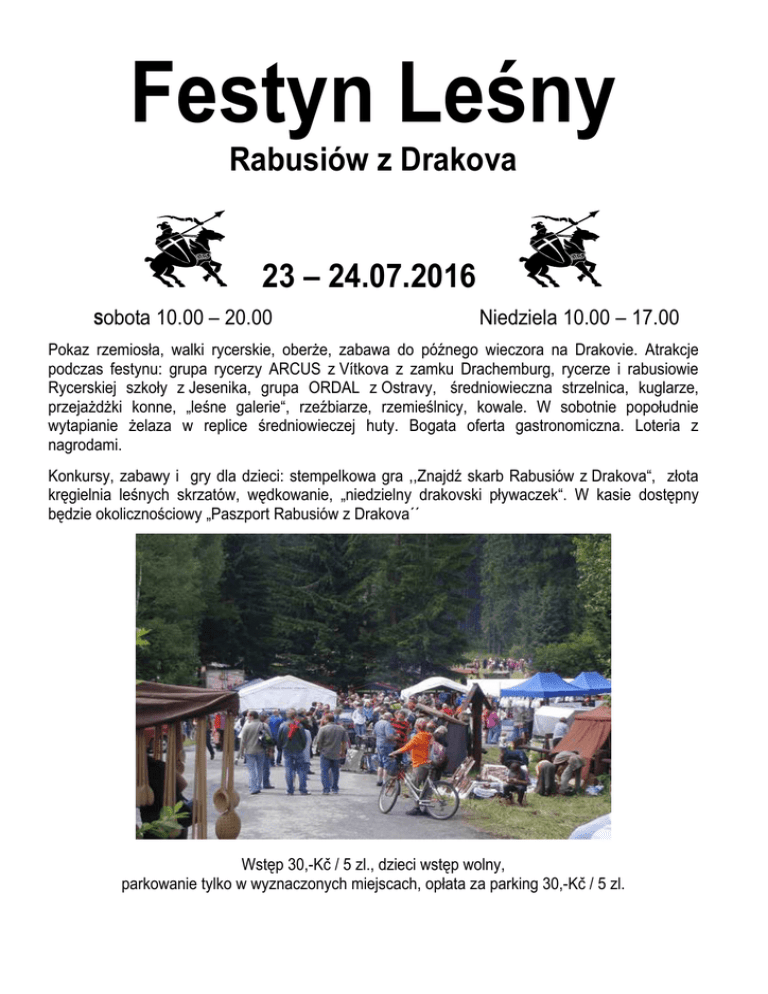 Festyn Leśny Rabusiów z Drakova 23 – 24.07.2016 Sobota 10.00 – 20.00 Niedziela 10.00 – 17.00 Pokaz rzemiosła, walki rycerskie, oberże, zabawa do późnego wieczora na Drakovie. Atrakcje podczas festynu: grupa rycerzy ARCUS z Vítkova z zamku Drachemburg, rycerze i rabusiowie Rycerskiej szkoły z Jesenika, grupa ORDAL z Ostravy, średniowieczna strzelnica, kuglarze, przejażdżki konne, „leśne galerie“, rzeźbiarze, rzemieślnicy, kowale. W sobotnie popołudnie wytapianie żelaza w replice średniowieczej huty. Bogata oferta gastronomiczna. Loteria z nagrodami. Konkursy, zabawy i gry dla dzieci: stempelkowa gra ,,Znajdź skarb Rabusiów z Drakova“, złota kręgielnia leśnych skrzatów, wędkowanie, „niedzielny drakovski pływaczek“. W kasie dostępny będzie okolicznościowy „Paszport Rabusiów z Drakova´´ Wstęp 30,-Kč / 5 zl., dzieci wstęp wolny, parkowanie tylko w wyznaczonych miejscach, opłata za parking 30,-Kč / 5 zl.