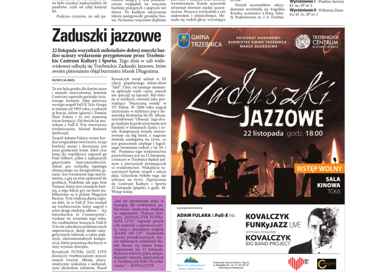 Od każdej osoby z komisji można było uzyskać maksymalnie 20 punktów, czyli od całej komisji 60. Podczas czytania, na sali pa- rodzice stojący z tyłu pomieszczenia wyglądali na znacznie bardziej przejętych i spiętych niż dzieci. Po każdym odczytaniu tekstu następowały gromkie brawa. Na koniec wręczono dyplomy <CFWU\MKLC\\QYG 22 listopada wszystkich miłośników dobrej muzyki bardzo ucieszy wydarzenie przygotowane przez Trzebnickie Centrum Kultury i Sportu. Tego dnia w sali widowiskowej odbędą się Trzebnickie Zaduszki Jazzowe, które swoim patronatem objął burmistrz Marek Długozima. PATRYCJA KRÓL To nie lada gratka dla fanów jazzu i muzyki rozrywkowej, bowiem Centrum zaprosiło gwiazdy światowego formatu. Jako pierwszy wystąpi zespół Full-X Trio. Grupa ta istnieje od 1993 roku, a założyli ją bracia: Adam (gitara) i Tomasz (bas) Fulara i to oni stanowią trzon formacji. Od dwóch lat muzykom z Full-X Trio towarzyszy trzebniczanin, Michał Bednarz (perkusja). Zespół Adama Fulary, mimo bardzo oryginalnej twórczości, wciąż bardziej znany i doceniany jest poza granicami kraju. Jakiś czas temu do współpracy zaprosił go Paul Gilbert, jeden z najlepszych gitarzystów heavymetalowych. Adam gra techniką tappingu oburęcznego na dwugryfowej gitarze. Jest wirtuozem tego instrumentu, a grę na nim opanował do perfekcji. Podobnie jak jego brat Tomasz, który jest uznanym basistą, a jego lekcje gry na basie publikowane są w piśmie Magazyn Basista. Tym większą dumą napawa fakt, że w Full-X Trio znalazł się trzebniczanin, który nagrał z nimi drugi studyjny album – "An Introduction to Counterpoint", wydany we wrześniu tego roku. Na trzebnickim koncercie Full-X Trio nie zabraknie polifonicznych improwizacji, dużej dawki energetycznych solówek, a także pięknych, instrumentalnych kompozycji, które przeniosą słuchaczy w inny wymiar dźwięku. Kovalczyk FUNKy JAZZ LIVE dostarczy trzebniczanom jeszcze innych wrażeń. Młody, charyzmatyczny wokalista z niebanalnym aktorskim talentem, Paweł Kowalczyk wziął udział w III edycji popularnego talent-show "Idol". Choć od tamtego momentu upłynęło wiele czasu, muzyk nie spoczął na laurach. Był obecny w mediach, również jako prowadzący "Muzyczną windę" w TV Polsat. W 2009 roku nagrał utrzymany w stylistyce pop z domieszką brzmienia lat 80. album, zatytułowany "Obsesja". Jego drugi studyjny krążek utrzymany jest bardziej w klimatach funky i soulu. Kompozycje zostały zaaranżowane na big band, a nagrane metodą analogową na żywo, co jest gwarantem ciepłego i łagodnego brzmienia rodem z lat 50. i 60. Premiera tego wydawnictwa przewidziana jest na 12 listopada, a koncert w Trzebnicy będzie jednym z pierwszych promujących to wydawnictwo. Wokaliście towarzyszył będzie zespół i sekcja dęta. Grzechem byłoby tego nie usłyszeć na żywo. Zapraszamy do Centrum Kultury i Sportu 22 listopada (piątek), o godz. 18. Wstęp wolny. „Jest mi niezmiernie miło, iż wystąpię dla trzebnickiej publiczności. Serdecznie dziękuję za zaproszenie. Podczas koncertu „KOVALCZYK FUNKyJAZZ LIVE” zagramy prawie cały materiał z najnowszej płyty, wraz z aktualnym singlem „RAISE ME UP”. Znakomite utwory ponadczasowych, moich ulubionych wokalistek Shirley Bassey czy Saleny Jones. Zapraszamy już 22 listopada. Będzie to wieczór pełen niespodzianek i muzyki, jakiej jeszcze w Trzebnicy nie było! Do zobaczenia.” – KOVALCZYK pierwsze 3 miejsca oraz osobom wyróżnionym. Każdy uczestnik otrzymał również medal uczestnictwa. Wszyscy wychodzili z sali zadowoleni i uśmiechnięci. Słyszało się wokół głosy wyrażające za rok. Pośród uczestników zdecydowanie wyróżniła się Angelika Kraska, uczennica 4 klasy, Szkoły Podstawowej nr 2 w Trzebni- Wyróżnienie I –Paulina Jaroszy kl. 4a, SP nr 2 Wyróżnienie II –Wiktoria Dumka, kl. 4c, SP nr 2
