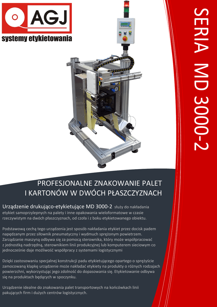 PROFESJONALNE ZNAKOWANIE PALET I KARTONÓW W DWÓCH PŁASZCZYZNACH Urządzenie drukująco-etykietujące MD 3000-2 służy do nakładania etykiet samoprzylepnych na palety i inne opakowania wieloformatowe w czasie rzeczywistym na dwóch płaszczyznach, od czoła i z boku etykietowanego obiektu. Podstawową cechą tego urządzenia jest sposób nakładania etykiet przez docisk padem napędzanym przez siłownik pneumatyczny i wydmuch sprężonym powietrzem. Zarządzanie maszyną odbywa się za pomocą sterownika, który może współpracować z jednostką nadrzędną, sterownikiem linii produkcyjnej lub komputerem sieciowym co jednocześnie daje możliwość współpracy z systemami logistycznymi Dzięki zastosowaniu specjalnej konstrukcji padu etykietującego opartego o sprężyście zamocowaną klapkę urządzenie może nakładać etykiety na produkty o różnych rodzajach powierzchni, wykorzystując jego zdolność do dopasowania się. Etykietowanie odbywa się na produktach będących w spoczynku. Urządzenie idealne do znakowania palet transportowych na końcówkach linii pakujących firm i dużych centrów logistycznych. DANE TECHNICZNE SERIA MD 3000-2 Maksymalna średnica roli Sterowanie Pneumatyka Zasilanie Pamięć Metoda druku Rozdzielczość druku Min. / Max. rozmiar etykiety Prędkość druku Interfejsy Dokładność naklejania Rodzaj aplikacji Drukowane kody 250 mm Siemens S7-200/S7-300 Festo / Bosch-Rexroth, zasilanie 10 bar 220-230V 50 Hz 10 programów etykietowania Termiczny / Termotransferowy 203 / 305 dpi 50x50 / 168x210 mm 150-300 mm/sek. IEEE 1284, RS-232C, USB, LAN, WLAN +/- 2mm Tamp/Blow (wybór z panelu operatora) Wszystkie popularne 1D , 2D, w tym EAN 13, EAN UCC128, SSCC OPCJE DODATKOWE - Czujnik produktu - Statyw montażowy - Czujnik kontroli końca roli - Czujnik produktu na łapie podającej - Sygnalizator świetlny - Czujnik ciśnienia zasilania powietrza - Weryfikator kodów paskowych - Obudowę pyłoszczelną Pro d u kt y p r zezn a czon e d o za et yk i eto wan i a p r zy p o m o cy u r ząd zen ia M D 3 00 0 - 2 Pan e l ster u jąc y gło w ic y Łap a u m oż l i wi aj ąca ap l iko wan ie et y ki et y n a ob iek t ul. Zakole 10 , 63-000 Środa Wlkp. Tel. +48 61 285 85 14 e-mail: [email protected] www.agj.com.pl