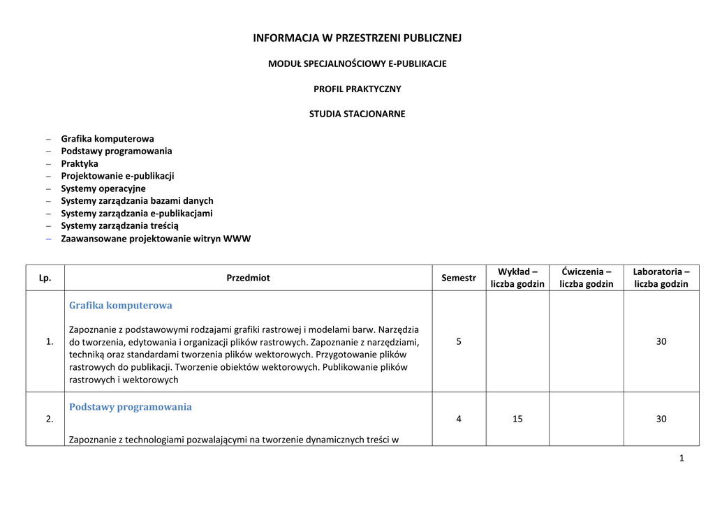 INFORMACJA W PRZESTRZENI PUBLICZNEJ MODUŁ SPECJALNOŚCIOWY E-PUBLIKACJE PROFIL PRAKTYCZNY STUDIA STACJONARNE Grafika komputerowa Podstawy programowania Praktyka Projektowanie e-publikacji Systemy operacyjne Systemy zarządzania bazami danych Systemy zarządzania e-publikacjami Systemy zarządzania treścią Zaawansowane projektowanie witryn WWW Lp. Przedmiot Semestr Wykład – liczba godzin Ćwiczenia – liczba godzin Laboratoria – liczba godzin Grafika komputerowa 1. Zapoznanie z podstawowymi rodzajami grafiki rastrowej i modelami barw. Narzędzia do tworzenia, edytowania i organizacji plików rastrowych. Zapoznanie z narzędziami, techniką oraz standardami tworzenia plików wektorowych. Przygotowanie plików rastrowych do publikacji. Tworzenie obiektów wektorowych. Publikowanie plików rastrowych i wektorowych 5 30 Podstawy programowania 2. 4 15 30 Zapoznanie z technologiami pozwalającymi na tworzenie dynamicznych treści w 1 aplikacjach internetowych; zapoznanie z technologiami dostępnymi po stronie serwera (PHP, MySQL), technologiami dostępnych po stronie przeglądarki internetowej (XHTML, CSS, JavaScript w tym AJAX); zapoznanie z zasadami tworzenia kodu, dzielenia aplikacji na warstwy oraz podstawowymi zasadami bezpieczeństwa i optymalizacji skryptów. Kształtowanie umiejętności tworzenia dynamicznych aplikacji internetowych. 3. Praktyka 3, 4, 5 450 Projektowanie e-publikacji 4. Zapoznanie z zasadami projektowania wydawnictw elektronicznych oraz formatami publikacji elektronicznych. Kształtowanie umiejętności obsługi aplikacji komputerowych wspierających tworzenie wydawnictw elektronicznych oraz umiejętności obsługi wtyczek wspierających tworzenie takich wydawnictw. 5 10 30 Systemy operacyjne 5. Zapoznanie z podstawami działania systemów operacyjnych oraz z praktycznymi elementami posługiwania się tekstowym i graficznym interfejsem użytkownika systemów Unix / Linux; zapoznanie z możliwościami administracji systemami Linux i Windows. Kształtowanie umiejętności pracy w systemie Linux w Windows w trybie tekstowym i w powłoce graficznej. 3 30 3, 4 45 Systemy zarządzania bazami danych 6. Zapoznanie z bardziej zaawansowanymi sposobami zarządzania bazami danych przy pomocy języków zapytań w tym języka SQL; zapoznanie z problemami ochrony integralności danych, bezpieczeństwa baz danych, wykorzystania funkcji, procedur i wyzwalaczy, zarządzaniem transakcjami oraz bardziej zaawansowanymi metodami projektowania baz danych; zapoznanie z narzędziami do tworzenia i zarządzania bazami danych w środowisku WWW. Kształtowanie umiejętności tworzenia złożonych struktur danych w relacyjnych bazach danych, tworzenia zapytań do bazy danych w 2 języku SQL, wykonywania podstawowych czynności administracyjnych w relacyjnych bazach danych. Systemy zarządzania e-publikacjami 7. W trakcie laboratoriów słuchacz poznaje zasady działania opartych na licencji Open Source systemów zarządzania e-publikacjami: Open Journal Systems oraz Open Monograph Press. Student poznaje architekturę tych systemów, zasady zgłaszania publikacji, recenzowania oraz publikowania dokumentów różnego typu. Laboratoria wprowadzają także w problematykę integracji tych narzędzi z innymi serwisami internetowymi, np. Google Scholar i WorldCat. Ponadto omawiane są inne narzędzia, np. PressBooks, służące do tworzenia i udostępniania dokumentów elektronicznych w popularnych systemach zarządzania treścią. 6 20 5, 6 35 5 30 Systemy zarządzania treścią 8. Zapoznanie z budową i typologią systemów zarządzania treścią oraz ze stosowanymi w nich standardami metadanych; poszerzenie wiedzy na temat architektury informacji w systemach zarządzania treścią. Kształtowanie umiejętności obsługi systemów zarządzania treścią opartych na licencji Open Source CMS-y (Drupal, Joomla, Wordpress) służących do budowy złożonych serwisów internetowych, takich jak serwisy blogowe czy systemy portalowe. Zapoznanie z kwestiami pozycjonowania witryn internetowych w rankingach internetowych wyszukiwarek. Zaawansowane projektowanie witryn WWW 9. Przekazanie podstawowej wiedzy na temat zaawansowanej technologii tworzenia stron WWW z wykorzystaniem języka PHP i baz danych MySQL; zapoznanie z narzędziami wspomagającymi tworzenie zaawansowanych witryn WWW; przekazanie podstawowych informacji na temat składni języka PHP oraz tworzenia i edycji baz danych. Kształtowanie umiejętności wykonania serwisu WWW opartego na PHP i MySQL. 3
