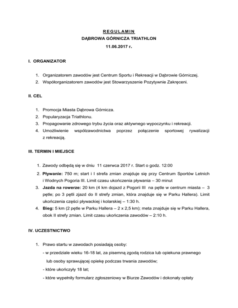 R EG UL AM I N DĄBROWA GÓRNICZA TRIATHLON 11.06.2017 r. I. ORGANIZATOR 1. Organizatorem zawodów jest Centrum Sportu i Rekreacji w Dąbrowie Górniczej. 2. Współorganizatorem zawodów jest Stowarzyszenie Pozytywnie Zakręceni. II. CEL 1. Promocja Miasta Dąbrowa Górnicza. 2. Popularyzacja Triathlonu. 3. Propagowanie zdrowego trybu życia oraz aktywnego wypoczynku i rekreacji. 4. Umożliwienie współzawodnictwa poprzez połączenie sportowej rywalizacji z rekreacją. III. TERMIN I MIEJSCE 1. Zawody odbędą się w dniu 11 czerwca 2017 r. Start o godz. 12:00 2. Pływanie: 750 m; start i I strefa zmian znajduje się przy Centrum Sportów Letnich i Wodnych Pogoria III. Limit czasu ukończenia pływania – 30 minut 3. Jazda na rowerze: 20 km (4 km dojazd z Pogorii III na pętle w centrum miasta – 3 pętle; po 3 pętli zjazd do II strefy zmian, która znajduje się w Parku Hallera). Limit ukończenia części pływackiej i kolarskiej – 1:30 h. 4. Bieg: 5 km (2 pętle w Parku Hallera – 2 x 2,5 km); meta znajduje się w Parku Hallera, obok II strefy zmian. Limit czasu ukończenia zawodów – 2:10 h. IV. UCZESTNICTWO 1. Prawo startu w zawodach posiadają osoby: - w przedziale wieku 16-18 lat, za pisemną zgodą rodzica lub opiekuna prawnego lub osoby sprawującej opiekę podczas trwania zawodów; - które ukończyły 18 lat; - które wypełniły formularz zgłoszeniowy w Biurze Zawodów i dokonały opłaty startowej; - w dniu startu potwierdzą swoją tożsamość (dokument ze zdjęciem) i podpiszą oświadczenie o braku przeciwwskazań zdrowotnych do startu. V. ZGŁOSZENIA 1. Zawodnicy dokonujący zgłoszenia do udziału w imprezie poprzez wypełnienie formularza zgłoszeniowego na stronach internetowych www.csir.pl, www.dgtriathlon.pl, http://zapisy.sts-timing.pl/122/ imprezy potwierdzają znajomość regulaminu i akceptują go oraz wyrażają zgodę na publikację ich wizerunku oraz imienia i nazwiska na materiałach promocyjnych i reklamowych organizatora w ramach promocji imprezy Dąbrowa Górnicza Triathlon. Wyrażają również zgodę na przetwarzanie swoich danych osobowych w zakresie niezbędnym do realizacji zawodów, w tym na wysyłanie pod wskazany adres e-mail informacji odnośnie imprezy i materiałów promocyjnych Organizatora. 2. Ostateczne zamknięcie listy startowej nastąpi w dniu 1 czerwca 2017 roku. Po tym terminie nie będą przyjmowane zgłoszenia do zawodów. 3. Organizator ustala limit 500 uczestników. VI. OPŁATA STARTOWA 1. Do 28.02.2017 – 90 zł 2. Do 30.04.2017 – 110 zł 3. Do 1.06.2017 – 130 zł 4. Dla sztafet obowiązuje stała opłata startowa – 90 zł (od osoby) przez cały okres trwania zapisów internetowych. 5. W przypadku rezygnacji z zawodów, po dokonaniu wpłaty, wpisowe nie podlega zwrotowi! 6. Opłatę należy dokonać na konto: Stowarzyszenie Pozytywnie Zakręceni Majewskiego 152, 42-530 Dąbrowa Górnicza Bank BGŻ 19 2030 0045 1110 0000 0394 4850 Tytuł przelewu: imię, nazwisko, triathlon lub triathlon sztafeta (jeśli zawodnik/zawodniczka dokonuje opłaty za start w sztafecie). VI. KLASYFIKACJE 1. Prowadzona będzie klasyfikacja: - kategoria Open Kobiet, - kategoria Open Mężczyzn, - kategorie wiekowe K 16-29; 30-39; 40-49; 50+, - kategorie wiekowe M 16-29; 30-39; 40-49; 50+, - klasyfikacja sztafet bez podziału na płeć i kategorie wiekowe. VII. NAGRODY 1. Zawodnicy w klasyfikacji Open Kobiet (za miejsca I-III), Open Mężczyzn (za miejsca I-III) otrzymają nagrody finansowe oraz trofea. 2. Zawodnicy uzyskujący miejsca I-III w kategoriach wiekowych otrzymają nagrody rzeczowe i trofea. 3. Pierwsze na mecie sztafety (miejsca I-III) otrzymają nagrody rzeczowe i trofea. 4. Nagrody w kategorii open i kategoriach wiekowych się „nie dublują.” 5. Odbiór nagród może nastąpić wyłącznie podczas kończącej zawody ceremonii wręczenia nagród. VIII. ŚWIADCZENIA DLA UCZESTNIKÓW 1. Startujący w ramach pakietu startowego otrzymują: - komplet numerów startowych (na koszulkę, kask i rower); w przypadku sztafet – jeden komplet na cały zespół, - pomiar elektroniczny (wyniki będą dostępne na stronie: www.csir.pl, www.dgtriathlon.pl oraz w biurze zawodów po zakończeniu rywalizacji), - czepek (w sztafetach, tylko pływak), - prawo do korzystania z punktów z wodą i napojami izo na trasie, - posiłek po zawodach, - koszulkę DG Triathlon, a po przekroczeniu linii mety również pamiątkowy medal. 2. Ubezpieczenie od nieszczęśliwych wypadków na czas trwania imprezy. 3. Zabezpieczenie medyczne i ratownicze. IX. POMIAR CZASU 1. Pomiar czasu elektroniczny – za pomocą chipów (do zwrotu za linią mety). Chip należy umieścić na nodze (nad kostką). 2. Zawodnicy sztafety przekazują sobie chip w strefie zmian. 3. Zawodnik, który przekroczy linię mety bez chipa musi zgłosić ten fakt sędziemu, w biurze zawodów lub ekipie obsługującej pomiar czasu. X. ZASADY ROZGRYWANIA ZAWODÓW 1. Trasa pływacka: Start z plaży przy Centrum Sportów Letnich i Wodnych Pogoria III. 2. Trasa kolarska: I strefa zmian zlokalizowana przy Centrum Sportów Letnich i Wodnych Pogoria III, 4 km dojazdu do pętli (pokonywana 3 razy, po 3 okrążeniu zjazd do II strefy zmian w Parku Hallera). Kask obowiązkowy! Dozwolone korzystanie z draftingu; nie dozwolone kierownice do jazdy na czas (lemondki), Nawierzchnia asfaltowa. Trasa zamknięta dla ruchu samochodowego. 3. Trasa biegowa: 2 x 2,5 km po Parku Hallera. Nawierzchnia asfaltowa i szutrowa. Meta w Parku Hallera, obok II strefy zmian. XI. POSTANOWIENIA KOŃCOWE 1. Biuro zawodów będzie się mieścić w Parku Hallera w Dąbrowie Górniczej. Odbiór pakietów startowych w biurze zawodów: 9:00-11:00. Obok biura zawodów i mety będzie zlokalizowana II strefa zmian. Pozostawienie rzeczy do części biegowej w godz. 9:00-11:00. Odbiór rowerów z II strefy zmian w godz. 14:00 – 15:00. 2. Wstawianie rowerów do I strefy zmian zlokalizowanej przy Centrum Sportów Letnich i Wodnych Pogor