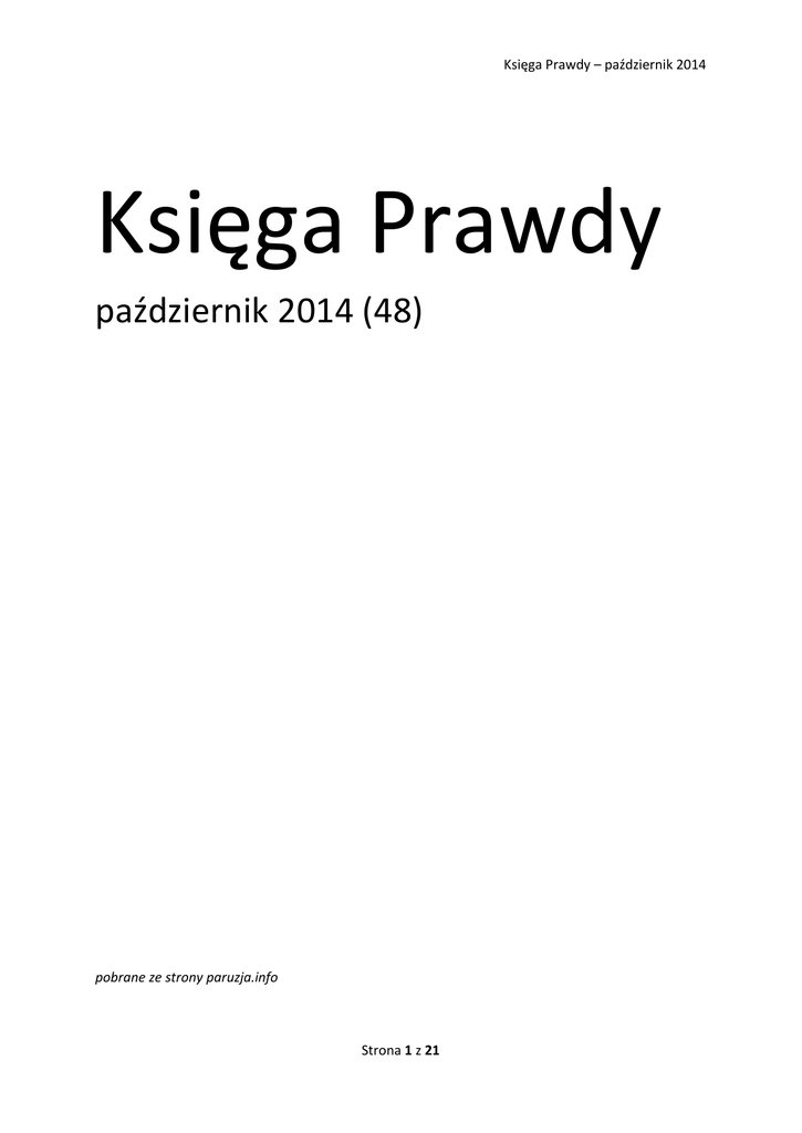 Księga Prawdy – październik 2014 Księga Prawdy październik 2014 (48) pobrane ze strony paruzja.info Strona 1 z 21 Księga Prawdy – październik 2014 01.10.2014, 21:15 - Albo będziecie służyli Bogu albo ulegniecie ludzkiej głupocie Moja szczerze umiłowana córko, wśród tych, którzy mówią, że Mi służą szerzy się zdrada wobec Mnie, Jezusa Chrystusa, Syna Człowieczego. Nawet ci, którzy mówią, że są Moimi wiernymi sługami, opuścili Mnie, a ich wiara jest ledwie przebłyskiem poprzedniego stanu. Co zaczęło się od miłości i współczucia dla Mnie, zostało zredukowane do ułamka tego, co było wcześniej, a zostało to spowodowane przez wiele rzeczy. Tak wielka pogarda dla Mojego Kościoła powstała z powodu upadłych dusz wewnątrz Kościoła, które zostały doprowadzone do ciężkiego grzechu. Wielu Moich niewinnych wyświęconych sług ucierpiało z powodu grzechów innych i przyniosło im to wiele wstydu. Potem, gdy Prawa Boże zostały zepchnięte na bok i prawie o nich się nie mówi, wielu zapomniało, że Przykazania Boże muszą być podtrzymywane za wszelką cenę. Gdyby Moi wyświęceni słudzy przestali głosić Prawdę i przestali przywiązywać znaczenie do mówienia o istnieniu grzechu, to wtedy skąd dzieci Boże mogłyby o tym wiedzieć? Moi wyświęceni słudzy mają moralny obowiązek stać na straży Słowa Bożego i ostrzegać dzieci Boże przed niebezpieczeństwem grzechu. Ale oni postanowili tego nie robić. Wielu boi się głosić Prawdę z obawy przed prześladowaniem przez tych, którzy będą ich winić za grzechy innych. W czasie Mojego czasu na ziemi nigdy nie wahałem się głosić o karach, które człowiek napotka, gdy nie będzie poszukiwał Bożego przebaczenia za swoje grzechy. Strach przed Bożą karą nie powinien być powodem unikania grzechu, ale tylko tak, wy grzesznicy możecie być zbawieni. Grzech to coś, z czym musicie żyć, ale nie wolno go wam akceptować. Musicie walczyć z nim, gdyż Ja pragnę ratować wasze dusze. Dlaczego nie miałbym pragnąć zbawienia waszych dusz bez względu na cenę? Czyż nie cierpiałem za was i nie umarłem w męczarniach na Krzyżu, abyście mogli być odkupieni w Bożych Oczach? Dlaczego więc Moi wyświęceni słudzy nie głoszą, że poszukiwanie życia wiecznego jest absolutną koniecznością? Jeśli nie poszukujecie życia wiecznego, to go nie znajdziecie. Obowiązkiem tych wszystkich, którzy Mi służą, jest pomóc uratować człowieka od wiecznego potępienia. Prawda jest ukrywana od tak długiego czasu, że wiele dusz, z powodu swojego samozadowolenia, zostało dla Mnie utraconych. Wiedzcie, że w dniu ostatecznym poślę najpierw Moich Aniołów i że ludzie zostaną podzieleni na dwie części - tych, którzy popełniali okrucieństwa i tych, którzy są Moi. Proszę was, Moi wyświęceni słudzy, abyście mówili Prawdę, bo jeśli tego nie będziecie robili, to utracicie dla Mnie wiele dusz, czego wam nigdy nie wybaczę. Albo będziecie służyli Bogu albo ulegniecie ludzkiej głupocie. Wasz Jezus 02.10.2014, 23:15 - Odłóżcie swoją zbroję, gdyż zostanie ona skruszona na drobne kawałki Moja szczerze umiłowana córko, Moi wrogowie mogą gardzić Moim Słowem - Prawdą - ale przyjdzie dzień, kiedy spuszczą oni głowy ze wstydu i wyrzutów sumienia, gdy staną przede Mną. W czasach Noego, on sam i ci, którzy zostali wybrani, by mu pomagać w przygotowaniu się na sprawiedliwość Boga, byli wyśmiewani. Drwiono z nich, prześladowano i podejmowano wszelkie próby zdyskredytowania polecenia danego Noemu przez Boga. Posłuszny do końca Noe błagał o miłosierdzie dla ich dusz. Zachęcał ich, by wraz z nim szukali schronienia, ale go ignorowali. I tak będzie aż do Wielkiego Dnia Pańskiego. Tylko reszta będzie gotowa, by powitać Mnie razem z tymi wszystkimi, którzy posłuchają serca i przyjmą Moje Miłosierdzie podczas Ostrzeżenia. Proszę wszystkich, którzy wierzą we Mnie i w Moją Obietnicę ponownego przyjścia w wielkiej chwale, aby modlili się za tych, którzy pogardzają tą Misją, wprawdzie otrzymali oni Dar Prawdy, ale zdecyStrona 2 z 21 Księga Prawdy – październik 2014 dowali się odrzucić Mi go w twarz. Wszyscy z ciepłymi i czułymi sercami i z pokorą w duszach, zostaną przyciągnięci w Moje Ramiona bez względu na swoją wiarę czy wyznanie, gdyż oni są Moi. Tym, którzy nie znają Słowa Bożego zostanie okazane wielkie miłosierdzie i ci, którzy nawrócą się podczas Ostrzeżenia również zamieszkają w Moich Ramionach. Dotrę do wszystkich dusz, których serca są ciepłe i które okazują miłość i miłosierdzie swoim braciom i siostrom. Największa walka będzie miała miejsce wtedy, gdy dotrę do aroganckich i dumnych, którym brak prawdziwej miłości i wielkoduszności. To za te dusze przynaglam was do modlitwy. Ale najbardziej was proszę, byście błagali o Moje Miłosierdzie za tych, którzy sprzedali swoje dusze diabłu z pełną świadomością tego, co zrobili. Oni nie przyjdą do Mnie z własnej woli i tylko dzięki cierpieniom wybranych dusz, które Mi się poświęciły i dzięki waszym własnym ofiarom, mogą być uratowani. Proszę, odmawiajcie tę modlitwę, aby uratować wszystkich grzeszników. Modlitwa Krucjaty (169) O zbawienie tych, którzy odrzucają Chrystusa Najdroższy Jezu, przez Twoje Współczucie i Miłosierdzie, błagam o uratowanie tych, którzy Cię odrzucili; Którzy zaprzeczają Twojemu Istnieniu; Którzy świadomie sprzeciwiają się Twojemu Świętemu Słowu i których gorzkie serca zatruły ich dusze przeciwko Światłu i Prawdzie Twojej Boskości. Zmiłuj się nad wszystkimi grzesznikami. Przebacz tym, którzy bluźnią przeciwko Trójcy Świętej i Pomóż mi na mój sposób i przez moje osobiste ofiary, zawrzeć w Twoich Kochających Ramionach tych grzeszników, którzy najbardziej potrzebują Twojego Miłosierdzia. Obiecuję Ci, poprzez moje myśli, czyny i wypowiadane sło