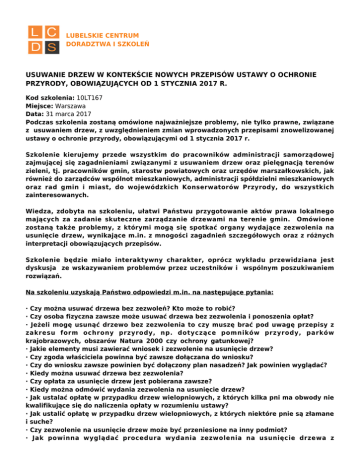 LUBELSKIE CENTRUM DORADZTWA I SZKOLEŃ USUWANIE DRZEW W KONTEKŚCIE NOWYCH PRZEPISÓW USTAWY O OCHRONIE PRZYRODY, OBOWIĄZUJĄCYCH OD 1 STYCZNIA 2017 R. Kod szkolenia: 10LT167 Miejsce: Warszawa Data: 31 marca 2017 Podczas szkolenia zostaną omówione najważniejsze problemy, nie tylko prawne, związane z usuwaniem drzew, z uwzględnieniem zmian wprowadzonych przepisami znowelizowanej ustawy o ochronie przyrody, obowiązującymi od 1 stycznia 2017 r. Szkolenie kierujemy przede wszystkim do pracowników administracji samorządowej zajmującej się zagadnieniami związanymi z usuwaniem drzew oraz pielęgnacją terenów zieleni, tj. pracowników gmin, starostw powiatowych oraz urzędów marszałkowskich, jak również do zarządców wspólnot mieszkaniowych, administracji spółdzielni mieszkaniowych oraz rad gmin i miast, do wojewódzkich Konserwatorów Przyrody, do wszystkich zainteresowanych. Wiedza, zdobyta na szkoleniu, ułatwi Państwu przygotowanie aktów prawa lokalnego mających za zadanie skuteczne zarządzanie drzewami na terenie gmin. Omówione zostaną także problemy, z którymi mogą się spotkać organy wydające zezwolenia na usunięcie drzew, wynikające m.in. z mnogości zagadnień szczegółowych oraz z różnych interpretacji obowiązujących przepisów. Szkolenie będzie miało interaktywny charakter, oprócz wykładu przewidziana jest dyskusja ze wskazywaniem problemów przez uczestników i wspólnym poszukiwaniem rozwiązań. Na szkoleniu uzyskają Państwo odpowiedzi m.in. na następujące pytania: · Czy można usuwać drzewa bez zezwoleń? Kto może to robić? · Czy osoba fizyczna zawsze może usuwać drzewa bez zezwolenia i ponoszenia opłat? · Jeżeli mogę usunąć drzewo bez zezwolenia to czy muszę brać pod uwagę przepisy z zakresu form ochrony przyrody, np. dotyczące pomników przyrody, parków krajobrazowych, obszarów Natura 2000 czy ochrony gatunkowej? · Jakie elementy musi zawierać wniosek i zezwolenie na usunięcie drzew? · Czy zgoda właściciela powinna być zawsze dołączana do wniosku? · Czy do wniosku zawsze powinien być dołączony plan nasadzeń? Jak powinien wyglądać? · Kiedy można usuwać drzewa bez zezwolenia? · Czy opłata za usunięcie drzew jest pobierana zawsze? · Kiedy można odmówić wydania zezwolenia na usunięcie drzew? · Jak ustalać opłatę w przypadku drzew wielopniowych, z których kilka pni ma obwody nie kwalifikujące się do naliczenia opłaty w rozumieniu ustawy? · Jak ustalić opłatę w przypadku drzew wielopniowych, z których niektóre pnie są złamane i suche? · Czy zezwolenie na usunięcie drzew może być przeniesione na inny podmiot? · Jak powinna wyglądać procedura wydania zezwolenia na usunięcie drzewa z nieruchomości o nieuregulowanym stanie prawnym? · Jak postępować w przypadku, gdy zagrażające upadkiem drzewo rośnie na działce o nieuregulowanym stanie prawnym, co robić w takiej sytuacji? · Jak powinna wyglądać procedura w przypadku usuwania drzew z rodzinnych ogrodów działkowych? · Nasadzenia zastępcze - jak postąpić, jeśli właściciel sprzedał działkę? · Jak określić kompensację przyrodniczą? · Czy nasadzenia mogą być w innym miejscu niż usuwane drzewa? · Jak postąpić w przypadku nieużytkowanej działki rolnej, na której wyrósł las? · Decyzje bez naliczania opłat – czy rekompensatą za usunięcie drzew mogą być krzewy nasadzone w odpowiednich ilościach? · Czy i kiedy można zwolnić rolnika z opłaty za wycinkę drzew na gruntach rolnych? · Kiedy można usunąć podtopione drzewa z obszaru objętego programem Natura 2000? · Jak postępować ze sprawami wszczętymi na starych przepisach? · Jak naliczyć karę administracyjną za drzewa usunięte przed wejściem w życie nowych przepisów? · Czy zawsze należy nakładać i pobierać kary za usunięcie drzew bez zezwolenia? · Jak postępować w sprawie usuwania drzew na gruntach rolnych, objętymi dopłatami? · Czy można przycinać gałęzie drzewa, które zacieniają mieszkanie? · W jakim zakresie można teraz przycinać koronę drzew? · Czy można wydać zezwolenie na usunięcie drzewa, które jest pomnikiem przyrody? · Czy można wydać zezwolenie na usunięcie drzewa, na którym są gniazda gawronów? · Co powinno być pierwsze: pozwolenie na budowę czy zezwolenie na usunięcie drzew? · Jakie ograniczenia w zakresie usuwania drzew może wprowadzić rada gminy? · Czy bez zezwolenia będzie można usuwać drzewa na terenach wpisanych do rejestru zabytków? W ramach materiałów szkoleniowych uczestnicy otrzymają także wzory pism: · Wniosek o wydanie zezwolenia na usunięcie drzew lub krzewów zagrażających funkcjonowaniu urządzeń przesyłowych · Wniosek o wydanie zezwolenia na usunięcie drzewa lub krzewu · Wzór zezwolenia na usunięcie drzew bez nasadzeń i opłat · Wzór zezwolenia na usunięcie drzew z opłatą i nasadzeniami · Wzór zezwolenia na usunięcie drzew lub krzewów zagrażających funkcjonowaniu urządzeń przesyłowych · Wzór zezwolenia na usunięcie drzew w pasie drogowym z nasadzeniem bez opłat · Wzór uchwały ustanawiającej pomnik przyrody · Spis wybranego orzecznictwa PROGRAM SZKOLENIA: 1. Omówienie różnic w przepisach z zakresu usuwania drzew obowiązujących do końca 2016 r. i od 1 stycznia 2017 r. 2. Podstawowe definicje; podmioty odpowiedzialne za ochronę drzew lub krzewów; organy wydające zezwolenie na usunięcie drzew 3. Strony postępowania: spółdzielnie i wspólnoty mieszkaniowe, współwłasność, posiadacz zależny, nieruchomości o nieuregulowanym stanie prawnym 4. Usuwanie drzew bez zezwolenia: omówienie rozszerzonego katalogu przypadków 5. Wymogi formalne wniosku o wydanie zezwolenia na usuwanie drzew i krzewów 6. Zakres decyzji zezwalającej na usunięcie drzew i krzewów 7. Nowe nasadzenia drzew jako kompensacja przyrodnicza 8. Usuwanie drzew w pasie drogowym 9. Usuwanie drzew wzdłuż kolei 10. Usuwanie drzew na