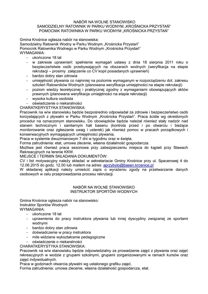 NABÓR NA WOLNE STANOWISKO SAMODZIELNY RATOWNIK W PARKU WODNYM „KROŚNICKA PRZYSTAŃ” POMOCNIK RATOWNIKA W PARKU WODNYM „KROŚNICKA PRZYSTAŃ” Gmina Krośnice ogłasza nabór na stanowiska: Samodzielny Ratownik Wodny w Parku Wodnym „Krośnicka Przystań” Pomocnik Ratownika Wodnego w Parku Wodnym „Krośnicka Przystań” WYMAGANIA: ukończone 18 lat w zakresie uprawnień: spełnienie wymagań ustawy z dnia 18 sierpnia 2011 roku o bezpieczeństwie osób przebywających na obszarach wodnych (weryfikacja na etapie rekrutacji – prosimy załączenie co CV kopii posiadanych uprawnień) bardzo dobry stan zdrowia umiejętność pływania co najmniej na poziomie wymaganym w rozporządzeniu dot. zakresu szkoleń Ratowników Wodnych (planowana weryfikacja umiejętności na etapie rekrutacji) poziom wiedzy teoretycznej i praktycznej zgodny z wymaganiami obowiązujących aktów prawnych (planowana weryfikacja umiejętności na etapie rekrutacji) wysoka kultura osobista oświadczenie o niekaralności CHARATKERYSTYKA STANOWISKA: Pracownik na w/w stanowisku będzie bezpośrednio odpowiadał za zdrowie i bezpieczeństwo osób korzystających z pływalni w Parku Wodnym „Krośnicka Przystań”. Praca ściśle wg określonych procedur na oznaczonym stanowisku. Do obowiązków będzie należał również stały nadzór nad stanem technicznym i sanitarnym hali basenu (kontrola przed i po otwarciu i bieżące monitorowanie oraz zgłaszanie uwag i usterek) jak również pomoc w pracach porządkowych i konserwacyjnych wymagających umiejętności pływania. Praca w systemie dwuzmianowym 7 dni w tygodniu oraz w święta. Forma zatrudnienia: etat, umowa zlecenie, własna działalność gospodarcza. Możliwa jest również praca sezonowa przy zabezpieczeniu miejsca do kąpieli przy Stawach Rekreacyjnych na terenie KKW. MIEJSCE I TERMIN SKŁADANIA DOKUMENTÓW: CV i list motywacyjny należy składać w sekretariacie Gminy Krośnice przy ul. Spacerowej 4 do 12.06.2015 do godz. 12.00 lub mailem na adres: [email protected] W składanej aplikacji należy umieścić zapis o wyrażeniu zgody na przetwarzanie danych osobowych w celu przeprowadzenia procesu rekrutacji. NABÓR NA WOLNE STANOWISKO INSTRUKTOR SPORTÓW WODNYCH Gmina Krośnice ogłasza nabór na stanowisko: Instruktor Sportów Wodnych WYMAGANIA: ukończone 18 lat uprawnienia do pracy instruktora pływania lub innej dyscypliny związanej ze sportami wodnymi bardzo dobry stan zdrowia doświadczenie w pracy instruktora mile widziane wykształcenie pedagogiczne oświadczenie o niekaralności CHARATKERYSTYKA STANOWISKA: Pracownik na w/w stanowisku będzie odpowiedzialny za prowadzenie zajęć z pływania oraz zajęć rekreacyjnych w wodzie z grupami szkolnymi, grupami zorganizowanymi w ramach kursów oraz zajęć indywidualnych. Praca w godzinach otwarcia pływalni wg ustalonego grafiku zajęć. Forma zatrudnienia: umowa zlecenie, własna działalność gospodarcza, etat. MIEJSCE I TERMIN SKŁADANIA DOKUMENTÓW: CV i list motywacyjny należy składać w sekretariacie Gminy Krośnice przy ul. Spacerowej 4 do 12.06.2015 do godz. 12.00 lub mailem na adres: [email protected] W składanej aplikacji należy umieścić zapis o wyrażeniu zgody na przetwarzanie danych osobowych w celu przeprowadzenia procesu rekrutacji. PARK WODNY „KROŚNICKA PRZYSTAŃ” OGŁASZA ZAPISY NA KURS UMOŻLIWIAJĄCY ZDOBYCIE UPRAWNIEŃ RATOWNIKA WODNEGO WYMAGANIA: - zamieszkanie na terenie Gminy Krośnice - bardzo dobry stan zdrowia - ukończone 18 lat - bardzo dobra umiejętność pływania (weryfikacja na wstępnym egzaminie przed kursem) - wysoki poziom kultury osobistej WARUNKI: - kurs odbędzie się w miesiącach czerwiec - lipiec 2015 pod warunkiem zebrania wymaganej ilości osób - kurs będzie odpłatny, dla najlepszych możliwość zatrudnienia w Parku Wodnym „Krośnicka Przystań” - możliwa refundacja kosztów pod warunkiem odpracowania po zakończonym kursie