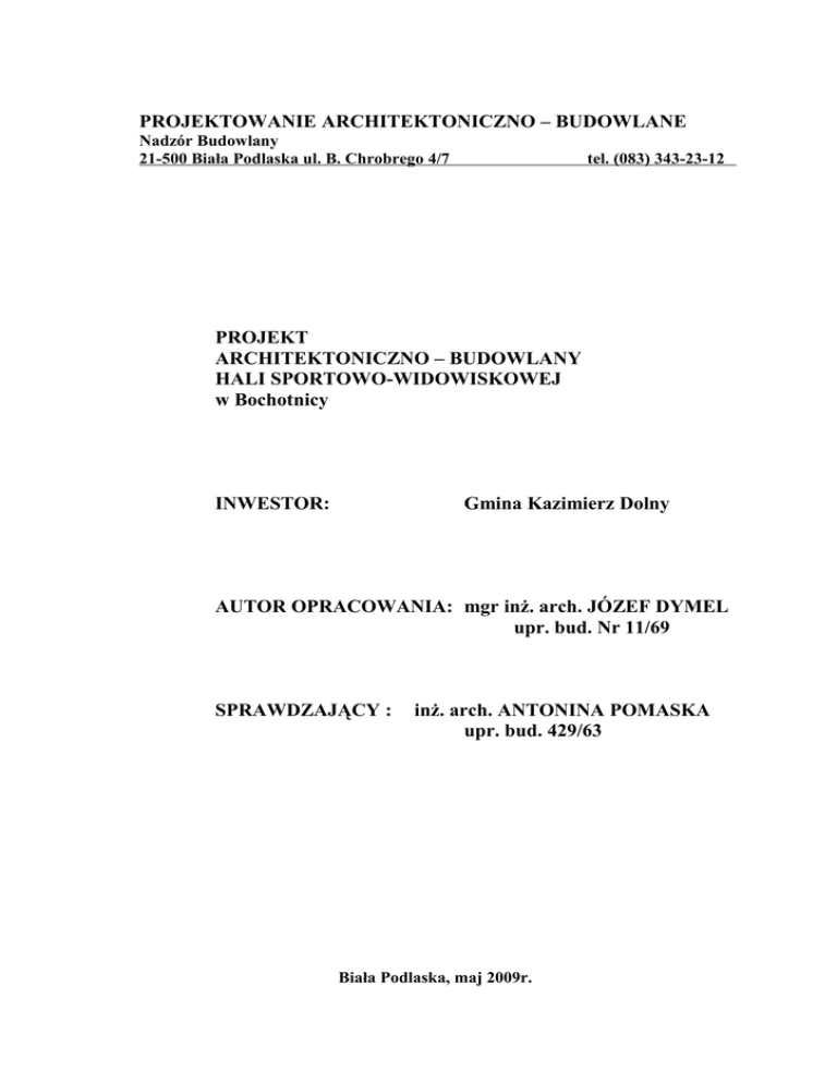 PROJEKTOWANIE ARCHITEKTONICZNO – BUDOWLANE Nadzór Budowlany 21-500 Biała Podlaska ul. B. Chrobrego 4/7 tel. (083) 343-23-12 PROJEKT ARCHITEKTONICZNO – BUDOWLANY HALI SPORTOWO-WIDOWISKOWEJ w Bochotnicy INWESTOR: Gmina Kazimierz Dolny AUTOR OPRACOWANIA: mgr inż. arch. JÓZEF DYMEL upr. bud. Nr 11/69 SPRAWDZAJĄCY : inż. arch. ANTONINA POMASKA upr. bud. 429/63 Biała Podlaska, maj 2009r. SPIS ZAWARTOŚCI 1. Strona tytułowa str. 1 2. Spis zawartości str. 2 3. Podkład geodezyjny 1:500 str. 3 4. Opis do planu zagospodarowania terenu str. 4-5 5. Plan zagospodarowania terenu 1:500 rys. nr 1 str. 6 6. Opis techniczny do projektu architektoniczno- budowlanego str. 7-16 7. Część rysunkowa - Rzut przyziemia cz. A 1:50 rys. nr 2 str. 17 - Rzut parteru cz. A 1:50 rys. nr 3 str. 18 - Rzut dachu cz. A 1:50 rys. nr 4 str. 19 - Rzut przyziemia cz. B 1:50 rys. nr 5 str. 20 - Rzut parteru cz. B 1:50 rys. nr 6 str. 21 - Rzut dachu cz. B 1:50 rys. nr 7 str. 22 - Przekrój A-A 1:50 rys. nr 8 str. 23 - Przekrój B-B 1:50 rys. nr 9 str. 24 - Przekrój C -C 1:20 rys. nr 10 str. 25 - Elewacja północno-zachodnia 1:100 rys. nr 11 str. 26 - Elewacja północno-wschodnia 1:100 rys. nr 12 str. 27 - Elewacja południowo-zachodnia 1:100 rys. nr 13 str. 28 - Elewacja południowo-wschodnia 1:100 rys. nr 14 str. 29 - Wykaz stolarki i ślusarki okiennej rys. nr 15 str. 30 - Wykaz stolarki i ślusarki drzwiowej rys. nr 16 str. 31 - Detal balustrady schodów rys. nr 17 str. 32 - Detal balustrady galerii widowni rys. nr 18 str. 33 - Detal okna dachowego rys. nr 19 str. 34 8. Oświadczenie projektanta i zaświadczenie uprawnień str. 35-37 9. Oświadczenie sprawdzającego i zaświadczenie uprawnień str. 38-40 2 10. Plan bezpieczeństwa i ochrony zdrowia str. 41-47 OPIS DO PLANU ZAGOSPODAROWANIA TERENU 1. ISTNIEJĄCE I PROJEKTOWANE ZAGOSPODAROWANIE TERENU Budynek istniejącej Szkoły Podstawowej w Bochotnicy usytuowany jest w odległości ok. 30,0 m od linii rozgraniczającej ulicy i ok. 5,0 m od granicy północno-wschodniej działki o nr geod. 291/3. Budynek od strony południowo-zachodniej – dwukondygnacyjny a od północno-wschodniej – parterowy. Dach istniejącej szkoły wielospadowy o kącie nachylenia połaci dachowych od 15°-18° , kryty blachą ocynkowaną na łatach i deskach. Obiekt o ścianach murowanych zewnętrznych grub. 65 cm ma parterze i 73 cm w przyziemiu. Strop nad poziomem parteru drewniany. Budynek wyposażony jest w instalację wodociągową, kanalizacyjną, centralnego ogrzewania z istniejącej kotłowni opalanej gazem ziemnym usytuowanej w przyziemiu. Ponadto budynek szkoły posiada instalację elektryczną i telefoniczną. Przez teren działki szkolnej przebiegają sieci kanalizacyjne, wodociągowe, gazowe, elektryczne i telefoniczne. Sieć kanalizacji sanitarnej Ks 200, w związku z lokalizacją hali, ulegnie częściowej przebudowie jak również na pewnym odcinku sieć wodociągowa. Pozostałe sieci na terenie działki nie ulegają zmianie. Plan zagospodarowania terenu przewiduje lokalizacje hali sportowo-widowiskowej wraz z zapleczem socjalnym od strony północno-zachodniej istniejącego budynku szkolnego. Obsługę komunikacyjną projektowanej hali z istniejącą szkołą zapewnia łącznik, który pomieści w poziomie przyziemia szatnie dla uczniów z węzłem sanitarnym, pokój trenera i magazyn sprzętu sportowego. Projektowana klatka schodowa zapewni dostęp uczniom z poziomu parteru istniejącej szkoły do poziomu przyziemia hali sportowej oraz nad galerię widokową. Pasaż komunikacyjny w poziomie parteru zapewni również dostęp do klas „0” (przedszkolnych). Projekt przewiduje w poziomie parteru modernizację częściową układu komunikacyjnego części przedszkolnej i dobudowę od strony północno- zachodniej dwóch klas lekcyjnych. 3 Dojście główne do projektowanej hali sportowo-widowiskowej – usytuowano od strony południowo-zachodniej. Projektowany poziom „0” obiektu został usytuowany na rzędnej 126,10 n.p.m., co nie pozwala na zwiększenie ilości robót ziemnych. W części północnowschodniej, w odległości ok. 4,0 m od projektowanego budynku hali należy zebrać od 0,5 - 1,0 m terenu celem usypania dodatkowej skarpy. 2. UZBROJENIE TERENU Zaopatrzenie w wodę projektowanego obiektu będzie realizowane z istniejącej sieci wodociągowej na terenie działki. Odprowadzenie ścieków do istniejącej sieci Ks - ∅ 200 mm, po przeróbce odcinków kolidujących z projektowaną halą oraz wykonaniem dodatkowych przyłączy. Zaopatrzenie w ciepło z istniejącej kotłowni gazowej po jej modernizacji Zasilanie w sieci telefoniczną - z istniejącej sieci na terenie szkoły. Odprowadzenie wód deszczowych – zewnętrznie po terenie działki. 3. BILANS TERENU Powierzchnia terenu w granicach opracowania Powierzchnia istniejącej zabudowy 6 360,00 m² 601,70 m² Powierzchnia projektowanej zabudowy 770,31 m² Powierzchnia istniejących dojść i dojazdów Powierzchnia projektowanych dojść i dojazdów Powierzchnia istniejącej i proj. zieleni 358,50 m² 1 150,00 m² 3 479,49 m² 4 OPIS TECHNICZNY do projektu architektoniczno-budowlanego hali sportowo-widowiskowej przy Szkole Podstawowej w Bochotnicy 1. PODSTAWA FORMALNO-PRAWNA 1.1. Umowa z inwestorem. 1.2. Dokumentacja geotechniczna o warunkach gruntowo-wodnych podłoża. 1.3. Podkład sytuacyjno-wysokościowy w skali 1:500 wykonany przez „Limes” Usługi Geodezyjno – Kartograficzne s.c. w Puławach, geod. upr. mgr inż. Szymon Popławski. 1.4. Inwentaryzacja istniejącego budynku szkoły. 1.5. Uzgodnienia z inwestorem. 2. DANE OGÓLNE Budynek w części mieszczącej halę sportowo-widowiskową parterowy a w części socjalnej dwukondygnacyjny, niepodpiwniczony usytuowany w północno-zachodniej części istniejącej szkoły. Pasaż łączący budynek istniejącej szkoły z projektowaną halą sportowo-widowiskową częściowo parterowy i dwukondygnacyjny. Budynek został zaprojektowany w konstrukcj