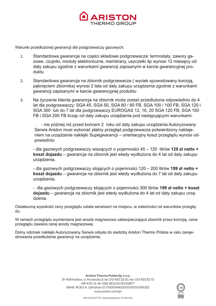 Warunki przedłużonej gwarancji dla podgrzewaczy gazowych: 1. Standardowa gwarancja na części składowe podgrzewacza: termostaty, zawory gazowe, czujniki, moduły elektroniczne, membrany, uszczelki itp wynosi 12 miesięcy od daty zakupu zgodnie z warunkami gwarancji zapisanymi w karcie gwarancyjnej produktu 2. Standardowa gwarancja na zbiornik podgrzewacza ( wyciek spowodowany korozją, pęknięciem zbiornika) wynosi 2 lata od daty zakupu urządzenia zgodnie z warunkami gwarancji zapisanymi w karcie gwarancyjnej produktu 3. Na życzenie klienta gwarancja na zbiornik może zostać przedłużona odpowiednio do 4 lat dla podgrzewaczy: SGA 45, SGA 50, SGA 80 / 80 FB, SGA 100 / 100 FB, SGA 120 i SGA 300 lub do 7 lat dla podgrzewaczy EUROGAS 12, 16, 20 SGA 120 FB, SGA 150 FB i SGA 200 FB licząc od daty zakupu urządzenia pod następującymi warunkami: - nie później niż przed końcem 2 roku od daty zakupu urządzenia Autoryzowany Serwis Ariston musi wykonać płatny przegląd podgrzewacza potwierdzony naklejeniem na urządzenie naklejki Supegwarancji – orientacyjny koszt przeglądu wynosi odpowiednio: - dla gazowych podgrzewaczy wiszących o pojemności 45 – 120 litrów 129 zł netto + koszt dojazdu – gwarancja na zbiornik jest wtedy wydłużona do 4 lat od daty zakupu urządzenia. - dla gazowych podgrzewaczy stojących o pojemności 120 – 200 litrów 199 zł netto + koszt dojazdu – gwarancja na zbiornik jest wtedy wydłużona do 7 lat od daty zakupu urządzenia. - dla gazowych podgrzewaczy stojących o pojemności 300 litrów 199 zł netto + koszt dojazdu – gwarancja na zbiornik jest wtedy wydłużona do 4 lat od daty zakupu urządzenia. Ostateczną wysokość ceny przeglądu ustala serwisant na miejscu, w zależności od warunków przeglądu. W ramach przeglądu wymieniana jest anoda magnezowa zabezpieczająca zbiornik przez korozją, cena przeglądu zawiera cenę anody magnezowej. Dolny odcinek naklejki Autoryzowany Serwis odsyła do siedziby Ariston Thermo Polska w celu zarejestrowania przedłużenia gwarancji na urządzenie. Ariston Thermo Polska Sp. z o.o. 31-408 Kraków, ul. Pocieszka 3; tel. 012 420 22 20, fax: 012 420 52 72 NIP 676-13-45-098; REGON 351123877 BANK: RCB S.A. O/Kraków 12-175010480000000001081322 www.ariston.com/pl KRS 0000007774 , Kapitał zakładowy: 12 000 000