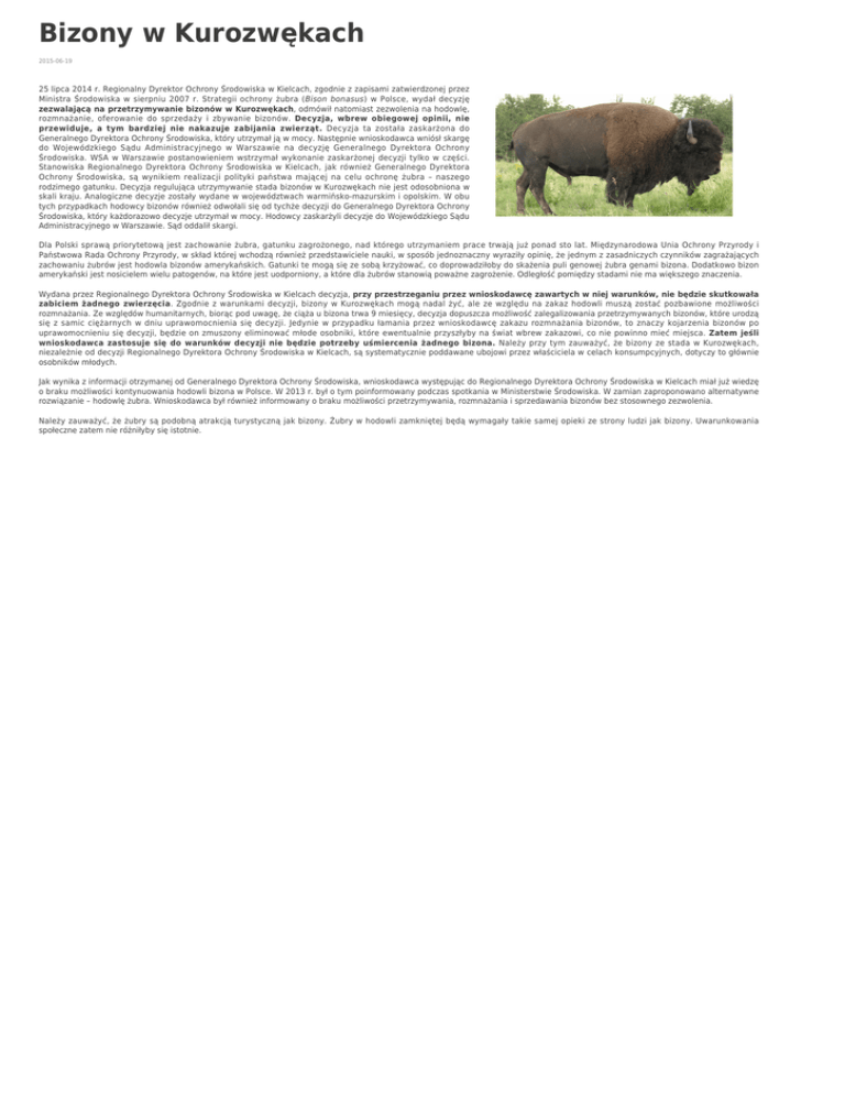 Bizony w Kurozwękach 2015-06-19 25 lipca 2014 r. Regionalny Dyrektor Ochrony Środowiska w Kielcach, zgodnie z zapisami zatwierdzonej przez Ministra Środowiska w sierpniu 2007 r. Strategii ochrony żubra (Bison bonasus) w Polsce, wydał decyzję zezwalającą na przetrzymywanie bizonów w Kurozwękach, odmówił natomiast zezwolenia na hodowlę, rozmnażanie, oferowanie do sprzedaży i zbywanie bizonów. Decyzja, wbrew obiegowej opinii, nie przewiduje, a tym bardziej nie nakazuje zabijania zwierząt. Decyzja ta została zaskarżona do Generalnego Dyrektora Ochrony Środowiska, który utrzymał ją w mocy. Następnie wnioskodawca wniósł skargę do Wojewódzkiego Sądu Administracyjnego w Warszawie na decyzję Generalnego Dyrektora Ochrony Środowiska. WSA w Warszawie postanowieniem wstrzymał wykonanie zaskarżonej decyzji tylko w części. Stanowiska Regionalnego Dyrektora Ochrony Środowiska w Kielcach, jak również Generalnego Dyrektora Ochrony Środowiska, są wynikiem realizacji polityki państwa mającej na celu ochronę żubra – naszego rodzimego gatunku. Decyzja regulująca utrzymywanie stada bizonów w Kurozwękach nie jest odosobniona w skali kraju. Analogiczne decyzje zostały wydane w województwach warmińsko-mazurskim i opolskim. W obu tych przypadkach hodowcy bizonów również odwołali się od tychże decyzji do Generalnego Dyrektora Ochrony Środowiska, który każdorazowo decyzje utrzymał w mocy. Hodowcy zaskarżyli decyzje do Wojewódzkiego Sądu Administracyjnego w Warszawie. Sąd oddalił skargi. Dla Polski sprawą priorytetową jest zachowanie żubra, gatunku zagrożonego, nad którego utrzymaniem prace trwają już ponad sto lat. Międzynarodowa Unia Ochrony Przyrody i Państwowa Rada Ochrony Przyrody, w skład której wchodzą również przedstawiciele nauki, w sposób jednoznaczny wyraziły opinię, że jednym z zasadniczych czynników zagrażających zachowaniu żubrów jest hodowla bizonów amerykańskich. Gatunki te mogą się ze sobą krzyżować, co doprowadziłoby do skażenia puli genowej żubra genami bizona. Dodatkowo bizon amerykański jest nosicielem wielu patogenów, na które jest uodporniony, a które dla żubrów stanowią poważne zagrożenie. Odległość pomiędzy stadami nie ma większego znaczenia. Wydana przez Regionalnego Dyrektora Ochrony Środowiska w Kielcach decyzja, przy przestrzeganiu przez wnioskodawcę zawartych w niej warunków, nie będzie skutkowała zabiciem żadnego zwierzęcia. Zgodnie z warunkami decyzji, bizony w Kurozwękach mogą nadal żyć, ale ze względu na zakaz hodowli muszą zostać pozbawione możliwości rozmnażania. Ze względów humanitarnych, biorąc pod uwagę, że ciąża u bizona trwa 9 miesięcy, decyzja dopuszcza możliwość zalegalizowania przetrzymywanych bizonów, które urodzą się z samic ciężarnych w dniu uprawomocnienia się decyzji. Jedynie w przypadku łamania przez wnioskodawcę zakazu rozmnażania bizonów, to znaczy kojarzenia bizonów po uprawomocnieniu się decyzji, będzie on zmuszony eliminować młode osobniki, które ewentualnie przyszłyby na świat wbrew zakazowi, co nie powinno mieć miejsca. Zatem jeśli wnioskodawca zastosuje się do warunków decyzji nie będzie potrzeby uśmiercenia żadnego bizona. Należy przy tym zauważyć, że bizony ze stada w Kurozwękach, niezależnie od decyzji Regionalnego Dyrektora Ochrony Środowiska w Kielcach, są systematycznie poddawane ubojowi przez właściciela w celach konsumpcyjnych, dotyczy to głównie osobników młodych. Jak wynika z informacji otrzymanej od Generalnego Dyrektora Ochrony Środowiska, wnioskodawca występując do Regionalnego Dyrektora Ochrony Środowiska w Kielcach miał już wiedzę o braku możliwości kontynuowania hodowli bizona w Polsce. W 2013 r. był o tym poinformowany podczas spotkania w Ministerstwie Środowiska. W zamian zaproponowano alternatywne rozwiązanie – hodowlę żubra. Wnioskodawca był również informowany o braku możliwości przetrzymywania, rozmnażania i sprzedawania bizonów bez stosownego zezwolenia. Należy zauważyć, że żubry są podobną atrakcją turystyczną jak bizony. Żubry w hodowli zamkniętej będą wymagały takie samej opieki ze strony ludzi jak bizony. Uwarunkowania społeczne zatem nie różniłyby się istotnie.