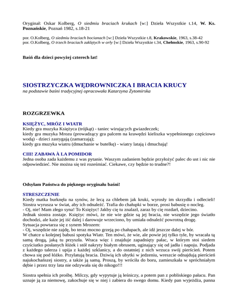 Oryginał: Oskar Kolberg, O siedmiu braciach krukach [w:] Dzieła Wszystkie t.14, W. Ks. Poznańskie, Poznań 1982, s.18-21 por. O.Kolberg, O siedmiu braciach bocianach [w:] Dzieła Wszystkie t.8, Krakowskie, 1963, s.38-42 por. O.Kolberg, O trzech braciach zaklętych w orły [w:] Dzieła Wszystkie t.34, Chełmskie, 1963, s.90-92 Baśń dla dzieci powyżej czterech lat! SIOSTRZYCZKA WĘDROWNICZKA I BRACIA KRUCY na podstawie baśni tradycyjnej opracowała Katarzyna Żytomirska ROZGRZEWKA KSIĘŻYC, MRÓZ I WIATR Kiedy gra muzyka Księżyca (trójkąt) - taniec wirujących gwiazdeczek; kiedy gra muzyka Mrozu (prowadzący gra palcem na krawędzi kieliszka wypełnionego częściowo wodą) - dzieci zastygają (zamarzają); kiedy gra muzyka wiatru (dmuchanie w butelkę) - wiatry latają i dmuchają! CIII! ZABAWA À LA POMIDOR Jedna osoba zada każdemu z was pytanie. Waszym zadaniem będzie przyłożyć palec do ust i nic nie odpowiedzieć. Nie można się też roześmiać. Ciekawe, czy będzie to trudne?! Odsyłam Państwa do pięknego oryginału baśni! STRESZCZENIE Kiedy matka burknęła na synów, że lecą za chlebem jak kruki, wyrosły im skrzydła i odlecieli! Siostra wyrusza w świat, aby ich odnaleźć. Trafia do chałupki w borze, prosi babusię o nocleg. - Oj, nie! Mam złego syna! To Księżyc! Jakby cię tu znalazł, zaraz by cię rozdarł, dziecino. Jednak siostra zostaje. Księżyc mówi, że nie wie gdzie są jej bracia, nie wszędzie jego światło dochodzi, ale każe jej iść dalej i darowuje wrzeciono, by umiała odnaleźć powrotną drogę. Sytuacja powtarza się z synem Mrozem: - Oj, wszędzie nie zajdę, bo teraz mocno grzeją po chałupach, ale idź jeszcze dalej w bór. W chatce u kolejnej babusi spotyka Wiatr. Ten mówi, że wie, ale powie jej tylko tyle, by wracała tą samą drogą, jaką tu przyszła. Wraca więc i znajduje zapadnięty pałac, w którym stoi siedem czyściutko posłanych łóżek i stół nakryty białym obrusem, uginający się od jadła i napoju. Podjada z każdego talerza i upija z każdej szklanicy, a do ostatniej z nich wrzuca swój pierścień. Potem chowa się pod łóżko. Przylatują bracia. Dziwią ich ubytki w jedzeniu, wreszcie odnajdują pierścień najukochańszej siostry, a także ją samą. Proszą, by wróciła do boru, zamieszkała w spróchniałym dębie i przez trzy lata nie odzywała się do nikogo!!! Siostra spełnia ich prośbę. Milczy, gdy wypytuje ją leśniczy, a potem pan z pobliskiego pałacu. Pan uznaje ją za niemowę, zakochuje się w niej i zabiera do swego domu. Kiedy pan wyjeżdża, panna rodzi dwóch synków, ale teściowa wrzuca dzieci do rzeki, a zamiast nich podkłada pieska i świnkę. Potem oskarża pannę o rodzenie zwierząt zamiast ludzi. Ma ją spotkać sroga kara, ale zjawia się siedmiu panów na koniach. Są to jej bracia, już odczarowani, którzy oddają jej uratowanych przez siebie synków. Zła matka zostaje ukarana, dzielna panna odzyskuje mowę i żyją wszyscy szczęśliwie. TEATR CIENI Tę baśń proponuję w piękny sposób przeżyć z dziećmi za pomocą Teatru Cieni. Najpierw opowiadamy ją dzieciom w całości, a potem... do pracy! DZIELIMY ROLE 7 braci 7 kruków siostrzyczka Matka Księżyca Księżyc Matka Mrozu Mróz Matka Wiatru Wiatr Leśniczy Młodzieniec 7 koni 2 dzieci świnka piesek Zła Matka - jej lalkę animuje prowadzący. Negatywnych ról nie powinny odgrywać dzieci!! KRÓLESTWO PLASTYKI Pokazujemy dzieciom gotowy model (np. Złej Matki, która będzie naszą rolą), żeby zobaczyły specyfikę laleczki z naszego Teatru Cieni. Dziecko rysuje wybraną postać, wycina ją ze sztywnej kartki i przykleja do patyczka. NAUKA ANIMACJI Szykujemy małą scenkę - ekran np. z prześcieradła, podświetlony lampą. Pokazujemy dzieciom jak animować laleczkę, by była dobrze widoczna dla widzów. Dzieci uczą się prostej animacji. TEATR CIENI Na początek gramy na instrumencie lub włączamy muzykę, by wprowadzić nastrój, skupić i wyciszyć dzieci. Opowiadamy baśń od początku, a dzieci, odpowiednio do wydarzeń w baśni, wchodzą za kotarkę i animują swoje postaci. Te, które nie biorą udziału w odgrywanych aktualnie scenkach, są widzami. TANIEC FIGUREK NA DOBRY KONIEC Kiedy baśń szczęśliwie dobiega końca - włączamy wesołą muzykę i zapraszamy wszystkie figurki do tańca!
