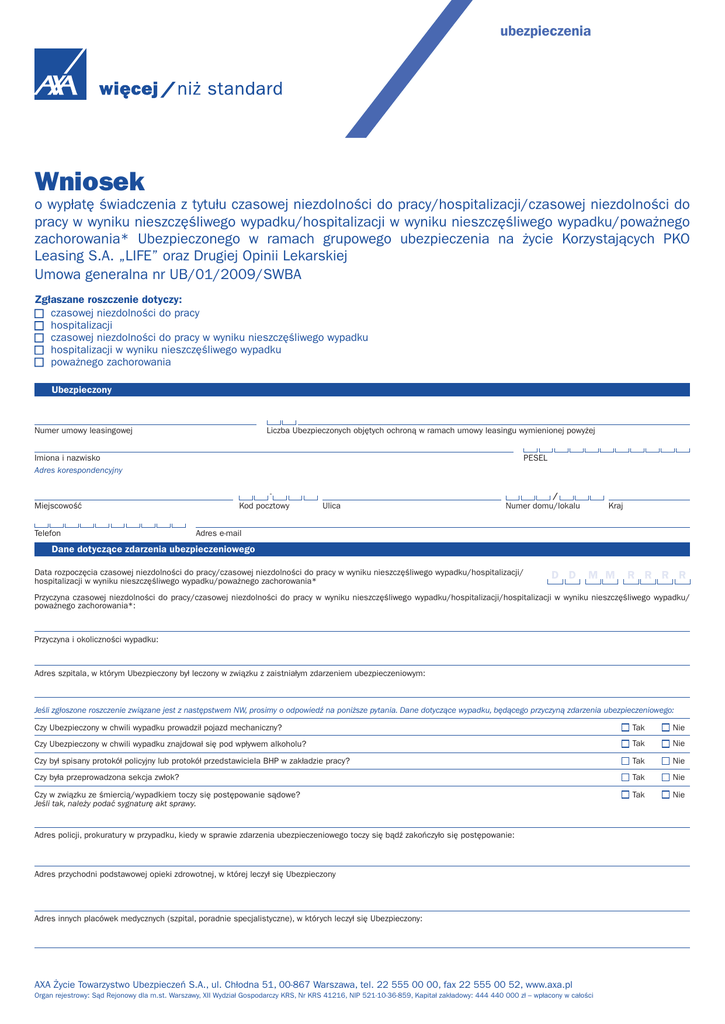 ubezpieczenia Wniosek o wypłatę świadczenia z tytułu czasowej niezdolności do pracy/hospitalizacji/czasowej niezdolności do pracy w wyniku nieszczęśliwego wypadku/hospitalizacji w wyniku nieszczęśliwego wypadku/poważnego zachorowania* Ubezpieczonego w ramach grupowego ubezpieczenia na życie Korzystających PKO Leasing S.A. „LIFE” oraz Drugiej Opinii Lekarskiej Umowa generalna nr UB/01/2009/SWBA Zgłaszane roszczenie dotyczy: czasowej niezdolności do pracy hospitalizacji czasowej niezdolności do pracy w wyniku nieszczęśliwego wypadku hospitalizacji w wyniku nieszczęśliwego wypadku poważnego zachorowania Ubezpieczony Numer umowy leasingowej Liczba Ubezpieczonych objętych ochroną w ramach umowy leasingu wymienionej powyżej PESEL Imiona i nazwisko Adres korespondencyjny Miejscowość Telefon Kod pocztowy Ulica / Numer domu/lokalu Kraj Adres e-mail Dane dotyczące zdarzenia ubezpieczeniowego Data rozpoczęcia czasowej niezdolności do pracy/czasowej niezdolności do pracy w wyniku nieszczęśliwego wypadku/hospitalizacji/ hospitalizacji w wyniku nieszczęśliwego wypadku/poważnego zachorowania* D D M M R R R R Przyczyna czasowej niezdolności do pracy/czasowej niezdolności do pracy w wyniku nieszczęśliwego wypadku/hospitalizacji/hospitalizacji w wyniku nieszczęśliwego wypadku/ poważnego zachorowania*: Przyczyna i okoliczności wypadku: Adres szpitala, w którym Ubezpieczony był leczony w związku z zaistniałym zdarzeniem ubezpieczeniowym: Jeśli zgłoszone roszczenie związane jest z następstwem NW, prosimy o odpowiedź na poniższe pytania. Dane dotyczące wypadku, będącego przyczyną zdarzenia ubezpieczeniowego: Czy Ubezpieczony w chwili wypadku prowadził pojazd mechaniczny? Tak Nie Czy Ubezpieczony w chwili wypadku znajdował się pod wpływem alkoholu? Tak Nie Czy był spisany protokół policyjny lub protokół przedstawiciela BHP w zakładzie pracy? Tak Nie Czy była przeprowadzona sekcja zwłok? Tak Nie Czy w związku ze śmiercią/wypadkiem toczy się postępowanie sądowe? Jeśli tak, należy podać sygnaturę akt sprawy. Tak Nie Adres policji, prokuratury w przypadku, kiedy w sprawie zdarzenia ubezpieczeniowego toczy się bądź zakończyło się postępowanie: Adres przychodni podstawowej opieki zdrowotnej, w której leczył się Ubezpieczony Adres innych placówek medycznych (szpital, poradnie specjalistyczne), w których leczył się Ubezpieczony: AXA Życie Towarzystwo Ubezpieczeń S.A., ul. Chłodna 51, 00-867 Warszawa, tel. 22 555 00 00, fax 22 555 00 52, www.axa.pl Organ rejestrowy: Sąd Rejonowy dla m.st. Warszawy, XII Wydział Gospodarczy KRS, Nr KRS 41216, NIP 521-10-36-859, Kapitał zakładowy: 444 440 000 zł – wpłacony w całości Osoba zgłaszająca roszczenie Imiona i nazwisko Telefon Adres e-mail Adres korespondencyjny Kod pocztowy Miejscowość / Numer domu/lokalu Ulica Kraj Odbiór świadczenia W przypadku osób prawnych Telefon Uposażony/Uprawniony* do odbioru świadczenia (nazwa, REGON) Zgodnie z ustawą o przeciwdziałaniu praniu pieniędzy i finansowaniu terroryzmu Towarzystwo jest zobowiązane zidentyfikować beneficjenta rzeczywistego. Jeżeli istnieje taka osoba prosimy zaznaczyć jedną z poniższych opcji: osoba fizyczna będąca właścicielem osoby prawnej uprawnionej do otrzymania środków osoba fizyczna posiadająca więcej niż 25% udziałów/akcji/głosów w zgromadzeniu wspólników w osobie prawnej uprawnionej do otrzymania środków (np. udziałowiec posiadający więcej niż 25% udziałów w danej spółce) PESEL Imiona i nazwisko Kod pocztowy Miejscowość / Numer domu/lokalu Ulica Kraj W przypadku osób fizycznych Uposażony/Uprawniony* do odbioru świadczenia (imię i nazwisko) Telefon PESEL lub data urodzenia Stopień pokrewieństwa Adres korespondencyjny Udział procentowy Seria i numer dokumentu tożsamości Kod pocztowy Miejscowość Ulica dowód osobisty paszport inny (podać jaki) / Numer domu/lokalu Kraj Forma wypłaty świadczenia Przelew bankowy Właściciel rachunku bankowego Adres właściciela rachunku bankowego Numer rachunku bankowego Przekaz pocztowy Adres Oświadczam, że powyższe informacje są zgodne z prawdą. D D M M R R R R Miejscowość Data Podpis osoby zgłaszającej roszczenie Oświadczenia Ja niżej podpisany(a) wyrażam zgodę na przetwarzanie moich danych osobowych przez AXA Życie Towarzystwo Ubezpieczeń S.A., z siedzibą w Warszawie (00-867) przy ul. Chłodnej 51 (Towarzystwo), oraz przez podmioty z Grupy AXA świadczące usługi na rzecz Towarzystwa, do celów związanych z obsługą zgłoszonego roszczenia oraz do celów archiwalnych. Zostałem(am) poinformowany(a) o tym, że AXA Życie Towarzystwo Ubezpieczeń S.A. jest administratorem moich danych osobowych. Niniejszym oświadczam, że jestem świadomy(a), iż podanie moich danych osobowych jest dobrowolne oraz że mam prawo wglądu do moich danych osobowych oraz prawo ich poprawiania, jak również prawo do wniesienia pisemnego, umotywowanego żądania zaprzestania przetwarzania moich danych ze względu na szczególną sytuację oraz wniesienia sprzeciwu wobec przetwarzania moich danych. Ja niżej podpisany(a) zgadzam się, aby pisemne oświadczenia lekarzy, którzy leczyli i opiekowali się mną, oraz wszystkie inne wymagane dokumenty stanowiły i tworzyły część niniejszej dokumentacji ubezpieczeniowej. Niniejszym upoważniam każdego lekarza, szpital, placówkę medyczną, właściwy ZUS, towarzystwo ubezpieczeniowe lub osobę, która posiada dane o moim stanie zdrowia, do udzielenia informacji i udostępnienia kopii dokumentacji związanych z przebytymi przeze mnie chorobami, pobytami w szpitalu, wynikami badań, poradniami lub diagnozą medyczną oraz leczeniem. Wyrażam zgodę na przekazywanie Towarzystwu przez Narodowy Fundusz Zdrowia danych o nazwach i adresach świadczeniobiorców, którzy udzielili mi świadczeń opieki zdrowotnej w związku z wypadkiem lub zdarzeniem losowym, będącym podstawą usta