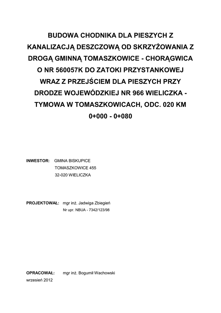 BUDOWA CHODNIKA DLA PIESZYCH Z KANALIZACJĄ DESZCZOWĄ OD SKRZYŻOWANIA Z DROGĄ GMINNĄ TOMASZKOWICE - CHORĄGWICA O NR 560057K DO ZATOKI PRZYSTANKOWEJ WRAZ Z PRZEJŚCIEM DLA PIESZYCH PRZY DRODZE WOJEWÓDZKIEJ NR 966 WIELICZKA TYMOWA W TOMASZKOWICACH, ODC. 020 KM 0+000 - 0+080 INWESTOR: GMINA BISKUPICE TOMASZKOWICE 455 32-020 WIELICZKA PROJEKTOWAŁ: mgr inż. Jadwiga Zbiegień Nr upr. NBUA - 7342/123/98 OPRACOWAŁ: wrzesień 2012 mgr inż. Bogumił Wachowski SPIS TREŚCI: 1. PODSTAWA OPRACOWANIA, ZAKRES I DANE OGÓLNE 2. OPIS STANU ISTNIEJĄCEGO 2.1. PLAN SYTUACYJNY 2.2. PRZEKROJE TYPOWE I ODWODNIENIE 2.3. WARUNKI GRUNTOWO - WODNE 3. ROZWIĄZANIA PROJEKTOWE 3.1. PLAN SYTUACYJNY 3.2. ZJAZDY 3.3. PRZEKROJE TYPOWE 4. ODWODNIENIE 4.1. ILOŚĆ ODPROWADZANYCH ŚCIEKÓW Z TERENU INWESTYCJI 4.2. MATERIAŁY 4.3. ORGANIZACJA ROBÓT PRZY ODWODNIENIU 5. INFORMACJE I DANE O CHARAKTERZE ORAZ CECHACH ISTNIEJĄCYCH I PRZEWIDYWANYCH ZAGROŻEŃ DLA ŚRODOWISKA 1. PODSTAWA OPRACOWANIA, ZAKRES I DANE OGÓLNE Przedmiotem projektu jest przedsięwzięcie polegające na budowie chodnika wraz z budową kanalizacji opadowej przy drodze wojewódzkiej nr 966 w miejscowości Tomaszkowice, gm. Biskupice, woj. małopolskie. Zakres opracowania obejmuje, zaprojektowanie chodnika o łącznej długości ok. 81mb, przebudowy istniejących zjazdów do posesji, budowę elementów odwodnienia w postaci kanalizacji grawitacyjnej, opadowej wraz ze studniami rewizyjnymi oraz studzienkami wodościekowymi oraz umocnienie rowu drogowego na odc. za wylotem kolektora kanalizacji deszczowej. Podstawę opracowania stanową następujące dokumenty i materiały: Pomiary geodezyjne Mapa sytuacyjno-wysokościowa w skali 1:500 Normy wytyczne i literatura branżowa Wizje w terenie Projekt wykonano zgodnie z Rozporządzeniem MTiGM z dn. 02.03.1999 w sprawie warunków technicznych jakim powinny odpowiadać drogi publiczne i ich usytuowanie (Dz. U. Nr 43 poz.430). 2. OPIS STANU ISTNIEJĄCEGO 2.1. Plan sytuacyjny Projektowana inwestycja zlokalizowana jest w miejscowości Tomaszkowice, gm. Biskupice, w województwie małopolskim. Trasa projektowanego chodnika przebiega w terenie zabudowanym. Szerokość jezdni drogi wynosi od 6,15m do 7,0m. W obrębie pasa drogowego odbywa się ruch kołowy oraz ruch pieszych. Celem niniejszego opracowania jest nadanie odpowiednich parametrów technicznych budowli drogowej, trwałe rozgraniczenie ruchu pieszego i kołowego, poprawa bezpieczeństwa w rejonie istniejących zatok autobusowych, estetyki pasa drogowego, sprawne odwodnienie powierzchni projektowanych i pasa drogowego. Teren pod budowę projektowanego chodnika stanowi jezdnia, pobocze drogi powiatowej oraz użytki zielone (teren pasa drogowego). 2.2. Przekroje typowe i odwodnienie W stanie istniejącym droga na projektowanym odcinku posiada przekrój poprzeczny jednojezdniowy, z dwoma pasami ruchu, o szerokości jezdni od 6,15m do 7,0m. Wzdłuż analizowanej drogi występują zjazdy do posesji prywatnych o nawierzchni utwardzonej. Odwodnienie drogi zrealizowane jest poprzez spadki podłużne i poprzeczne jezdni, następnie rowy przydrożne oraz istniejącą kanalizację deszczową. 2.3. Warunki gruntowo - wodne Ze względu na rodzaj inwestycji i występowanie prostych warunków geologicznych, określonych na podstawie opinii geotechnicznej, zakwalifikowano obiekt do I kategorii geotechnicznej zgodnie z rozporządzeniem Ministra Spraw Wewnętrznych i Administracji z dnia 24 września 1998 r. (Dz.U.Nr 126, poz.839) oraz z Rozporządzeniem Ministra Transportu, Budownictwa i Gospodarki Morskiej w sprawie ustalania geotechnicznych warunków posadowienia obiektów budowlanych z dnia 25 kwietnia 2012 r. (Dz.U. z 2012 poz. 463). Podłoże dla proj. chodnika zakwalifikowano do grupy nośności podłoża G2. 3. ROZWIĄZANIA PROJEKTOWE 3.1. Plan sytuacyjny Projektowany chodnik zlokalizowany będzie jako prawostronny. Zajmował będzie działkę pasa drogowego nr ewid. dz. 114 w miejscowości Tomaszkowice. Projektowany chodnik posiada szerokość 2,0m, wliczając obrzeże betonowe 8x30 oraz krawężnik betonowy o wym. 20x30. Lokalizacja oraz parametry chodnika: - odc. 010 km 1 + 995,50 – odc. 20 km 0 + 076,50 – chodnik prawostronny szer. 2,0m W związku z istniejącymi przystankami komunikacji zbiorowej zlokalizowanymi po przeciwnych stronach jezdni projektuje sie przejście dla pieszych o szerokości 4,0m, zlokalizowane w odc. 020 km 0+075,85. Obniżenie krawężników w rejonie zjazdów indywidualnych – wyniesienie 4cm w stosunku do krawędzi jezdni. Obniżenie krawężników w rejonie przejścia dla pieszych – wyniesienie 2cm w stosunku do krawędzi jezdni. Wyniesienie krawężników chodnika projektuje sie jako 14cm. Parametry techniczne chodnika: - pochylenie poprzeczne i= 2%. - na istniejących przebudowywanych zjazdach projektuje się dostosowane do istniejącego terenu (pochylenia) w obrębie zjazdu. spadki - Obrzeże betonowe 8x30 będzie wyniesione w stosunku do nawierzchni chodnika na wys. 4cm, krawężnik betonowy 20x30 będzie wyniesiony ok. 14cm w stos. do krawędzi jezdni. Na długościach projektowanych zjazdów projektuje się obrzeże wtopione na głębokość 1 cm w stosunku do istniejącej nawierzchni chodnika oraz obniżenie krawężnika do wys. 4cm ponad rzędną krawędzi jezdni w celu łatwego korzystania ze zjazdów. Na długości przejścia dla pieszych krawężnik obniżony do wys. 2cm - Na końcu zakresu budowy chodnika projektuje sie dołączenie do istnijeącego chodnika dla pieszych. 3.2. Zjazdy Lokalizacja i szerokości przebudowywanych zjazdów do posesji pozostają bez zmian. Obniżenie krawężników (obrzeży) następuje w linii równoległej do osi chodnika. Projektuje się zjazdy o skosach dojazdu wynoszących 1:1. Przewidziano wykonanie nawierzchni zjazdów z kolorowej kostki brukowej. Pochylenia poprzeczne zjazdów należy dostosować do rzędnych bram lub krawędzi posesji, a w miejscach połączenia z chodnikiem wy