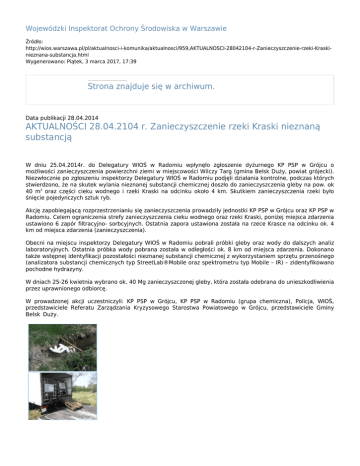 Wojewódzki Inspektorat Ochrony Środowiska w Warszawie Źródło: http://wios.warszawa.pl/pl/aktualnosci-i-komunika/aktualnosci/959,AKTUALNOSCI-28042104-r-Zanieczyszczenie-rzeki-Kraskinieznana-substancja.html Wygenerowano: Piątek, 3 marca 2017, 17:39 Strona znajduje się w archiwum. Data publikacji 28.04.2014 AKTUALNOŚCI 28.04.2104 r. Zanieczyszczenie rzeki Kraski nieznaną substancją W dniu 25.04.2014r. do Delegatury WIOŚ w Radomiu wpłynęło zgłoszenie dyżurnego KP PSP w Grójcu o możliwości zanieczyszczenia powierzchni ziemi w miejscowości Wilczy Targ (gmina Belsk Duży, powiat grójecki). Niezwłocznie po zgłoszeniu inspektorzy Delegatury WIOŚ w Radomiu podjęli działania kontrolne, podczas których stwierdzono, że na skutek wylania nieznanej substancji chemicznej doszło do zanieczyszczenia gleby na pow. ok 40 m2 oraz części cieku wodnego i rzeki Kraski na odcinku około 4 km. Skutkiem zanieczyszczenia rzeki było śnięcie pojedynczych sztuk ryb. Akcję zapobiegającą rozprzestrzenianiu się zanieczyszczenia prowadziły jednostki KP PSP w Grójcu oraz KP PSP w Radomiu. Celem ograniczenia strefy zanieczyszczenia cieku wodnego oraz rzeki Kraski, poniżej miejsca zdarzenia ustawiono 6 zapór filtracyjno- sorbcyjnych. Ostatnia zapora ustawiona została na rzece Krasce na odcinku ok. 4 km od miejsca zdarzenia (zanieczyszczenia). Obecni na miejscu inspektorzy Delegatury WIOŚ w Radomiu pobrali próbki gleby oraz wody do dalszych analiz laboratoryjnych. Ostatnia próbka wody pobrana została w odległości ok. 8 km od miejsca zdarzenia. Dokonano także wstępnej identyfikacji pozostałości nieznanej substancji chemicznej z wykorzystaniem sprzętu przenośnego (analizatora substancji chemicznych typ StreetLab®Mobile oraz spektrometru typ Mobile – IR) – zidentyfikowano pochodne hydrazyny. W dniach 25-26 kwietnia wybrano ok. 40 Mg zanieczyszczonej gleby, która została odebrana do unieszkodliwienia przez uprawnionego odbiorcę. W prowadzonej akcji uczestniczyli: KP PSP w Grójcu, KP PSP w Radomiu (grupa chemiczna), Policja, WIOŚ, przedstawiciele Referatu Zarządzania Kryzysowego Starostwa Powiatowego w Grójcu, przedstawiciele Gminy Belsk Duży. Data publikacji 28.04.2014 Rejestr zmian Liczba wizyt: 1194 Autor: Iwona Kalinowska-Witowska Opublikowane przez Ewa Pacholska