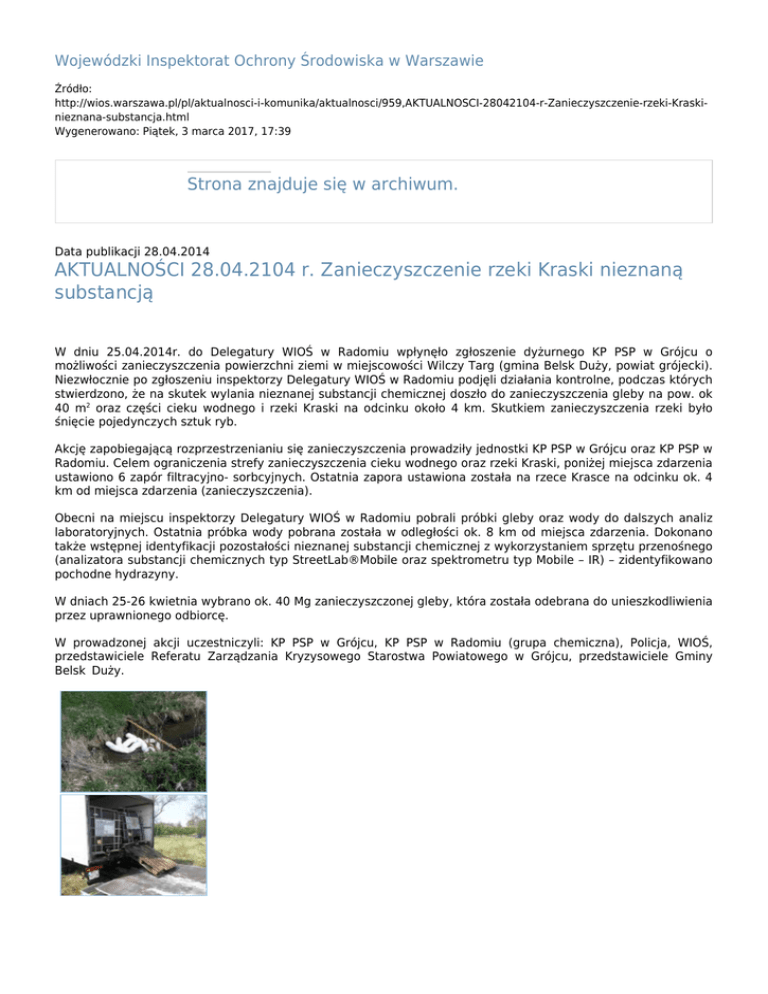 AKTUALNOŚCI 28.04.2104 r. Zanieczyszczenie rzeki Kraski