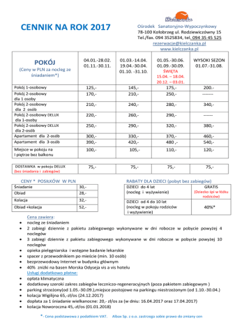 CENNIK NA ROK 2017 POKÓJ (Ceny w PLN za nocleg ze śniadaniem*) 04.01.-28.02. 01.11.-30.11. Ośrodek Sanatoryjno-Wypoczynkowy 78-100 Kołobrzeg ul. Rodziewiczówny 15 Tel./fax. 094 3525834, tel. 094 35 45 525 [email protected] www.kielczanka.pl 01.03.-14.04. 19.04.-30.04. 01.10. -31.10. 01.05.-30.06. 01.09.-30.09. WYSOKI SEZON 01.07.-31.08. ŚWIĘTA 15.04. – 18.04. 20.12. – 03.01. Pokój 1-osobowy Pokój 2-osobowy dla 1 osoby Pokój 2-osobowy dla 2 osób Pokój 2-osobowy DELUX dla 1-osoby Pokój 2-osobowy DELUX dla 2-osób Apartament dla 2-osób Apartament dla 3-osób 125,170,- 145,210,- 175,250,- 200.------- 210,- 240,- 280,- 340,- 220,- 260,- 290,- ------ 250,- 290,- 320,- 380,- 300,390,- 330,420,- 370,480 ,- 460,540,- Miejsce w pokoju na I piętrze bez balkonu 100,- 105,- 110,- 120,- 75,- 75,- 75,- 75,- DOSTAWKA w pokoju DELUX (bez śniadania i zabiegów) CENY * POSIŁKÓW W PLN RABATY DLA DZIECI (pobyt bez zabiegów) Śniadanie Obiad 30,28,- DZIECI do 4 lat (nocleg i wyżywienie) Kolacja 32,- Obiad +kolacja 52,- DZIECI od 4 do 10 lat (nocleg w pokoju rodziców i wyżywienie) GRATIS (Dziecko śpi w łóżku rodziców) 40%* Cena zawiera: nocleg ze śniadaniem 2 zabiegi dziennie z pakietu zabiegowego wykonywane w dni robocze w pobycie powyżej 4 noclegów 3 zabiegi dziennie z pakietu zabiegowego wykonywane w dni robocze w pobycie powyżej 10 noclegów opieka pielęgniarska i wstępne badanie lekarskie spacer z przewodnikiem po mieście (min. 10 osób) bezprzewodowy Internet w budynku głównym 40% zniżki na basen Morska Odyseja vis a vis hotelu Usługi dodatkowo płatne: opłata klimatyczna dodatkowy szeroki zakres zabiegów leczniczo-regeneracyjnych (poza pakietem zabiegowym ) parking strzeżony(od 1.05.-30.09.),miejsce postojowe na parkingu niestrzeżonym (od 1.10.-30.04.) kolacja Wigilijna 65,-zł/os (24.12.2017) dopłata za 1 śniadanie wielkanocne: 20,- zł/os za (w dniu: 16.04.2017 oraz 17.04.2017) kolacja Noworoczna 45,-zł/os (01.01.2018) *- Cena podstawowa z podatkiem VAT. Albax Sp. z o.o. zastrzega sobie prawo do zmiany cen