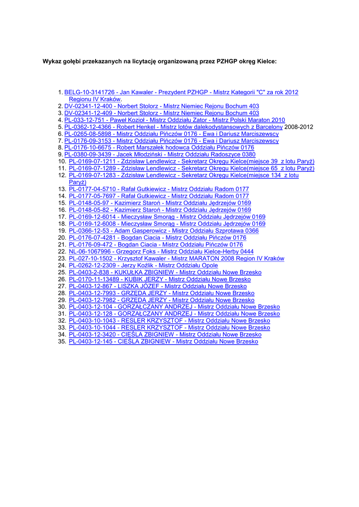 Wykaz gołębi przekazanych na licytację organizowaną przez PZHGP okręg Kielce: 1. BELG-10-3141726 - Jan Kawaler - Prezydent PZHGP - Mistrz Kategorii "C" za rok 2012 Regionu IV Kraków. 2. DV-02341-12-400 - Norbert Stolorz - Mistrz Niemiec Rejonu Bochum 403 3. DV-02341-12-409 - Norbert Stolorz - Mistrz Niemiec Rejonu Bochum 403 4. PL-033-12-751 - Paweł Kozioł - Mistrz Oddziału Zator - Mistrz Polski Maraton 2010 5. PL-0362-12-4366 - Robert Henkel - Mistrz lotów dalekodystansowych z Barcelony 2008-2012 6. PL-0265-08-5898 - Mistrz Oddziału Pińczów 0176 - Ewa i Dariusz Marciszewscy 7. PL-0176-09-3153 - Mistrz Oddziału Pińczów 0176 - Ewa i Dariusz Marciszewscy 8. PL-0176-10-6675 - Robert Marszałek hodowca Oddziału Pińczów 0176 9. PL-0380-09-3439 - Jacek Młodziński - Mistrz Oddziału Radoszyce 0380 10. PL-0169-07-1211 - Zdzisław Lendlewicz - Sekretarz Okręgu Kielce(miejsce 39 z lotu Paryż) 11. PL-0169-07-1289 - Zdzisław Lendlewicz - Sekretarz Okręgu Kielce(miejsce 65 z lotu Paryż) 12. PL-0169-07-1283 - Zdzisław Lendlewicz - Sekretarz Okręgu Kielce(miejsce 134 z lotu Paryż) 13. PL-0177-04-5710 - Rafał Gutkiewicz - Mistrz Oddziału Radom 0177 14. PL-0177-05-7697 - Rafał Gutkiewicz - Mistrz Oddziału Radom 0177 15. PL-0148-05-97 - Kazimierz Staroń - Mistrz Oddziału Jędrzejów 0169 16. PL-0148-05-82 - Kazimierz Staroń - Mistrz Oddziału Jędrzejów 0169 17. PL-0169-12-6014 - Mieczysław Smorąg - Mistrz Oddziału Jędrzejów 0169 18. PL-0169-12-6008 - Mieczysław Smorąg - Mistrz Oddziału Jędrzejów 0169 19. PL-0366-12-53 - Adam Gasperowicz - Mistrz Oddziału Szprotawa 0366 20. PL-0176-07-4281 - Bogdan Ciacia - Mistrz Oddziału Pińczów 0176 21. PL-0176-09-472 - Bogdan Ciacia - Mistrz Oddziału Pińczów 0176 22. NL-06-1067996 - Grzegorz Foks - Mistrz Oddziału Kielce-Herby 0444 23. PL-027-10-1502 - Krzysztof Kawaler - Mistrz MARATON 2008 Region IV Kraków 24. PL-0262-12-2309 - Jerzy Koźlik - Mistrz Oddziału Opole 25. PL-0403-2-838 - KUKUŁKA ZBIGNIEW - Mistrz Oddziału Nowe Brzesko 26. PL-0170-11-13489 - KUBIK JERZY - Mistrz Oddziału Nowe Brzesko 27. PL-0403-12-867 - LISZKA JÓZEF - Mistrz Oddziału Nowe Brzesko 28. PL-0403-12-7993 - GRZĘDA JERZY - Mistrz Oddziału Nowe Brzesko 29. PL-0403-12-7982 - GRZĘDA JERZY - Mistrz Oddziału Nowe Brzesko 30. PL-0403-12-104 - GORZAŁCZANY ANDRZEJ - Mistrz Oddziału Nowe Brzesko 31. PL-0403-12-128 - GORZAŁCZANY ANDRZEJ - Mistrz Oddziału Nowe Brzesko 32. PL-0403-10-1043 - RESLER KRZYSZTOF - Mistrz Oddziału Nowe Brzesko 33. PL-0403-10-1044 - RESLER KRZYSZTOF - Mistrz Oddziału Nowe Brzesko 34. PL-0403-12-3420 - CIEŚLA ZBIGNIEW - Mistrz Oddziału Nowe Brzesko 35. PL-0403-12-145 - CIEŚLA ZBIGNIEW - Mistrz Oddziału Nowe Brzesko