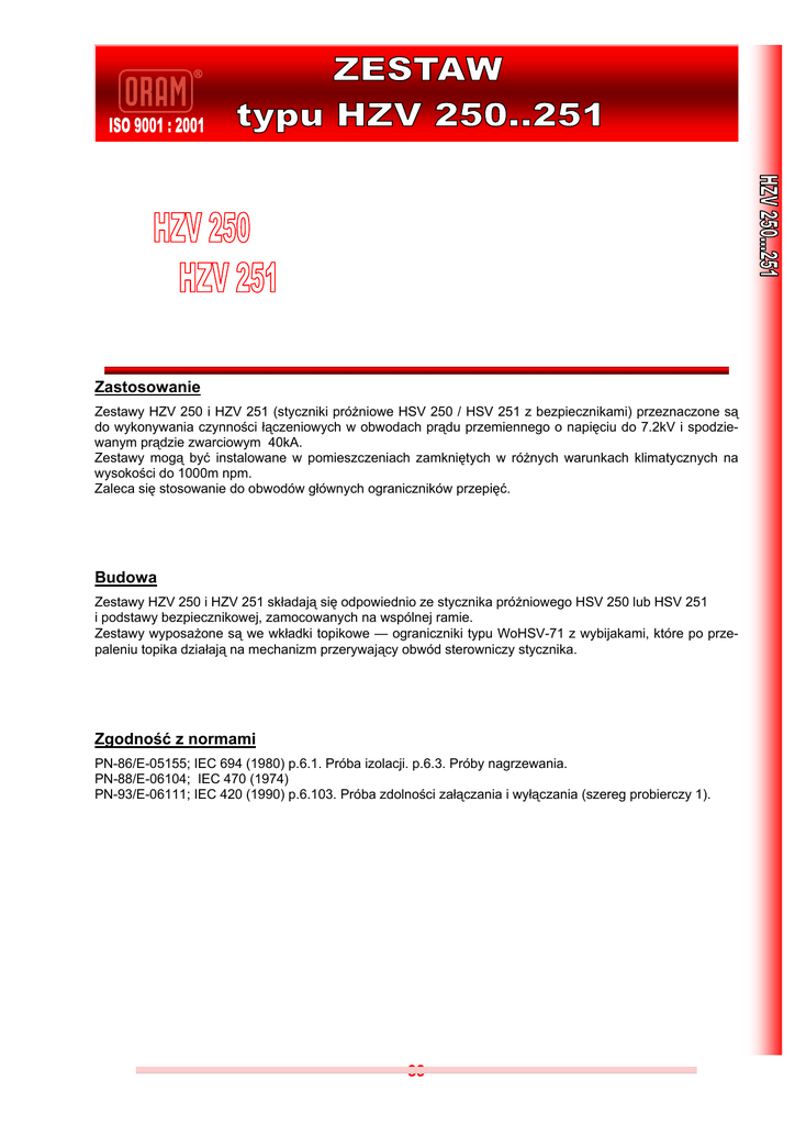 Zastosowanie Zestawy HZV 250 i HZV 251 (styczniki próżniowe HSV 250 / HSV 251 z bezpiecznikami) przeznaczone są do wykonywania czynności łączeniowych w obwodach prądu przemiennego o napięciu do 7.2kV i spodziewanym prądzie zwarciowym 40kA. Zestawy mogą być instalowane w pomieszczeniach zamkniętych w różnych warunkach klimatycznych na wysokości do 1000m npm. Zaleca się stosowanie do obwodów głównych ograniczników przepięć. Budowa Zestawy HZV 250 i HZV 251 składają się odpowiednio ze stycznika próżniowego HSV 250 lub HSV 251 i podstawy bezpiecznikowej, zamocowanych na wspólnej ramie. Zestawy wyposażone są we wkładki topikowe — ograniczniki typu WoHSV-71 z wybijakami, które po przepaleniu topika działają na mechanizm przerywający obwód sterowniczy stycznika. Zgodność z normami PN-86/E-05155; IEC 694 (1980) p.6.1. Próba izolacji. p.6.3. Próby nagrzewania. PN-88/E-06104; IEC 470 (1974) PN-93/E-06111; IEC 420 (1990) p.6.103. Próba zdolności załączania i wyłączania (szereg probierczy 1). 39 Dane techniczne zestawów HZV 250 HZV 251 Znamionowe napięcie izolacji Ui kV 7,2 Napięcie probiercze wytrzymywane o częstotliwości sieciowej(wartość skuteczna) kV 20 Znamionowe napięcie łączeniowe Ue kV 7,2 Prąd załączalny zwarciowy znamionowy (wartość szczytowa) kA 100 Prąd wyłączalny zwarciowy znamionowy (wartość skuteczna) kA 40 Częstotliwość Hz 50 ÷ 60 Prąd znamionowy ciągły A 2001) kW 1600 V 220/230 a.c. 220 lub110 d.c. z końcówką kablową mm2 70 ÷ 150 szynowych mm 25 x 5 Moc silnika w kat, AC3; AC4 przy Ue = 6kV Znamionowe napięcia sterownicze Przekroje przewodów przyłączowych - torów głównych - torów pomocniczych - zacisku uziomowego Śruby zaciskowe M10 M4 M12 4z+2r; 3z+2r 1) Liczba torów pomocniczych Masa 1) kg 38 dotyczy zestawu HZV 251 Pozostałe informacje techniczne dotyczące stycznika zawiera karta katalogowa Styczniki próżniowe HSV 250. Dane techniczne wkładek topikowych - ograniczników typu WoHSV-71 Prąd ciągły Iu Znamionowy prąd wyłączalny Iws Najmniejszy prąd wyłączalny K Max, strata mocy 125A 63kA 450A 0,73 80W 160A 63kA 550A 0,72 100W 200A 63kA 650A 0,72 140W 40 Masa 3,5kg Charakterystyki Zależność prądu ograniczonego (Io) od prądu spodziewanego (Ip) Charakterystyki średnie przedłukowe t - Ip Sposób odczytu. Dla prądu rozruchowego Ir odczytuje się czas t. Dopuszczalna częstość łączeń n silnika może być taka, aby iloczyn: n< t . tr Dopuszczalna częstość łączeń n=3 Przykład: Dla silnika, którego prąd rozruchowy Ir wynosi 550A, a czas rozruchu tr= 6s, czas odczytany z wykresu dla wkładki 160A wynosi 20s. Zależność czasu działania wkładek topikowych ograniczników od prądu rozruchowego silnika Ir uwzględniający współczynnik K odporności wkładek na impulsy przeciążeniowe. Wykres dotyczy warunków gdy liczba rozruchów nie przekracza 6 na godzinę a czas rozruchu tr nie przekracza 60s. t 20 = = 3,3 > 3 6 tr Dopuszczalna częstość łączeń n=3 41 Wymiary Podłączenie przewodów obwodów głównych 1. Zaciski umożliwiają podłączenie przewodów z końcówkami kablowymi o przekroju 70...150 mm2 lub szyn o wymiarach 25x5 mm. Moment dokręcenia śrub zaciskowych 10...15 Nm. 2. Na przewody lub szyny od strony stycznika należy założyć załączone termokurczliwe koszulki i obkurczyć nagrzewając je nagrzewnicą. Koszulka powinna zaczynać się około 15 mm od osi otworu w szynie lub końcówce kablowej. 3. Odległość między nie izolowanymi odcinkami szyn powinna być nie mniejsza niż 90 mm. 4. Przewody przyłączowe powinny być mocowane w odległości ~ 500 mm od zacisku. 42 Rozmieszczenie zacisków i schematy elektryczne HZV 250 (napęd a.c.) HZV 250 (napęd d.c.) HZV 251 43 44