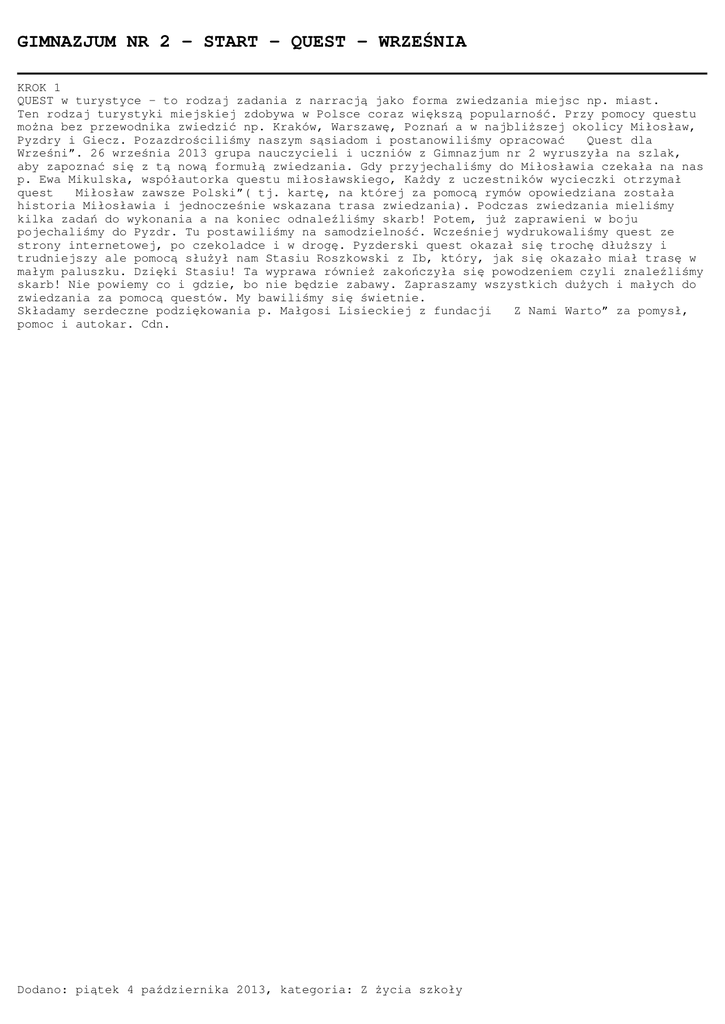 GIMNAZJUM NR 2 - START - QUEST - WRZEŚNIA KROK 1 QUEST w turystyce – to rodzaj zadania z narracją jako forma zwiedzania miejsc np. miast. Ten rodzaj turystyki miejskiej zdobywa w Polsce coraz większą popularność. Przy pomocy questu można bez przewodnika zwiedzić np. Kraków, Warszawę, Poznań a w najbliższej okolicy Miłosław, Pyzdry i Giecz. Pozazdrościliśmy naszym sąsiadom i postanowiliśmy opracować „ Quest dla Wrześni”. 26 września 2013 grupa nauczycieli i uczniów z Gimnazjum nr 2 wyruszyła na szlak, aby zapoznać się z tą nową formułą zwiedzania. Gdy przyjechaliśmy do Miłosławia czekała na nas p. Ewa Mikulska, współautorka questu miłosławskiego, Każdy z uczestników wycieczki otrzymał quest „ Miłosław zawsze Polski”( tj. kartę, na której za pomocą rymów opowiedziana została historia Miłosławia i jednocześnie wskazana trasa zwiedzania). Podczas zwiedzania mieliśmy kilka zadań do wykonania a na koniec odnaleźliśmy skarb! Potem, już zaprawieni w boju pojechaliśmy do Pyzdr. Tu postawiliśmy na samodzielność. Wcześniej wydrukowaliśmy quest ze strony internetowej, po czekoladce i w drogę. Pyzderski quest okazał się trochę dłuższy i trudniejszy ale pomocą służył nam Stasiu Roszkowski z Ib, który, jak się okazało miał trasę w małym paluszku. Dzięki Stasiu! Ta wyprawa również zakończyła się powodzeniem czyli znaleźliśmy skarb! Nie powiemy co i gdzie, bo nie będzie zabawy. Zapraszamy wszystkich dużych i małych do zwiedzania za pomocą questów. My bawiliśmy się świetnie. Składamy serdeczne podziękowania p. Małgosi Lisieckiej z fundacji „ Z Nami Warto” za pomysł, pomoc i autokar. Cdn. Dodano: piątek 4 października 2013, kategoria: Z życia szkoły