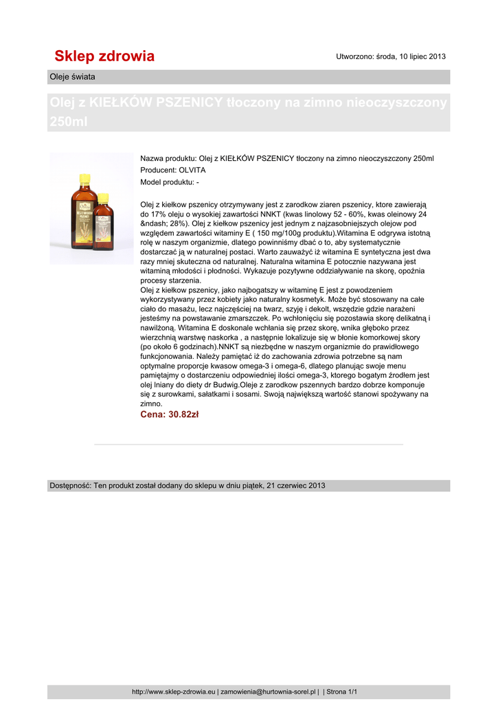 Sklep zdrowia Utworzono: środa, 10 lipiec 2013 Oleje świata Olej z KIEŁKÓW PSZENICY tłoczony na zimno nieoczyszczony 250ml Nazwa produktu: Olej z KIEŁKÓW PSZENICY tłoczony na zimno nieoczyszczony 250ml Producent: OLVITA Model produktu: Olej z kiełkow pszenicy otrzymywany jest z zarodkow ziaren pszenicy, ktore zawierają do 17% oleju o wysokiej zawartości NNKT (kwas linolowy 52 - 60%, kwas oleinowy 24 – 28%). Olej z kiełkow pszenicy jest jednym z najzasobniejszych olejow pod względem zawartości witaminy E ( 150 mg/100g produktu).Witamina E odgrywa istotną rolę w naszym organizmie, dlatego powinniśmy dbać o to, aby systematycznie dostarczać ją w naturalnej postaci. Warto zauważyć iż witamina E syntetyczna jest dwa razy mniej skuteczna od naturalnej. Naturalna witamina E potocznie nazywana jest witaminą młodości i płodności. Wykazuje pozytywne oddziaływanie na skorę, opoźnia procesy starzenia. Olej z kiełkow pszenicy, jako najbogatszy w witaminę E jest z powodzeniem wykorzystywany przez kobiety jako naturalny kosmetyk. Może być stosowany na całe ciało do masażu, lecz najczęściej na twarz, szyję i dekolt, wszędzie gdzie narażeni jesteśmy na powstawanie zmarszczek. Po wchłonięciu się pozostawia skorę delikatną i nawilżoną. Witamina E doskonale wchłania się przez skorę, wnika głęboko przez wierzchnią warstwę naskorka , a następnie lokalizuje się w błonie komorkowej skory (po około 6 godzinach).NNKT są niezbędne w naszym organizmie do prawidłowego funkcjonowania. Należy pamiętać iż do zachowania zdrowia potrzebne są nam optymalne proporcje kwasow omega-3 i omega-6, dlatego planując swoje menu pamiętajmy o dostarczeniu odpowiedniej ilości omega-3, ktorego bogatym źrodłem jest olej lniany do diety dr Budwig.Oleje z zarodkow pszennych bardzo dobrze komponuje się z surowkami, sałatkami i sosami. Swoją największą wartość stanowi spożywany na zimno. Cena: 30.82zł Dostępność: Ten produkt został dodany do sklepu w dniu piątek, 21 czerwiec 2013 http://www.sklep-zdrowia.eu | [email protected] | | Strona 1/1