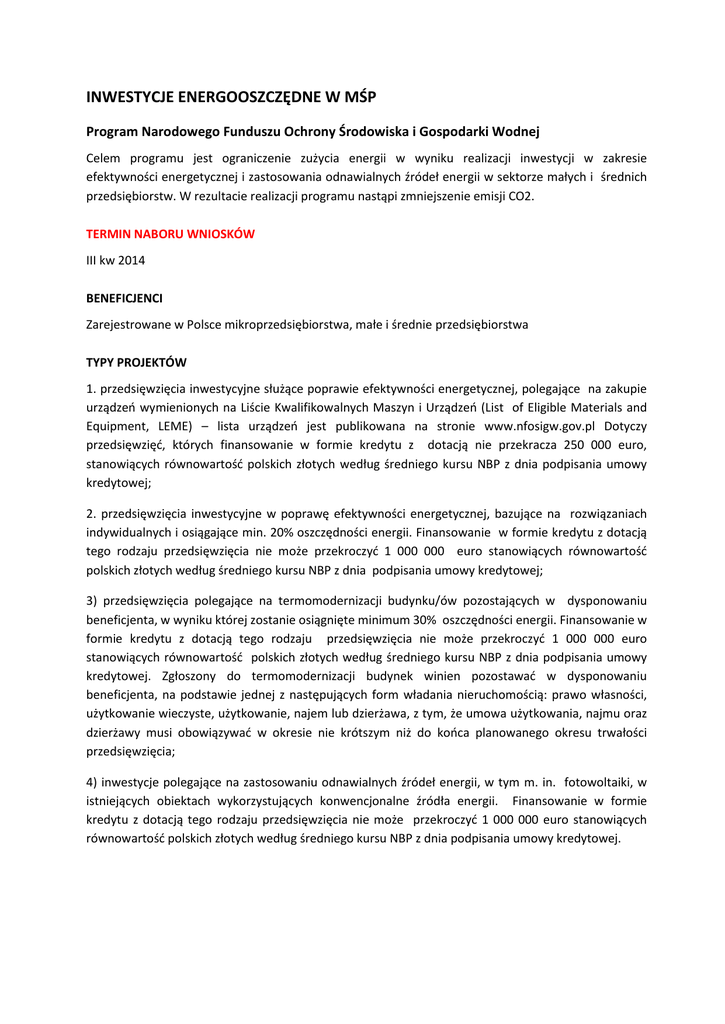 INWESTYCJE ENERGOOSZCZĘDNE W MŚP Program Narodowego Funduszu Ochrony Środowiska i Gospodarki Wodnej Celem programu jest ograniczenie zużycia energii w wyniku realizacji inwestycji w zakresie efektywności energetycznej i zastosowania odnawialnych źródeł energii w sektorze małych i średnich przedsiębiorstw. W rezultacie realizacji programu nastąpi zmniejszenie emisji CO2. TERMIN NABORU WNIOSKÓW III kw 2014 BENEFICJENCI Zarejestrowane w Polsce mikroprzedsiębiorstwa, małe i średnie przedsiębiorstwa TYPY PROJEKTÓW 1. przedsięwzięcia inwestycyjne służące poprawie efektywności energetycznej, polegające na zakupie urządzeń wymienionych na Liście Kwalifikowalnych Maszyn i Urządzeń (List of Eligible Materials and Equipment, LEME) – lista urządzeń jest publikowana na stronie www.nfosigw.gov.pl Dotyczy przedsięwzięć, których finansowanie w formie kredytu z dotacją nie przekracza 250 000 euro, stanowiących równowartość polskich złotych według średniego kursu NBP z dnia podpisania umowy kredytowej; 2. przedsięwzięcia inwestycyjne w poprawę efektywności energetycznej, bazujące na rozwiązaniach indywidualnych i osiągające min. 20% oszczędności energii. Finansowanie w formie kredytu z dotacją tego rodzaju przedsięwzięcia nie może przekroczyć 1 000 000 euro stanowiących równowartość polskich złotych według średniego kursu NBP z dnia podpisania umowy kredytowej; 3) przedsięwzięcia polegające na termomodernizacji budynku/ów pozostających w dysponowaniu beneficjenta, w wyniku której zostanie osiągnięte minimum 30% oszczędności energii. Finansowanie w formie kredytu z dotacją tego rodzaju przedsięwzięcia nie może przekroczyć 1 000 000 euro stanowiących równowartość polskich złotych według średniego kursu NBP z dnia podpisania umowy kredytowej. Zgłoszony do termomodernizacji budynek winien pozostawać w dysponowaniu beneficjenta, na podstawie jednej z następujących form władania nieruchomością: prawo własności, użytkowanie wieczyste, użytkowanie, najem lub dzierżawa, z tym, że umowa użytkowania, najmu oraz dzierżawy musi obowiązywać w okresie nie krótszym niż do końca planowanego okresu trwałości przedsięwzięcia; 4) inwestycje polegające na zastosowaniu odnawialnych źródeł energii, w tym m. in. fotowoltaiki, w istniejących obiektach wykorzystujących konwencjonalne źródła energii. Finansowanie w formie kredytu z dotacją tego rodzaju przedsięwzięcia nie może przekroczyć 1 000 000 euro stanowiących równowartość polskich złotych według średniego kursu NBP z dnia podpisania umowy kredytowej. FORMA DOFINANSOWANIA Dotacje na częściowe spłaty kapitału kredytów bankowych POZIOM DOFINANSOWANIA Dotacja w wysokości: a) 10% kapitału kredytu bankowego wykorzystanego na sfinansowanie kosztów kwalifikowanych przedsięwzięć polegających na zakupie urządzeń wraz z zainstalowaniem pojedynczego urządzenia lub określonej liczby urządzeń, b) 10% kapitału kredytu bankowego, wykorzystanego na sfinansowanie kosztów kwalifikowanych przedsięwzięć polegających na termomodernizacji budynku/ów, c) 15% kapitału kredytu bankowego, wykorzystanego na sfinansowanie kosztów kwalifikowanych przedsięwzięć wymienionych w lit. a) lub b), w przypadku, gdy inwestycja została poprzedzona audytem energetycznym sporządzonym wg zasad określonych przez NFOŚiGW. Zakres rzeczowy zrealizowanej w ramach kredytu z dotacją inwestycji musi wynikać z przeprowadzonego audytu energetycznego, d) dodatkowo do 15% kapitału kredytu bankowego na pokrycie poniesionych kosztów wdrożenia systemu zarządzania energią (SZE), jednak nie więcej niż 10.000 złotych, jeśli w ramach zrealizowanego przedsięwzięcia beneficjent wdroży system według zasad określonych przez NFOŚiGW.