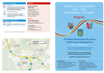 Sobota, 21 marca 2015 07:30 Śniadanie 9:00 W poszukiwaniu historycznych tematów do projektów wymiany szkolnej: wycieczka Doliną Renu i do Koblencji 20:30 Powrót do Otzenhausen 22:00 Saarlandzki „strzemienny“– oficjalne zakończenie konferencji i pożegnanie niemieckich gości Kontakt Ośrodek Ekologiczny Spohns Haus Dekan-Schindler-Str. 13-14 D-66453 Gersheim Tel. +49 (0) 6843/58999-0 Fax +49 (0) 6843/58999-9 E-Mail: [email protected] www.spohnshaus.de Dyrektor: Niedziela, 22 marca 2015 08:00 Śniadanie 09:00 Pożegnanie i wyjazd polskich i ukraińskich gości Uczymy się z przeszłości 1945 – 2015 70 lat pokoju w Europie? Program dr Jerzy Węgrzynowski: Tel. +49 (0) 6843 58999-13 [email protected] Hans Bollinger: Tel. +49 (0) 6843 58999-26 lub 0171-2613123 [email protected] Zastrzegamy sobie prawo do wprowadzania zmian w programie. IX Polsko-Niemiecko-Ukraińska Konferencja Pedagogiczna 18 – 22 marca 2015 Po patronatem pana Stephana Toscaniego Ministra Finansów i Spraw Europejskich Stowarzyszenie na rzecz Europejskiego Kształcenia Ekologicznego Spohns Haus Akademia Europejska Otzenhausen We współpracy z : – Krajowym Instytutem Pedagogiki i Mediów – Kuratorium Oświaty w Rzeszowie – Polsko – Niemiecką Współpracą Młodzieży – Akademią Europejską Otzenhausen – Stowarzyszeniem EKOS Przy wsparciu: – Fundacji ASKO Europa-Stiftung – Ministerium für Bildung und Kultur – Ministerium für Finanzen und Europa – Polsko-Niemieckiej Współpracy Młodzieży – Europejskiej Fundacji Oświaty i Kultury – Union Stiftung Program Stowarzyszenie na rzecz Europejskiego Kształcenia Ekologicznego Spohns Haus i Akademia Europejska Otzenhausen mają zaszczyt zaprosić na IX Polsko-Niemiecko-Ukraińską Konferencję Pedagogiczną 18 – 22 marca 2015 Uczymy się z przeszłości 1945 – 2015 70 lat pokoju w Europie? Miejsce: Zespół organizacyjny: Akademia Europejska Otzenhausen Europahausstr. 35 66620 Nonnweiler Hans Bollinger, Spohns Haus dr Jerzy Węgrzynowski, Spohns Haus Środa, 18 marca 2015 16:30 Przyjazd gości, zakwaterowanie w pokojach 17:30 Oficjalne powitanie i prezentacja programu w Europeaum 18:30 Kolacja 19:30 Rozmowy kuluarowe Czwartek, 19 marca 2015 08:00 Śniadanie 09:00 Europaeum: Uroczyste otwarcie Konferencji i powitanie gości • dr Jerzy Węgrzynowski, Dyrektor Spohns Haus • Helma Kuhn-Theis, Pełnomocnik Rządu Kraju Saary do Spraw Europejskich • Arno Krause, założyciel i Przewodniczący Zarządu Akademii Europejskiej Otzenhausen • Jacek Wojtas, Podkarpacki Kurator Oświaty 10:15 Plenum w Europaeum: Referat wprowdzający do Konferencji „Zapewnienie pokoju i stabilizacji w Europie 70 lat po zakończeniu II wojny światowej - z niemieckiego, polskiego i ukraińskiego punktu widzenia“ prof. dr hab. Hans-Jürgen Bömelburg, Uniwersytet Justusa Liebiga w Gießen 11:00 Przerwa kawowa 11:15 Plenum w Europaeum: referat „Wojna i pokój w polsko-niemieckim podręczniku do nauczania historii: Nawiązania koncepcyjne do aktualnego projektu podręcznikowego“ dr Thomas Strobel, Institut Georga Eckerta w Braunschweig, Florian Faderl, Wydawnictwo Eduversum GmbH, Wiesbaden 12:30 Przerwa obiadowa 14:00 Plenum w Europaeum: referat „Wyzwania wymiany szkolnej w kontekście współistnienia i rozwiązywania konfliktów w Europie“ Hartmut Ziesing, autor i dziennikarz, Hannover 14:45 Plenum w Europaeum: przedstawienie możli wych treści tematycznych przez prelegentów: • Polsko-niemiecki podręcznik do nauczania historii dr Thomas Strobel, Florian Faderl • Konflikt na Ukrainie jako temat dwui trójnarodowych projektów w ramach wymiany szkolnej dr Nazarii Gutsul, Uniwersytet Justusa Liebiga w Gießen • Temat wojny i pokoju w filmie w ujęciu metodycznym dr Ewa Fiuk, Uniwersytet Jagielloński w Krakowie • Rola wycieczek krajoznawczych w międzynarodowych projektach wymiany szkolnej o tematyce historyczne Hartmut Ziesing, Piotr Kwiatkowski PNWM Warszawa 15:15 Przerwa kawowa 15:30 Praca z prelegentami w grupach 18:30 Kolacja Piątek, 20 marca 2015 08:00 Śniadanie 09:00 Plenum w Europaeum: Wskazówki i pytania do programu 09:30 Plenum w Europaeum: dyskusja panelowa prof. dr hab. Hans-Jürgen Bömelburg, dr Nazarii Gutsul, dr Wojciech Kwieciński, Uniwersytet Rzeszowski Moderacja: Hartmut Ziesing 10:30 Przerwa kawowa 11:00 Plenum im Europaeum: Prezentacja wyników 12:30 Przerwa obiadowa 14:00 „Pokonać przeszkody“ Informacje i porady, dotyczące składania wniosków i sporządzania rozliczeń dla Polsko – Niemieckiej Współpracy Młodzieży, w dwóch grupach: • dla Uczestników z Niemiec: dr Jerzy Węgrzynowski, Spohns Haus • dla Uczestników z Polski: Piotr Kwiatkowski, PNWM Warszawa 15:00 Przerwa kawowa 15:30 Czas do dyspozycji szkół partnerskich 19:00 Polsko-ukraińska kolacja oraz koncert JazzBand-Ball-Orchestra Krakow, w ramach „Festiwalu Musikfestspiele Saar 2015“, dzięki uprzejmemu wsparciu Fundacji „Stiftung europäische Kultur und Bildung“