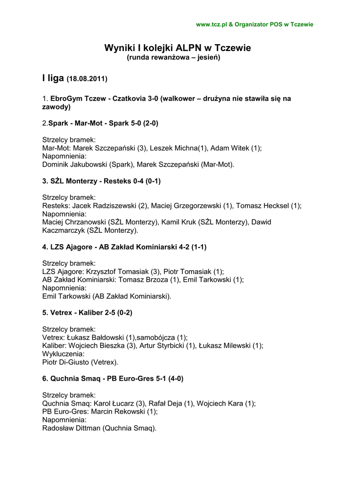 www.tcz.pl & Organizator POS w Tczewie Wyniki I kolejki ALPN w Tczewie (runda rewanżowa – jesień) I liga (18.08.2011) 1. EbroGym Tczew - Czatkovia 3-0 (walkower – drużyna nie stawiła się na zawody) 2.Spark - Mar-Mot - Spark 5-0 (2-0) Strzelcy bramek: Mar-Mot: Marek Szczepański (3), Leszek Michna(1), Adam Witek (1); Napomnienia: Dominik Jakubowski (Spark), Marek Szczepański (Mar-Mot). 3. SŻL Monterzy - Resteks 0-4 (0-1) Strzelcy bramek: Resteks: Jacek Radziszewski (2), Maciej Grzegorzewski (1), Tomasz Hecksel (1); Napomnienia: Maciej Chrzanowski (SŻL Monterzy), Kamil Kruk (SŻL Monterzy), Dawid Kaczmarczyk (SŻL Monterzy). 4. LZS Ajagore - AB Zakład Kominiarski 4-2 (1-1) Strzelcy bramek: LZS Ajagore: Krzysztof Tomasiak (3), Piotr Tomasiak (1); AB Zakład Kominiarski: Tomasz Brzoza (1), Emil Tarkowski (1); Napomnienia: Emil Tarkowski (AB Zakład Kominiarski). 5. Vetrex - Kaliber 2-5 (0-2) Strzelcy bramek: Vetrex: Łukasz Bałdowski (1),samobójcza (1); Kaliber: Wojciech Bieszka (3), Artur Styrbicki (1), Łukasz Milewski (1); Wykluczenia: Piotr Di-Giusto (Vetrex). 6. Quchnia Smaq - PB Euro-Gres 5-1 (4-0) Strzelcy bramek: Quchnia Smaq: Karol Łucarz (3), Rafał Deja (1), Wojciech Kara (1); PB Euro-Gres: Marcin Rekowski (1); Napomnienia: Radosław Dittman (Quchnia Smaq). www.tcz.pl & Organizator POS w Tczewie I LIGA - TABELA AMATORSKIEJ LIGI PIŁKI NOŻNEJ 2011 L.p. Drużyna 1. 2. 3. 4. 6. 5. 7. 8. 9. 10. 12. 11. MAR-MOT LZS AJAGORE VETREX EBROGYM TCZEW KALIBER SPARK RESTEKS AB ZAKŁAD KOMINIARSKI SŻL MONTERZY PB EURO-GRES QUCHNIA SMAQ CZATKOVIA M Pkt Z R P Bramki Bilans 12 12 12 12 12 12 12 12 12 12 12 12 33 27 24 23 22 21 20 15 12 7 7 1 11 9 8 7 7 7 6 5 4 2 2 0 0 0 0 2 1 0 2 0 0 1 1 1 1 3 4 3 4 5 4 7 8 9 9 11 83:22 54:29 39:29 45:30 57:34 31:20 42:28 51:35 27:46 22:50 23:62 14:104 61 25 10 15 23 11 14 16 -19 -28 -39 -90 KLASYFIKACJA STRZELCÓW BRAMEK – I liga: 26 trafień – Marek Szczepański (Mar-Mot); 17 trafień – Piotr Tomasiak (LZS Ajagore); 16 trafień – Krzysztof Zaradny (AB Zakład Kominiarski), Włodzimierz Chmielecki (Mar-Mot); 15 trafień – Łukasz Milewski (Kaliber); 14 trafień – Mariusz Żurawski (Kaliber); 13 trafień – Karol Damaszke (EbroGym Tczew), Krzysztof Tomasiak (LZS Ajagore), Jacek Radziszewski (Resteks); 12 trafień – Piotr Włoch (LZS Ajagore), Karol Łucarz (Quchnia Smaq); 11 trafień – Wojciech Bieszka (Kaliber); 10 trafień – Dominik Kaczmar (EbroGym Tczew), Marcin Cetera (Mar-Mot); 9 trafień – Tomasz Bieszka (Vetrex), Łukasz Bałdowski (Vetrex); Wyniki I kolejki 2 ligi – ALPN 2011 (runda rewanżowa – jesień) II liga (16.08.2011) 1. AlfaTravel - Stalco-Polpharma 3-4 (1-1) Strzelcy bramek: Alfatravel: Paweł Barczewski (2), Witold Pijanowski (1); Stalco-Polpharma: Kamil Kuchta( 2), Piotr Cześnik (2); Napomnienia: Marcin Biernat (AlfaTravel). www.tcz.pl & Organizator POS w Tczewie 2. JM Meble - Abisynia 0-3 (walkower – niekompletny skład drużyny) 3. Hydrosfera- Trade-Met 6-4 (1-4) Strzelcy bramek: Hydrosfera: Mariusz Chorążęwski (3), Dawid Ciesielski (2), Michał Bartoszek (1). Trade-Met: Krzysztof Czarnecki (1), Krzysztof Maciejewski (1), Adam Sieniek (1), Damian Juda (1); 4.AutJapan Czarlin – ADNF 2-4 (1-3) Strzelcy bramek: AutJapan Czarlin: Marcin Zelka (1), Jaerzy Jaroński (1). ADNF: Bartłomiej Jankowski(2), Michał Kortas (2); Napomnienia: Adam Grunkowski (AutJapan Czarlin). 5. Vima - Hydromechanika 2-7 (0-3) Strzelcy bramek: Vima: Kevin Bittorf (1), Dawid Tarkowski (1); Hydromechanika: Sebastian Szczuchniak (2), Kamil Adamowicz (2), Przemysław Rybka (1), Rafał Strzelczyk (1), Jarosław Cieślak (1); Napomnienia: Dawid Tarkowski (Vima). 6. GoodFellas – Taczmahal 2-2 (2-2) Strzelcy bramek: GoodFellas: Michał Kolos (1), Patryk Taraszkiewicz (1); Taczmahal: Michał Matusiak (1), Kamil Zasada (1); Napomnienia: Dawid Zasada (Taczmahal), Karol Czubek (GoodFellas). II LIGA - TABELA AMATORSKIEJ LIGI PIŁKI NOŻNEJ 2011 L.p. Drużyna 1. 2. 3. 4. 5. 6. 7. 8. 9. 10. 11. 12. GOODFELLAS TACZMAHAL STALCO-POLPHARMA ABISYNIA HYDROMECHANIKA ADNF ALFATRAVEL TRADE-MET JM MEBLE HYDROSFERA AUTJAPAN CZARLIN VIMA M Pkt Z R P Bramki Bilans 12 12 12 12 12 12 12 12 12 12 12 12 34 25 23 22 22 19 19 16 13 10 10 0 11 8 7 7 7 6 6 5 4 3 3 0 1 1 2 1 1 1 1 1 1 1 1 0 0 3 3 4 4 5 5 6 7 8 8 12 92:18 59:30 49:33 53:26 40:42 45:44 38:45 38:43 31:51 28:46 33:65 23:88 74 29 16 27 -2 1 -7 -5 -20 -18 -32 -65 www.tcz.pl & Organizator POS w Tczewie Klasyfikacja strzelców II ligi: 28 bramek – Michał Kolos (GoodFellas); 25 bramek – Michał Fabich (GoodFellas); 19 bramek – Mateusz Zasada (Taczmahal); 18 bramek – Marcin Kędzierski (Abisynia); 15 bramek – Bartosz Bałdowski (GoodFellas); 14 bramek – Sebastian Szczuchniak (Hydromechanika); 11 bramek –Amadeusz Żurawski (JM Meble), Krzysztof Małek (ADNF), Michał Matusiak (Taczmahal), Mariusz Chorążęwski (Hydrosfera), Piotr Cześnik (Stalco-Polpharma); 10 bramek – Przemysław Sturm (GoodFellas), Paweł Cześnik (Stalco-Polpharma), Paweł Barczewski (AlfaTravel); Harmonogram spotkań: II kolejka - runda rewanżowa I liga (25.08.2011 - czwartek) 17.00 Mar-Mot - Resteks 17.50 EbroGym Tczew – Quchnia Smaq 18.40 LZS Ajagore - Kaliber 19.30 Vetrex – PB Euro-Gres 20.20 SŻL Monterzy – AB Zakład Kominiarski 21.10 Czatkovia - Spark II kolejka – runda rewanżowa II liga (23.08.2011 - wtorek) 17.00 Abisynia - AlfaTravel 17.50 Vima - Taczmahal 19.30 ADNF - Hydrosfera 19.30 Hydromechanika - AutJapan Czarlin 20.20 Trade-Met - JM Meble 21.10 Stalco-Polpharma - GoodFellas Ze sportowym pozdrowieniem Organizator POS w Tczewie