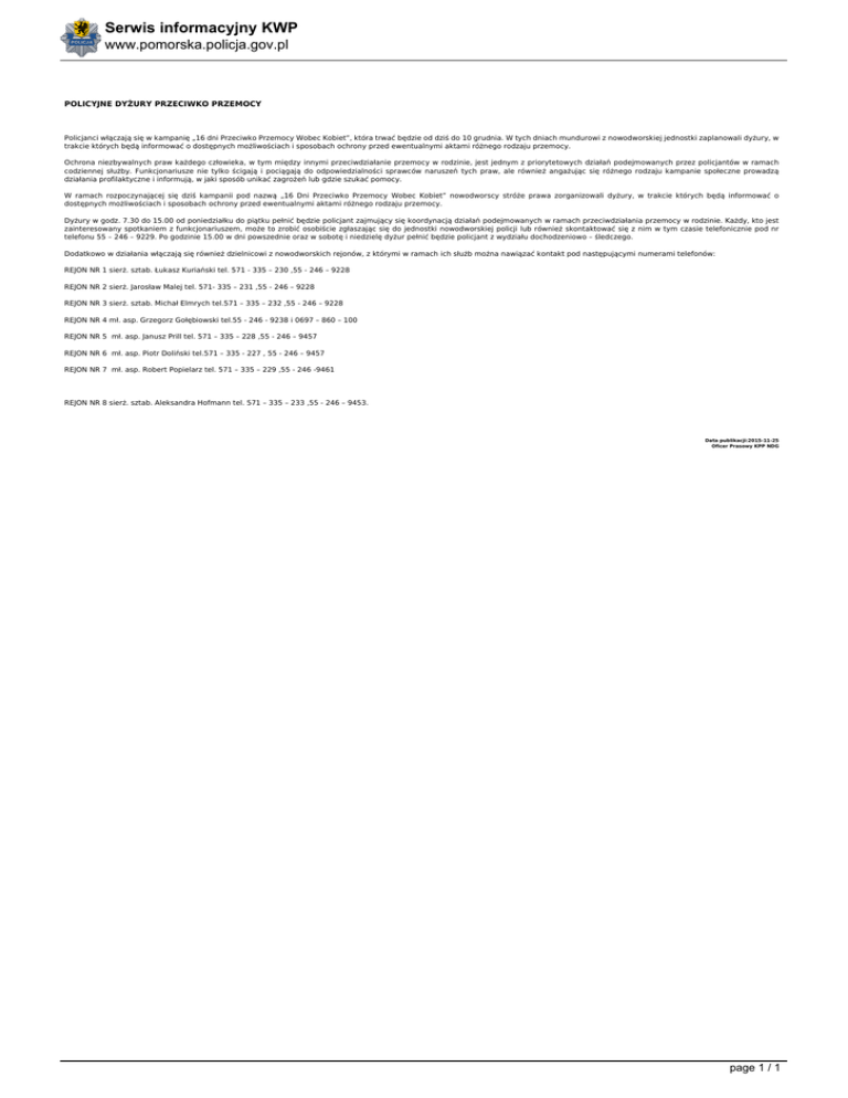 Serwis informacyjny KWP www.pomorska.policja.gov.pl POLICYJNE DYŻURY PRZECIWKO PRZEMOCY Policjanci włączają się w kampanię „16 dni Przeciwko Przemocy Wobec Kobiet”, która trwać będzie od dziś do 10 grudnia. W tych dniach mundurowi z nowodworskiej jednostki zaplanowali dyżury, w trakcie których będą informować o dostępnych możliwościach i sposobach ochrony przed ewentualnymi aktami różnego rodzaju przemocy. Ochrona niezbywalnych praw każdego człowieka, w tym między innymi przeciwdziałanie przemocy w rodzinie, jest jednym z priorytetowych działań podejmowanych przez policjantów w ramach codziennej służby. Funkcjonariusze nie tylko ścigają i pociągają do odpowiedzialności sprawców naruszeń tych praw, ale również angażując się różnego rodzaju kampanie społeczne prowadzą działania profilaktyczne i informują, w jaki sposób unikać zagrożeń lub gdzie szukać pomocy. W ramach rozpoczynającej się dziś kampanii pod nazwą „16 Dni Przeciwko Przemocy Wobec Kobiet” nowodworscy stróże prawa zorganizowali dyżury, w trakcie których będą informować o dostępnych możliwościach i sposobach ochrony przed ewentualnymi aktami różnego rodzaju przemocy. Dyżury w godz. 7.30 do 15.00 od poniedziałku do piątku pełnić będzie policjant zajmujący się koordynacją działań podejmowanych w ramach przeciwdziałania przemocy w rodzinie. Każdy, kto jest zainteresowany spotkaniem z funkcjonariuszem, może to zrobić osobiście zgłaszając się do jednostki nowodworskiej policji lub również skontaktować się z nim w tym czasie telefonicznie pod nr telefonu 55 – 246 – 9229. Po godzinie 15.00 w dni powszednie oraz w sobotę i niedzielę dyżur pełnić będzie policjant z wydziału dochodzeniowo – śledczego. Dodatkowo w działania włączają się również dzielnicowi z nowodworskich rejonów, z którymi w ramach ich służb można nawiązać kontakt pod następującymi numerami telefonów: REJON NR 1 sierż. sztab. Łukasz Kuriański tel. 571 - 335 – 230 ,55 - 246 – 9228 REJON NR 2 sierż. Jarosław Malej tel. 571- 335 – 231 ,55 - 246 – 9228 REJON NR 3 sierż. sztab. Michał Elmrych tel.571 – 335 – 232 ,55 - 246 – 9228 REJON NR 4 mł. asp. Grzegorz Gołębiowski tel.55 - 246 - 9238 i 0697 – 860 – 100 REJON NR 5 mł. asp. Janusz Prill tel. 571 – 335 – 228 ,55 - 246 – 9457 REJON NR 6 mł. asp. Piotr Doliński tel.571 – 335 - 227 , 55 - 246 – 9457 REJON NR 7 mł. asp. Robert Popielarz tel. 571 – 335 – 229 ,55 - 246 -9461 REJON NR 8 sierż. sztab. Aleksandra Hofmann tel. 571 – 335 – 233 ,55 - 246 – 9453. Data publikacji:2015-11-25 Oficer Prasowy KPP NDG page 1 / 1 Powered by TCPDF (www.tcpdf.org)