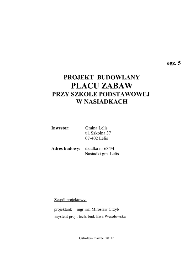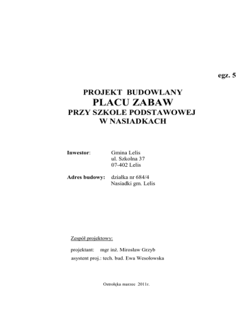 egz. 5 PROJEKT BUDOWLANY PLACU ZABAW PRZY SZKOLE PODSTAWOWEJ W NASIADKACH Inwestor: Gmina Lelis ul. Szkolna 37 07-402 Lelis Adres budowy: działka nr 684/4 Nasiadki gm. Lelis Zespół projektowy: projektant: mgr inŜ. Mirosław Grzyb asystent proj.: tech. bud. Ewa Wesołowska Ostrołęka marzec 2011r. Zawartość opracowania 1. STRONA TYTUŁOWA str. 2. ZAWARTOŚĆ OPRACOWNIA str. 3. MATERIAŁY FORMALNO-PRAWNE str. 3.1.Mapa sytuacyjno - wysokościowa w skali 1:500. str. 3.2. Stwierdzenie posiadania przygotowania zawodowego. str. 3.3. Zaświadczenie z Mazowieckiej Okręgowej Izby InŜynierów Bud. str. 3.4. Oświadczenie projektanta. str. 4. OPIS TECHNICZNY str. 4.1.Opis techniczny. str. 5. Projekt zagospodarowania terenu. str. 6. ZAŁĄCZNIKI 6.1. Huśtawka wagowa WaŜka „Modra” str. 6.2. Huśtawka spręŜynowa „Konik” str. 6.3. Huśtawka spręŜynowa „Motocykl” str. 6.4. Przeplotnia „Rakieta” str. 6.5. Karuzela „Jaś 3” str. 6.6. Zestaw rekreacyjny trzywieŜowy „Pionier A” str. 6.7. Ściana wspinaczkowa trójstronna „Trzy Korony” str. 6.8. Zestaw gimnastyczny „FIP” str. 6.9. Ławka parkowa betonowa „Kompan” str. 6.10. Kosz wolnostojący str. 6.11.Huśtawka spręŜynowa „ZOO” str. Opis techniczny 1. Temat opracowania: Projekt budowlany placu zabaw przy Szkole Podstawowej w Nasiadkach, gm. Lelis. 2. Inwestor: Gmina Lelis ul. Szkolna 37 07-402 Lelis 3. Adres budowy: działka nr 684/4 Nasiadki gm. Lelis 4. Cel i zakres opracowania: Celem opracowania jest zagospodarowanie placu zabaw przy Szkole Podstawowej w Nasiadkach, gm. Lelis. Zakres opracowania - dokumentacja budowlana 5. Podstawy opracowania: a) umowa zawarta pomiędzy Inwestorem a Projektantem b) uzgodnienia z Inwestorem c) mapa sytuacyjno - wysokościowa w skali 1:500 d) wizja terenu e) literatura przedmiotu f) obowiązujące normy i wytyczne przedmiotowe 6. Ogólna charakterystyka obiektu: Przedmiotowy teren znajduje się na działce Szkoły Podstawowej w Nasiadkach, gm. Lelis. Jest to teren o nawierzchni naturalnej, porośnięty trawą. Projekt zakłada zamontowanie jedenaście rodzajów zabawek przeznaczonych do aktywnego wypoczynku dzieci na świeŜym powietrzu. 7. Opis zagospodarowania terenu. Opis do projektu zagospodarowania Na terenie przeznaczonym do zagospodarowaniu placu zabaw przewidziano jedenaście urządzeń. Z szerokiej oferty produktów tej firmy zostały wybrane następujące urządzenia: - Huśtawka wagowa WaŜka „Modra” z siedziskami plastikowymi dla dwóch osób. Atrakcja dla młodszych i starszych dzieci . Strefa bezpieczeństwa 4,0m x2,6m. - Huśtawka spręŜynowa ”Konik”, „Motocykl” i „ZOO” tzw. bujak. Huśtawka spręŜynowe łączy bujanie z balansowaniem – uczy dzieci zachowania równowagi. Strefa bezpieczeństwa 2,7m x2,3m. - Przeplotnia „Rakieta” urządzenie sprawnościowe, kształtujące koncentrację i koordynację ruchów. Strefa bezpieczeństwa - Karuzela „Jaś 3” dla trzech osób. Strefa bezpieczeństwa Ø 5,78m. - Zestaw rekreacyjny trzywieŜowy „Pionier A” to zestaw róŜnorodnych przyrządów o róŜnym stopniu trudności. Połączenie wielu elementów w jedną przygodę. Strefa bezpieczeństwa 11,0m x 11,2m. - Ścianka wspinaczkowa trójstronna „Trzy Korony” o konstrukcji z profili zamkniętych i ściankach ze sklejki powlekanej tworzywem sztucznym. Strefa bezpieczeństwa 7,5m x 7,5m - Zestaw gimnastyczny „FIP” o konstrukcji z profili zamkniętych i ścianach bocznych ze sklejki. Strefa bezpieczeństwa 10,0m x 5,0m - Ławka parkowa betonowa „Kompan” - siedzisko z desek, nogi betonowe. Strefa bezpieczeństwa 1,5m x 2,1m. - Kosz wolnostojący blaszany do zachowania czystości. Urządzenia te są wykonywane miedzy innymi przez firmę COMES, które są w pełni zgodne z normami bezpieczeństwa PN-EN 1176 i 1177. Obowiązkowo powinny posiadać aprobatę jednostki certyfikującej. MontaŜ tych urządzeń winien być wykonany zgodnie z instrukcją producenta. Opracował: