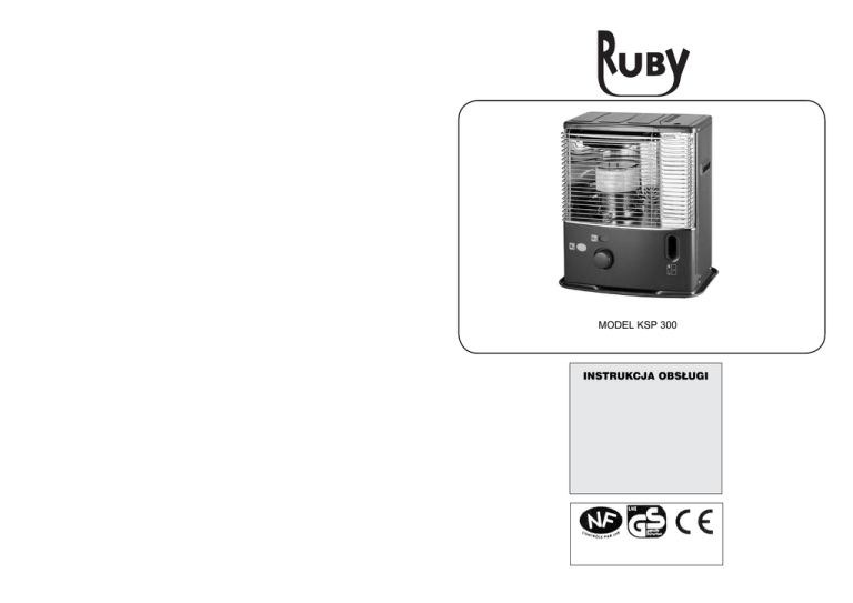 MODEL KSP 300 >CHIGJ@8?6D7HçJ<> JL6<6 A LXoVh^ZegoZldèZc^Ve^ZXn`VcVaZèn WZolo\aYc^Zln_|oc^Z\doW^dgc^`dgVo degèc^oW^dgc^`lZlcigocnoeVa^lV! legoZX^lcnbgVo^Z\gdo^idgdoaVc^ZbeVa^lV# 4 1 EgonX^h`oVe¨dcjbdèZWnlX^Ñc^inbVmegoZo *hZ`jcY# Ede^ZglhonbcVeZ¨c^Zc^jcVaZèn dYXoZ`Vd`#&\dYo^cnegoZY dYeVaZc^Zbe^ZXn`V# 3 2 BdYZaZo6>GH:CHDGc^Zl¨|Xo|h^egon iZbeZgVijgoZdidXoZc^VedlnèZ_'*8 $¼* B C 5 6 8 D 7 E F 4 2 1 5 6 I G 1 E6A>LD 2 3 H 6Wnjonh`VWZoVlVgn_c|egVXe^ZXVcVaZènWZolo\aYc^Z hidhdlVeVa^lddcV_lnèhoZ_!\lVgVcidlVcZ__V`dÑX^#ID" H6>C: _Zhi WZooVeVX]dlnb lnhdXZ dXonhoXodcnb eVa^" lZbdb^c^bVacZ_oVlVgidÑX^h^Vg`^ledglcVc^jo^ccnb^ eVa^lVb^#IDH6>C:edh^VYV\lVgVcX_lnhd`^Z__V`dÑX^egd" YjXZciV#OVeZlc^Vglc^Zèjonh`Vc^ZcV_lnèhoZ_!bdèa^lZ_ ^adÑX^X^Ze¨VegoniZ\dgdYoV_jd\goZlVc^j#OVaZXVcZegoZo cVheVa^ldIDH6>C:oVeZlc^VeZ¨c|dX]gdc\lVgVcXn_c| ^Y¨j\|WZoVlVgn_c|egVXe^ZXn`lob^c^bVacnbZ[Z`iZb oVeVX]dlnb# ' 3 1 J ( 2 3 K EGO:9JGJ8=DB>:C>:BE>:8N@6 EGDH>BNO6EDOC6H>OEDC>æHONB>LH@6OÙL@6B> DG6O>CHIGJ@8?xD7HçJ<># PARAMETRY TECHNICZNE NUMER MODELU Ogrzewacz pomieszczeń na paliwo płynne RUBY KSP 300 Wydajność 3 000 W Zużycie paliwa 250 g/h Autonomia +/- 12 godzin Zbiornik paliwa Wyjmowany 3,8 l Pojemność zbiornika Zapłon Baterie 2xR20 TAK Air Sensor Wymiary 45x30x50cm Waga 10 kg Minimalna kubatura pomieszczenia 48 m3 OPIS PIECYKA Rysunek A 1. Uchwyt 2. Wieczko pojemnika 3. Zbiornik 4. Krata zabezpieczająca 5. Wskaźnik poziomu paliwa 6. Przycisk zapłonu 7. Pokrętło kontroli knota 8. Wyłącznik Rysunek F 1. Pojemnik z paliwem 2. Pomka 3. Zawór odpowietrzający 4. Elastyczna rurka 5. Zbiornik wyjmowany 6. Wskaźnik poziomu paliwa ) LG6O>:LxIEA>LDÐ8> C6A:æNH@DCHJAIDL6H>O:HEGO:96L8x# &#CVaZènolgX^jlV\Yo^ZX^cVdWZXcdÑl¨|XodcZ\de^ZXn`V# '#C^ZcVaZènegoZb^ZhoXoVjgo|YoZc^VVc^YdaZlVYdc^Z\deVa^lV\Yn_Zhidcdl¨|XodcZ ajWcVYVaX^Ze¨Z# (#;gdcie^ZXn`Vl^c^ZcocV_YdlVh^ldYaZ\¨dÑX^XdcV_bc^Z_&!%b#dYÑX^Vc!oVh¨dc!bZWa^ ^ie#EgoZhigoZ²cVYjgo|YoZc^Zbl^ccVWnldacV# )#6Wn oVedW^ZX o¨Zbj heVaVc^j! c^Z cVaZèn jènlV e^ZXn`V l b^Z_hXVX] \Yo^Z lnhiej_Z h^acnegoZX^|\# *#9aVl¨VhcZ_ln\dYn^WZoe^ZXoZ²hilVc^Zedl^ccdh^YdejhoXoVYdcV\goVc^Vedb^Z" hoXoZc^VedlnèZ_(%8# +#Lh`VoVcZ_Zhiln¨|XoZc^Zjgo|YoZc^VegoZYln_ÑX^ZbajWjYVc^Zbh^cVhedXoncZ`# ,#EVa^ldYde^ZXn`VegoZX]dlnlVlX^Zbcnbb^Z_hXjlheZX_Vac^ZegoZocVXodcnX]Yd iZ\dbZiVadlnX]ajWeaVhi^`dlnX]ed_Zbc^`VX]#C^ZYdejhoXoVYd`dciV`ijeVa^lVo _V`^b`dal^Z`gY¨ZbX^Ze¨V^c^ZedYYVlV\dgVeidlcnbob^VcdbiZbeZgVijgn# -#C^\Ync^Zjèni`dlVe^ZXn`Vledb^ZhoXoZc^VX]\Yo^Zbd\|ocV_YdlVh^c^ZWZo" e^ZXocZdeVgnajW\VondgVoledb^ZhoXoZc^VX]oVenadcnX]# .#C^ZcVeZ¨c^VoW^dgc^`Vledb^ZhoXoZc^VX]b^Zho`VacnX]aZXolb^Z_hXjYdiZ\ddYed" l^ZYc^b#C^ZegoZeZ¨c^VoW^dgc^`V^eVb^iVdYd`¨VYcnb^hoXoZacnbedcdlcnb_Z\d oVb`c^X^j# &%#C^ZldacdZ`headVidlVe^ZXn`Vledb^ZhoXoZc^VX]edoWVl^dcnX]lZcinaVX_^W|Yc^Z" YdhiViZXoc^ZlZcinadlVcnX]iV`^X]_V`ce#e^lc^XZ# &&#?ZÑa^jgo|YoZc^ZWYo^ZjènlVcZledb^ZhoXoZc^jdedl^ZgoX]c^bc^Z_hoZ_c^è_ZhiedYV" cVliVWZa^!cVaZènllXoVhjX]na^Ygol^ajWd`cd# 9o^`j_Zbn oV oV`je e^ZXn`V! egdYj`ij lnhd`^Z_ _V`dÑX^ ^ oVVlVchdlVcZ\d iZX]" cdad\^Xoc^Z#E^ZXn`Zb^ij_ZlWVgYod`gi`^bXoVh^ZYjèZ^adÑX^X^Ze¨VedegoZo`dc" lZ`X_^egdb^Zc^dlVc^ZWZolnYo^ZaVc^VèVYcnX]ho`dYa^lnX]egdYj`ilheVaVc^V# 9aViZ\d iZè bjho| Wn hidhdlVcZ l e^ZXn`j cV_lnèhoZ_ _V`dÑX^ eVa^lV cV[idlZ# L oVaZècdÑX^dYgnc`jbdècVhidhdlVheZX_Vac|cV[iYde^ZXn`l_V`glc^Zèlnhd`d dXonhoXodc|cV[idÑl^ZiaZc^dl|doVlVgidÑX^[gV`X_^VgdbVinXocnX]edc^èZ_&#IZc \VijcZ`cV[inX]VgV`iZgnoj_Zh^WgV`^ZboVeVX]jegdYj`ilgdededX]dYcnX] Hidhj_|XIDH6>C:oVeZlc^X^ZhdW^ZEV²hildl¨VÑX^l|_V`dÑeVa^lV# * WAŻNE Pomieszczenie w którym jest używany piecyk musi być odpowiednio wentylowane. Musi być zapewniony odpowiedni napływ świeżego powietrza a pomieszczenie winno posiadać wylotową kratkę wentylacyjną o powierzchni min. 50 cm2. W pomieszczeniach o niedostateczniej wentylacji (np. sypialniach) należy uchylić okno. Bezwzględnie zabrania się używania piecyka w hermetycznych pomieszczeniach takich jak przyczepy kempingowe, łodzie czy kabiny pojazdów. WŁĄCZENIE PIECYKA Użytkowanie piecyka Przypominamy, że zakupiliście Państwo grzejnik, który służy jako dodatkowe i czasowe ogrzewanie i nie powinien być włączony bez kontrolowania jego funkcjonowania. Dlatego obecność Państwa w trakcie jego pracy jest niezbędna. Przed wyjściem z domu i udaniem się na spoczynek, należy sprawdzić, czy piecyk jest wyłączony. Nie powinno się suszyć na nim ubrań ani podgrzewać produktów spożywczych. Nie należy umieszczać żadnych przedmiotów nad i przed piecykiem. UWAGA!! Górna część piecyka nie jest gorąca ale kratka zabespieczająca jest bardzo gorąca - należy unikać kontaktu z kratką. Rozpakowanie piecyka Ze wzgłędów bezpieczeństwa, piecyk wyposażony jest w system automatycznego włączania Air Sensor, który działa za pomocą dwóch baterii. 1. Z kartonu wyjmij pompkę i korek. UWAGA: Przed pierwszym uruchomieniem grzejnika, powinniście Państwo odczekać UWAGA: należy zachować korek, który będzie niezbędny podczas transportu piecyka, chroni on paliwo przed wylaniem się. dwie godziny, po włożeniu napełnionego zbiornika, aby zapewnić odpowiedni dopływ paliwa do knota. Rysunek B, przedstawia, gdzie korek powinien być umieszczony. Polecamy Państwu pierwsze uruchomienie piecyka na zewnątrz, gdyż materiały użyte do jego produkcji, mogą być pokryte warstwą tłuszczu. UWAGA: Piecyk nie da się uruchomić przy temperaturze otoczenia ponad 25°C. 1. Należy przekręcić pokrętło ustawienia knota (pkt.7 na rys A) zgodnie z ruchem wskazówek zegara aż będzie on w najwyższej pozycji. 2. Następnie należy wcisnąć przycisk 6 na rys. A, na maksymalnie 5 sekund. 3. Pojawią się płomienie w dolnej części palnika. 4. Ustabilizuj palnik poruszając sprężynką (rys. C) w lewo i prawo. 5. Po okołu 5 minutach palnik powienien być równomiernie rozgrzany do czerwoności W razie konieczności skorzystać ze sprężynki. + 2. Wyjmij piecyk z opakowania. 