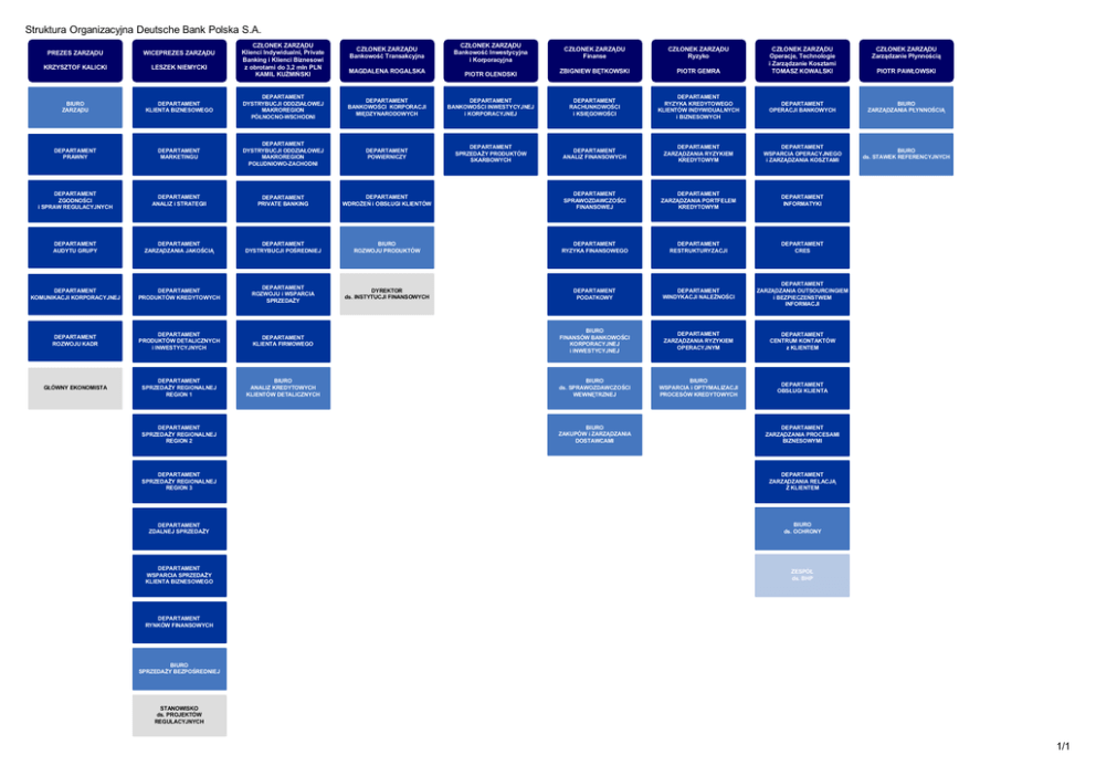 Struktura Organizacyjna Deutsche Bank Polska S.A. PREZES ZARZ DU WICEPREZES ZARZ DU KRZYSZTOF KALICKI LESZEK NIEMYCKI CZ ONEK ZARZ DU Klienci Indywidualni, Private Banking i Klienci Biznesowi z obrotami do 3,2 mln PLN KAMIL KU MI SKI CZ ONEK ZARZ DU Bankowo Transakcyjna MAGDALENA ROGALSKA CZ ONEK ZARZ DU Bankowo Inwestycyjna i Korporacyjna PIOTR OLENDSKI CZ ONEK ZARZ DU Finanse CZ ONEK ZARZ DU Ryzyko ZBIGNIEW B TKOWSKI PIOTR GEMRA CZ ONEK ZARZ DU Operacje, Technologie i Zarz dzanie Kosztami TOMASZ KOWALSKI CZ ONEK ZARZ DU Zarz dzanie P ynno ci BIURO ZARZ DZANIA P YNNO CI BIURO ZARZ DU DEPARTAMENT KLIENTA BIZNESOWEGO DEPARTAMENT DYSTRYBUCJI ODDZIA OWEJ MAKROREGION PÓ NOCNO-WSCHODNI DEPARTAMENT BANKOWO CI KORPORACJI MI DZYNARODOWYCH DEPARTAMENT BANKOWO CI INWESTYCYJNEJ i KORPORACYJNEJ DEPARTAMENT RACHUNKOWO CI i KSI GOWO CI DEPARTAMENT RYZYKA KREDYTOWEGO KLIENTÓW INDYWIDUALNYCH i BIZNESOWYCH DEPARTAMENT OPERACJI BANKOWYCH DEPARTAMENT PRAWNY DEPARTAMENT MARKETINGU DEPARTAMENT DYSTRYBUCJI ODDZIA OWEJ MAKROREGION PO UDNIOWO-ZACHODNI DEPARTAMENT POWIERNICZY DEPARTAMENT SPRZEDA Y PRODUKTÓW SKARBOWYCH DEPARTAMENT ANALIZ FINANSOWYCH DEPARTAMENT ZARZ DZANIA RYZYKIEM KREDYTOWYM DEPARTAMENT WSPARCIA OPERACYJNEGO i ZARZ DZANIA KOSZTAMI DEPARTAMENT ZGODNO CI i SPRAW REGULACYJNYCH DEPARTAMENT ANALIZ i STRATEGII DEPARTAMENT PRIVATE BANKING DEPARTAMENT SPRAWOZDAWCZO CI FINANSOWEJ DEPARTAMENT ZARZ DZANIA PORTFELEM KREDYTOWYM DEPARTAMENT INFORMATYKI DEPARTAMENT AUDYTU GRUPY DEPARTAMENT ZARZ DZANIA JAKO CI WDRO DEPARTAMENT i OBS UGI KLIENTÓW DEPARTAMENT DYSTRYBUCJI PO REDNIEJ BIURO ROZWOJU PRODUKTÓW DEPARTAMENT RYZYKA FINANSOWEGO DEPARTAMENT RESTRUKTURYZACJI DEPARTAMENT CRES DYREKTOR ds. INSTYTUCJI FINANSOWYCH DEPARTAMENT PODATKOWY DEPARTAMENT WINDYKACJI NALE NO CI DEPARTAMENT ZARZ DZANIA OUTSOURCINGIEM i BEZPIECZE STWEM INFORMACJI DEPARTAMENT KOMUNIKACJI KORPORACYJNEJ DEPARTAMENT PRODUKTÓW KREDYTOWYCH DEPARTAMENT ROZWOJU i WSPARCIA SPRZEDA Y DEPARTAMENT ROZWOJU KADR DEPARTAMENT PRODUKTÓW DETALICZNYCH i INWESTYCYJNYCH DEPARTAMENT KLIENTA FIRMOWEGO BIURO FINANSÓW BANKOWO CI KORPORACYJNEJ i INWESTYCYJNEJ DEPARTAMENT ZARZ DZANIA RYZYKIEM OPERACYJNYM DEPARTAMENT CENTRUM KONTAKTÓW z KLIENTEM DEPARTAMENT SPRZEDA Y REGIONALNEJ REGION 1 BIURO ANALIZ KREDYTOWYCH KLIENTÓW DETALICZNYCH BIURO ds. SPRAWOZDAWCZO CI WEWN TRZNEJ BIURO WSPARCIA i OPTYMALIZACJI PROCESÓW KREDYTOWYCH DEPARTAMENT OBS UGI KLIENTA ÓWNY EKONOMISTA DEPARTAMENT SPRZEDA Y REGIONALNEJ REGION 2 DEPARTAMENT SPRZEDA Y REGIONALNEJ REGION 3 BIURO ZAKUPÓW i ZARZ DZANIA DOSTAWCAMI PIOTR PAW OWSKI BIURO ds. STAWEK REFERENCYJNYCH DEPARTAMENT ZARZ DZANIA PROCESAMI BIZNESOWYMI DEPARTAMENT ZARZ DZANIA RELACJ Z KLIENTEM DEPARTAMENT ZDALNEJ SPRZEDA Y BIURO ds. OCHRONY DEPARTAMENT WSPARCIA SPRZEDA Y KLIENTA BIZNESOWEGO ZESPÓ ds. BHP DEPARTAMENT RYNKÓW FINANSOWYCH BIURO SPRZEDA Y BEZPO REDNIEJ STANOWISKO ds. PROJEKTÓW REGULACYJNYCH 1/1