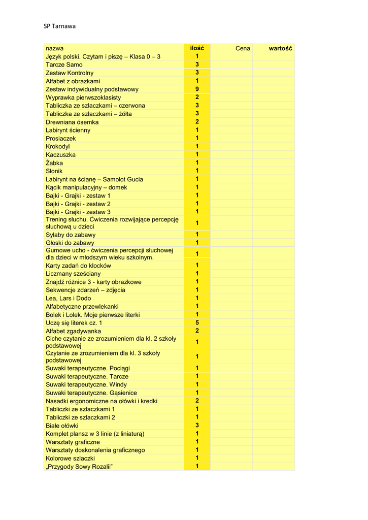 SP Tarnawa nazwa Język polski. Czytam i piszę – Klasa 0 – 3 Tarcze Samo Zestaw Kontrolny Alfabet z obrazkami Zestaw indywidualny podstawowy Wyprawka pierwszoklasisty Tabliczka ze szlaczkami – czerwona Tabliczka ze szlaczkami – żółta Drewniana ósemka Labirynt ścienny Prosiaczek Krokodyl Kaczuszka Żabka Słonik Labirynt na ścianę – Samolot Gucia Kącik manipulacyjny – domek Bajki - Grajki - zestaw 1 Bajki - Grajki - zestaw 2 Bajki - Grajki - zestaw 3 Trening słuchu. Ćwiczenia rozwijające percepcję słuchową u dzieci Sylaby do zabawy Głoski do zabawy Gumowe ucho - ćwiczenia percepcji słuchowej dla dzieci w młodszym wieku szkolnym. Karty zadań do klocków Liczmany sześciany Znajdź różnice 3 - karty obrazkowe Sekwencje zdarzeń – zdjęcia Lea, Lars i Dodo Alfabetyczne przewlekanki Bolek i Lolek. Moje pierwsze literki Uczę się literek cz. 1 Alfabet zgadywanka Ciche czytanie ze zrozumieniem dla kl. 2 szkoły podstawowej Czytanie ze zrozumieniem dla kl. 3 szkoły podstawowej Suwaki terapeutyczne. Pociągi Suwaki terapeutyczne. Tarcze Suwaki terapeutyczne. Windy Suwaki terapeutyczne. Gąsienice Nasadki ergonomiczne na ołówki i kredki Tabliczki ze szlaczkami 1 Tabliczki ze szlaczkami 2 Białe ołówki Komplet plansz w 3 linie (z liniaturą) Warsztaty graficzne Warsztaty doskonalenia graficznego Kolorowe szlaczki „Przygody Sowy Rozalii” ilość 1 3 3 1 9 2 3 3 2 1 1 1 1 1 1 1 1 1 1 1 1 1 1 1 1 1 1 1 1 1 1 5 2 1 1 1 1 1 1 2 1 1 3 1 1 1 1 1 Cena wartość SP Tarnawa Ćwiczenia grafomotoryczne Cyferki i szlaczki. Ćwiczenia grafomotoryczne usprawniające rękę piszącą. Owoce, warzywa i szlaczki. Ćwiczenia grafomotoryczne usprawniające rękę piszącą. Zwierzaczki i szlaczki. Ćwiczenia grafomotoryczne usprawniające rękę piszącą. Lewa ręka rysuje i pisze cz. 1 Lewa ręka rysuje i pisze cz. 2 Lewa ręka rysuje i pisze cz. 3 Ortograficzne kwiatki Skarbczyk gramatyczno-ortograficzny Reksio i ortografia Detektyw ortografek EduRom gry edukacyjne matematyka pierwsze odkrycia EduRom gra matematyczna Wesołe misateczko EduRom gra matematyczna ZOO EduRom gry edukacyjne matematyka Wyspa skarbów EduRom gra matematyczna Fabryka zabawek EduRom gra matematyczna Stare zamczysko EduRom gra matematyczna Niezwykłe wakacje Sześciany Geo Zestaw matematyczny z kartami zadań Figury i kształty - układanka z kartami zadań Mozaika w drewnianym pudełku Obrazkowe rytmy Klocki fantazja Kolorowe cegiełki Logiczna układanka - Zabawki Logiczna układanka - Transport Logiczne układanki Pszczółka – robot Ulica – mata Sześciany Łuki i Koła Sześciany Ocean Sześciany Las Liczmany żetony Patyczki do liczenia Liczmany ogniwa Kostki systemu dziesiętnego Klocki matematyczne Duże liczydło na stojaku Zestaw do nauki liczenia w zakresie 1-10 Kołeczki i cyferki Bingo. Nauka cyfr od 1 do 10. Waga matematyczna Bawmy się liczbami - magnetyczne plansze Przekraczanie progu 10 go - plansze Liczmany magnetyczne Aktywna mata - czas Małe zegary edukacyjne 1 1 1 1 1 1 1 1 3 1 1 1 1 1 1 1 1 1 1 1 1 2 1 1 2 1 1 1 1 1 1 1 1 5 1 5 3 3 2 3 3 1 3 1 3 3 1 5 SP Tarnawa Mini zegar Zegar i kalendarz Zegar stojący Miesiące i pory roku Kalendarz Czas i zegar Tunel prosty Tunel zyg-zag Kolorowa Rzeka Kamienie rzeczne Stożek utrzymaj równowagę Rehabilitacyjny bączek baza wysoka Baza mała półkoło Belka cienka Materac mały Materac płaski – kształtki rehabilitacyjne Materac szkolny – kształtki rehabilitacyjne Dyski z fakturami 1 Dyski z fakturami 2 Sensoryczne kamienie Dysk sensoryczny Woreczki z grochem Wyrzutnia Worki do skakania Stolik szkolny Krzesło szkolne Tablica korkowa 5 3 1 1 1 1 1 1 1 1 5 1 2 2 1 1 3 4 4 1 1 2 4 5 3 9 6 12 1 Papier do wydruków czarnobiałych i kopiowania 2 80gr/m 500A4 5 Długopis 40 Zeszyty w kratkę 32kartki Zeszyty w trzy linie Ołówki 40 40 40