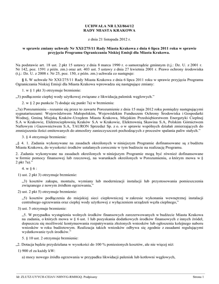 UCHWAŁA NR LXI/864/12 RADY MIASTA KRAKOWA z dnia 21 listopada 2012 r. w sprawie zmiany uchwały Nr XXI/275/11 Rady Miasta Krakowa z dnia 6 lipca 2011 roku w sprawie przyjęcia Programu Ograniczania Niskiej Emisji dla Miasta Krakowa. Na podstawie art. 18 ust. 2 pkt 15 ustawy z dnia 8 marca 1990 r. o samorządzie gminnym (t.j.: Dz. U. z 2001 r. Nr 142, poz. 1591 z późn. zm.) oraz art. 403 ust. 5 ustawy z dnia 27 kwietnia 2001 r. Prawo ochrony środowiska (t.j.: Dz. U. z 2008 r. Nr 25, poz. 150, z późn. zm.) uchwala co następuje: § 1. W uchwale Nr XXI/275/11 Rady Miasta Krakowa z dnia 6 lipca 2011 roku w sprawie przyjęcia Programu Ograniczania Niskiej Emisji dla Miasta Krakowa wprowadza się następujące zmiany: 1. w § 1 pkt 3) otrzymuje brzmienie: „3) podłączenie ciepłej wody użytkowej związane z likwidacją palenisk węglowych.” 2. w § 2 po punkcie 7) dodaje się punkt 7a) w brzmieniu: „7a) Porozumieniu - rozumie się przez to zawarte Porozumienie z dnia 15 maja 2012 roku pomiędzy następującymi sygnatariuszami: Województwem Małopolskim, Wojewódzkim Funduszem Ochrony Środowiska i Gospodarki Wodnej, Gminą Miejską Kraków-Urzędem Miasta Krakowa, Miejskim Przedsiębiorstwem Energetyki Cieplnej S.A w Krakowie, Elektrociepłownią Kraków S.A w Krakowie, Elektrownią Skawina S.A, Polskim Górnictwem Naftowym i Gazownictwem S.A, TAURON Sprzedaż Sp. z o. o w sprawie wspólnych działań zmierzających do zmniejszenia ilości emitowanych do atmosfery zanieczyszczeń pochodzących z procesów spalania paliw stałych.” 3. § 4 otrzymuje brzmienie: „§ 4. 1. Zadania wykonywane na zasadach określonych w niniejszym Programie dofinansowane są z budżetu Miasta Krakowa, do wysokości środków ustalanych corocznie w tym budżecie na realizację Programu. 2. Zadania wykonywane na zasadach określonych w niniejszym Programie mogą być również dofinansowane w formie pomocy finansowej lub rzeczowej, na warunkach określonych w Porozumieniu, o którym mowa w § 2 pkt 7a).” 4. w § 6 : 1) ust. 2 pkt 3) otrzymuje brzmienie: „3) kosztów zakupu, montażu, wymiany lub modernizacji instalacji lub przystosowania pomieszczenia związanego z nowym źródłem ogrzewania,” 2) ust. 2 pkt 5) otrzymuje brzmienie: „5) kosztów podłączenia do miejskiej sieci ciepłowniczej w zakresie wykonania wewnętrznej instalacji centralnego ogrzewania oraz ciepłej wody użytkowej z wyłączeniem urządzeń węzła cieplnego,” 3) ust. 5 otrzymuje brzmienie: „5. W przypadku wystąpienia wolnych środków finansowych zarezerwowanych w budżecie Miasta Krakowa na zadania, o których mowa w § 6 ust. 1 lub pozyskania dodatkowych środków finansowych z innych źródeł, dopuszcza się możliwość kontynuowania rozpatrywania złożonych wniosków lub ogłoszenia kolejnego naboru wniosków w roku budżetowym. Realizacja takich wniosków odbywa się zgodnie z zasadami regulującymi wydatkowanie tych środków.” 5. § 10 ust. 2 otrzymuje brzmienie: „2. Dotacja będzie przydzielana w wysokości do 100 % poniesionych kosztów, ale nie więcej niż: 1) 900 zł za każdy kW: a) mocy nowego źródła ogrzewania w przypadku likwidacji palenisk lub kotłowni węglowych, ————————————————————————————————————————————————————————— Id: ZLUTZ-UYYCH-CEIAV-NHNYG-RMHGQ. Podpisany Strona 1 b) mocy nowego źródła centralnej ciepłej wody użytkowej, c) mocy zainstalowanej pompy ciepła, 2) 1 000 zł za każdy metr kwadratowy w przypadku zainstalowania kolektora słonecznego.” 6. § 12 ust. 1 otrzymuje brzmienie: „1. Wzór wniosku o udzielenie dotacji oraz wzór wniosku o rozliczenie dotacji wraz z wykazem niezbędnych dokumentów, które należy dołączyć do nich będzie stanowić załącznik do ogłoszenia o udzieleniu dotacji na dany rok.” 7. § 13 ust. 1 otrzymuje brzmienie: „1. Wnioski rozpatrywane będą według następujących kryteriów: 1) zawarcia umów przyłączeniowych na realizację zadania z sygnatariuszami Porozumienia, o którym mowa § 2 pkt 7a), 2) możliwości korzystania z pomocy, o której mowa w paragrafie 4 ust. 2 Programu, 3) wielkości efektu ekologicznego osiągniętego poprzez realizację zadania, 4) zastosowanego systemu ogrzewania, wg priorytetów określonych w POP, 5) terminu i poprawności złożenia wniosku, 6) realizacji zadania na terenie Osiedla Uzdrowisko Swoszowice, utworzonego w ramach Dzielnicy X Swoszowice, 7) lokalizacji zadania, według priorytetów określonych w POP.” 8. § 18 otrzymuje brzmienie: „§ 18. Dotacja będzie przydzielana w wysokości do 100 % poniesionych kosztów, z zastrzeżeniem zapisów rozporządzenia Rady Ministrów z dnia 13 października 2006 roku w sprawie ustalenia mapy pomocy regionalnej (Dz. U. Nr 190, poz. 1402), ale nie więcej niż: 1) 900 zł za każdy kW: a) mocy nowego źródła ogrzewania w przypadku likwidacji palenisk lub kotłowni węglowych, b) mocy nowego źródła centralnej ciepłej wody użytkowej, c) mocy zainstalowanej pompy ciepła, 2) 1 000 zł za każdy metr kwadratowy w przypadku zainstalowania kolektora słonecznego.” 9. § 20 ust. 1 otrzymuje brzmienie: „ 1. Wzór wniosku o udzielenie dotacji oraz wzór wniosku o rozliczenie dotacji wraz z wykazem niezbędnych dokumentów, które należy dołączyć do nich będzie stanowić załącznik do ogłoszenia o udzieleniu dotacji na dany rok.” 10. § 21 ust. 2 otrzymuje brzmienie: „2. Następujących kryteriów: 1) zawarcia umów przyłączeniowych na realizację zadania z sygnatariuszami Porozumienia, o którym mowa w § 2 pkt 7a), 2) możliwości korzystania z pomocy, o której mowa w paragrafie 4 ust. 2 Programu, 3) wielkości efektu ekologicznego osiągniętego poprzez realizację zadania, 4) zastosowanego systemu ogrzewania, wg priorytetów określonych w POP, 5) terminu i poprawności złożenia wniosku, 6) realizacji zadania 