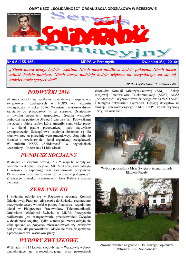 OMPT NSZZ ,,SOLIDARNOŚĆ" ORGANIZACJA ODDZIAŁOWA W RZESZOWIE Nr 4-5 (155-156) MDPS w Przemyślu Kwiecień-Maj 2016r. „Niech nasza droga będzie wspólna. Niech nasza modlitwa będzie pokorna. Niech nasza miłość będzie potężna. Niech nasza nadzieja będzie większa od wszystkiego, co się tej nadziei może sprzeciwiać”. JP II – Częstochowa, 18 czerwca 1983 PODWYŻKI 2016 20 maja odbyło się spotkanie pracodawcy i organizacji związkowych działających w MDPS ws. wzrostu wynagrodzeń w roku 2016. Wcześniej wystosowaliśmy zapytanie do pracodawcy w tej sprawie. Ostatecznie w wyniku negocjacji uzgodniono średnią wysokość podwyżki na poziomie 5% od 1 czerwca br. Podwyżkami nie zostały objęte osoby, które zmieniły stanowisko pracy i w danej grupie pracowniczej mają najwyższe wynagrodzenie. Szczegółowe ustalenia dostępne są dla pracowników za pośrednictwem pracodawcy. Znajdują się również u przedstawicieli danej organizacji związkowej. W imieniu NSZZ „Solidarność” w negocjacjach uczestniczyli Robert Bąk i Lidia Siwak. członków Komisji Międzyzakładowej (KM) i Sekcji Krajowej Pracowników Telekomunikacji (SKPT) NSZZ „Solidarność”. Wybrano również delegatów na WZD SKPT i Kongres Sekretariatu Łączności. Decyzją delegatów na funkcje przewodniczącego KM i SKPT został wybrany Jerzy Iwaszkiewicz. FUNDUSZ SOCJALNY W dniach 28 kwietnia oraz 4, 16 i 25 maja br. odbyły się posiedzenia Komisji Socjalnej MDPS. Komisja rozpatrzyła 1 wniosek o zapomogę oraz zaopiniowała pozytywnie 19 wniosków o dofinansowanie do „wczasów pod gruszą”. Z naszego związku uczestniczyli: Ewa Bałata i Joanna Szabaga. Wybory poprzedziła Msza Święta w intencji zmarłej Elżbiety Pacuły. ZEBRANIE KO 1 kwietnia odbyło się w Rzeszowie zebranie Komisji Oddziałowej. Przyjęto jedną osobę do Związku, rozpatrzono pozytywnie cztery wnioski o pomoc finansową, uzgodniono udział w Pielgrzymce Pracowników Telekomunikacji. Omówiono działalność Związku w MDPS. Pozytywnie realizowane jest zaangażowanie przedstawicieli Związku w działalność socjalną. Tylko w miesiącu marcu odbyło się kilka spotkań ws. pożyczek mieszkaniowych czy „wczasów pod gruszą” dla pracowników. Odbyło się również spotkanie z pracodawcą ws. warunków pracy. WYBORY ZWIĄZKOWE W dniach 14 i 15 kwietnia odbyły się w Warszawie wybory uzupełniające na przewodniczącego oraz pozostałych Złożono wieniec na grobie bł. ks. Jerzego Popiełuszki Patrona NSZZ „Solidarność”. Z naszej organizacji oddziałowej uczestniczyli delegaci: Robert Bąk, Tamara Łabuńska, Marek Bryś, Wojciech Szydłowski, Jan Boczoń. ZEBRANIE KOMISJI MIĘDZYZAKŁADOWEJ 12 maja br. odbyło się w Warszawie spotkanie Komisji Międzyzakładowej OMPT NSZZ „Solidarność”. Omówiono m.in. problemy pracowników Eltel Networks, Orange Polska i firm outsourcingowych. Zapoznano się z przygotowaniem pielgrzymki do Częstochowy i wyborami SIP w OPL i OCS. Na wniosek przewodniczącego Jerzego Iwaszkiewicza, uzupełniono skład prezydium do dziesięciu osób. Komisja wybrała w głosowaniu tajnym: Łukasza Mickiewicza na funkcję zastępcy przewodniczącego, Stanisława Kiezika na funkcję sekretarza, Roberta Bąka i Krzysztofa Kościuka na członków prezydium. Z naszej organizacji oddziałowej w zebraniu uczestniczyli: Robert Bąk, Marek Bryś, Wojciech Szydłowski. PIKNIK WOLNOŚCI I SOLIDARNOŚCI Regionalny Piknik Wolności i Solidarności odbędzie się 3 września 2016 r. w Mielcu. Tak zdecydowali członkowie Zarządu Regionu Rzeszowskiego NSZZ „Solidarność” na posiedzeniu 19 maja 2016r. Jest to następstwo wcześniejszej decyzji o tym, że od 2016 roku obchody powstania NSZZ „Solidarność" będą odbywać się w terenowych strukturach związku, przy czym obchody okrągłych rocznic (40,45, itd.) będą organizowane w Rzeszowie. Obecnie komitet organizacyjny przygotowuje ramowy program regionalnych obchodów powstania NSZZ „Solidarność”, które odbędą się 3 września 2016r. w Mielcu pod nazwą Piknik Wolności i Solidarności. UMOWA NA PIŚMIE PRZED PODJĘCIEM ZATRUDNIENIA Obowiązek pisemnego zawarcia umowy o pracę lub potwierdzenia na piśmie jej warunków przed podjęciem pracy uchwalił w piątek Sejm. Zmiana Kodeksu pracy ma wejść w życie 1 września 2016 r. Do tej pory, zgodnie z prawem umowę o pracę należało potwierdzić pracownikowi w dniu jej podjęcia - czyli do końca tego dnia. Podczas kontroli Państwowej Inspekcji Pracy pracodawcy wskazywali, że osoby, które takiej umowy nie mają, są w pracy pierwszy dzień. Po zmianie, pracodawca i każdy pracujący będzie musiał mieć umowę na piśmie albo na piśmie potwierdzone jej warunki, co będzie jednoznaczne dla służb kontrolujących zatrudnienie. Nowe przepisy ułatwią inspektorom pracy stwierdzanie przypadków nielegalnego zatrudniania pracowników. Eksperci Redagują: Adres do korespondencji: Internet: podkreślają, że nowelizacja nie wyeliminuje całkowicie szarej strefy w zatrudnieniu, ale sprawi, iż powinna się ona zmniejszyć. Projekt nowelizacji przepisów był przedkładany w Sejmie poprzedniej kadencji, jednak nie uzyskał on akceptacji. Teraz za uchwaleniem nowelizacji głosowało 413 posłów, przeciw było dwóch, a jeden wstrzymał się od głosu. red. hd - www.solidarnosc.org.pl ZBIERAMY PODPISY Z inicjatywy Sekretariatu Banków, Handlu i Usług NSZZ „Solidarność” powstał komitet obywatelski, który będzie zbierał podpisy pod projektem ustawy ograniczającej handel w niedziele. Zakaz handlu w niedziele miałby objąć nie tylko 1,5 mln pracowników tej branży, ale także kilkaset tysięcy zleceniodawców. Po złożeniu wniosku odbędzie się w Sejmie pierwsze czytanie, po którym ustawa trafi do komisji sejmowej, gdzie ostatecznie zostanie wypracowany kształt ustawy. Ustawa zakłada liczne wyłączenia dopuszczające handel w niedzielę np. na stacjach benzynow