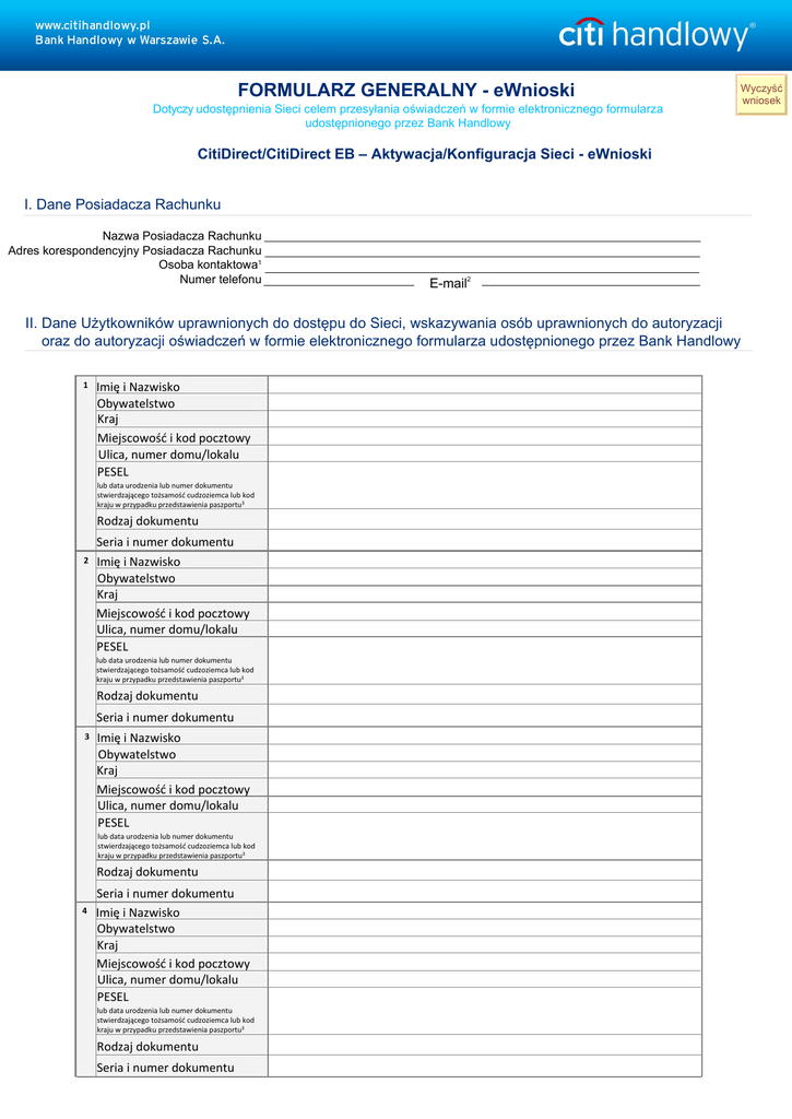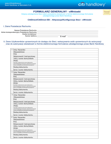 FORMULARZ GENERALNY - eWnioski Dotyczy udostępnienia Sieci celem przesyłania oświadczeń w formie elektronicznego formularza udostępnionego przez Bank Handlowy Wyczyść wniosek CitiDirect/CitiDirect EB – Aktywacja/Konfiguracja Sieci - eWnioski I. Dane Posiadacza Rachunku Nazwa Posiadacza Rachunku Adres korespondencyjny Posiadacza Rachunku Osoba kontaktowa1 Numer telefonu E-mail2 II. Dane Użytkowników uprawnionych do dostępu do Sieci, wskazywania osób uprawnionych do autoryzacji oraz do autoryzacji oświadczeń w formie elektronicznego formularza udostępnionego przez Bank Handlowy 1 Imię i Nazwisko Obywatelstwo Kraj Miejscowość i kod pocztowy Ulica, numer domu/lokalu PESEL lub data urodzenia lub numer dokumentu stwierdzającego tożsamość cudzoziemca lub kod kraju w przypadku przedstawienia paszportu3 Rodzaj dokumentu Seria i numer dokumentu 2 Imię i Nazwisko Obywatelstwo Kraj Miejscowość i kod pocztowy Ulica, numer domu/lokalu PESEL lub data urodzenia lub numer dokumentu stwierdzającego tożsamość cudzoziemca lub kod kraju w przypadku przedstawienia paszportu3 Rodzaj dokumentu Seria i numer dokumentu 3 Imię i Nazwisko Obywatelstwo Kraj Miejscowość i kod pocztowy Ulica, numer domu/lokalu PESEL lub data urodzenia lub numer dokumentu stwierdzającego tożsamość cudzoziemca lub kod kraju w przypadku przedstawienia paszportu3 Rodzaj dokumentu 4 Seria i numer dokumentu Imię i Nazwisko Obywatelstwo Kraj Miejscowość i kod pocztowy Ulica, numer domu/lokalu PESEL lub data urodzenia lub numer dokumentu stwierdzającego tożsamość cudzoziemca lub kod kraju w przypadku przedstawienia paszportu3 Rodzaj dokumentu Seria i numer dokumentu CitiDirect/CitiDirect EB – Aktywacja/Konfiguracja Sieci - eWnioski 5 Imię i Nazwisko Obywatelstwo Kraj Miejscowość i kod pocztowy Ulica, numer domu/lokalu PESEL lub data urodzenia lub numer dokumentu stwierdzającego tożsamość cudzoziemca lub kod kraju w przypadku przedstawienia paszportu3 Rodzaj dokumentu Seria i numer dokumentu 6 Imię i Nazwisko Obywatelstwo Kraj Miejscowość i kod pocztowy Ulica, numer domu/lokalu PESEL lub data urodzenia lub numer dokumentu stwierdzającego tożsamość cudzoziemca lub kod kraju w przypadku przedstawienia paszportu3 Rodzaj dokumentu Seria i numer dokumentu 7 Imię i Nazwisko Obywatelstwo Kraj Miejscowość i kod pocztowy Ulica, numer domu/lokalu PESEL lub data urodzenia lub numer dokumentu stwierdzającego tożsamość cudzoziemca lub kod kraju w przypadku przedstawienia paszportu3 Rodzaj dokumentu 8 Seria i numer dokumentu Imię i Nazwisko Obywatelstwo Kraj Miejscowość i kod pocztowy Ulica, numer domu/lokalu PESEL lub data urodzenia lub numer dokumentu stwierdzającego tożsamość cudzoziemca lub kod kraju w przypadku przedstawienia paszportu3 Rodzaj dokumentu Seria i numer dokumentu Podpis(y) osób upoważnionych, zgodne z reprezentacją / pełnomocnictwem Posiadacza Rachunku Wyczyść wniosek III.Informacje, oświadczenia, zobowiązania 1. Zalecane przez Bank Handlowy jest konstruowanie przez Posiadacza Rachunku schematu autoryzacji w taki sposób, aby konieczne było działanie co najmniej dwóch Użytkowników. 2. Weryfikacja przez Bank Handlowy zakresu umocowania danego Użytkownika odbywa się na podstawie dokumentu/ów w tym w szczególności pełnomocnictw w posiadaniu, którego/ych jest Bank Handlowy każdorazowo po przesłaniu przez Posiadacza Rachunku oświadczenia przesyłanego w formie elektronicznego formularza udostępnionego przez Bank Handlowy. 3. Posiadacz Rachunku oświadcza, że Użytkownicy są należycie umocowani do składania oświadczeń w imieniu Posiadacza Rachunku oraz zobowiązuje się do dostarczania do Banku Handlowego wraz z niniejszym Formularzem Generalnym eWnioski dokumentów potwierdzających ten fakt w tym również w przypadku jakiejkolwiek zmiany osób umocowanych do składania oświadczeń w imieniu Posiadacza Rachunku lub ich danych. 4. Posiadacz Rachunku zobowiązuje się do zachowywania na telekomunikacyjnym urządzeniu końcowym Posiadacza Rachunku (np. komputer) dokumentów przesyłanych do Banku Handlowego w formie elektronicznego formularza udostępnionego przez Bank Handlowy niezwłocznie po zaakceptowaniu przez Bank Handlowy. 5. Bank Handlowy umożliwia Posiadaczowi Rachunku dostęp do przesłanych do Banku Handlowego i zaakceptowanych dokumentów w formie elektronicznego formularza udostępnionego przez Bank Handlowy przez okres wskazany w Instrukcji Użytkownika, o której mowa w pkt. 7 poniżej. Po upływie tego okresu Bank Handlowy udostępni Posiadaczowi Rachunku dokument przesyłany do Banku Handlowego w formie elektronicznego formularza udostępnionego przez Bank Handlowy z zastrzeżeniem obowiązujacych okresów przechowywania dokumentów przez Bank Handlowy oraz możliwości uzależnienia dokonania udostępnienia od dokonania opłaty zgodnie z Taryfą Prowizji i Opłat Bankowych. 6. Posiadacz Rachunku ma możliwość korzystania z alertów, o których mowa w Instrukcji Użytkownika przesyłanych na wskazany adres poczty elektronicznej lub numer telefony komórkowego w przypadku wiadomości tekstowych SMS w związku z czym : a) potwierdza, że został poinformowany, iż: (i) do korzystania z usług świadczonych za pośrednictwem telefonu komórkowego konieczne jest posiadanie telefonu komórkowego wraz z aktywnym numerem umożliwiającego odbiór wiadomości tekstowych SMS, (ii) w przypadkach szczególnych, mających wpływ na bezpieczeństwo lub stabilność systemów informatycznych Banku Handlowego, (iii) Bank Handlowy zastrzega sobie prawo do czasowego zaprzestania lub ograniczenia świadczenia usług elektronicznie w tym również komunikowania się drogą elektroniczną, w szczególności za pośrednictwem poczty elektronicznej lub wiadomości tekstowej SMS, bez wcześniejszego powiadomienia, (iv) do dostępu do alertów uprawniony jest każdy z Użytkowników wymienionych w pkt. II powyżej, do czego Posiadacz Rachunku nin
